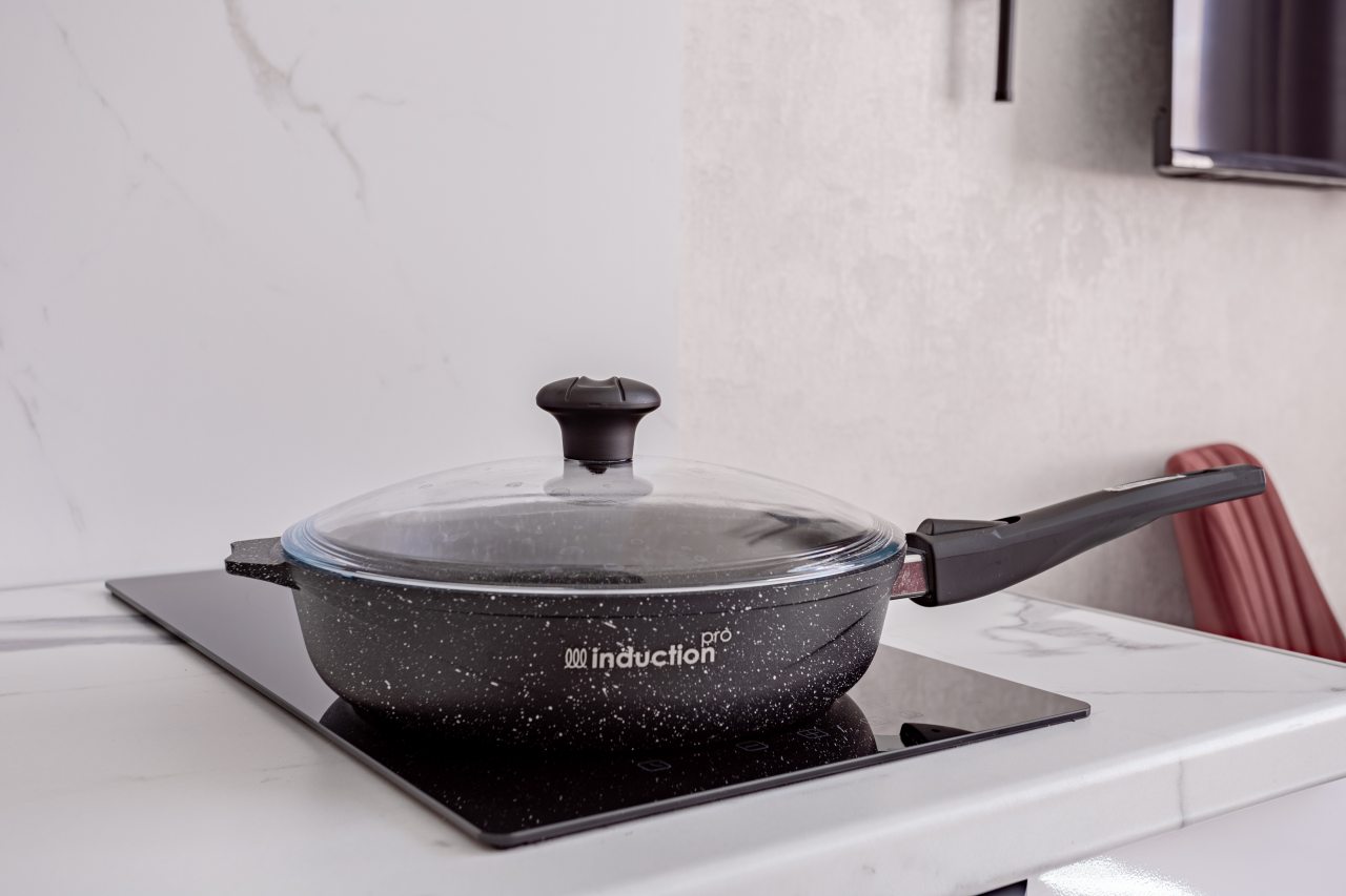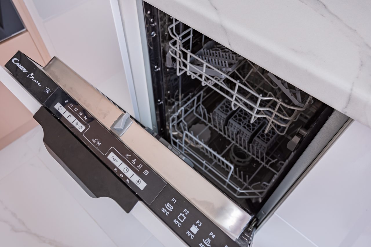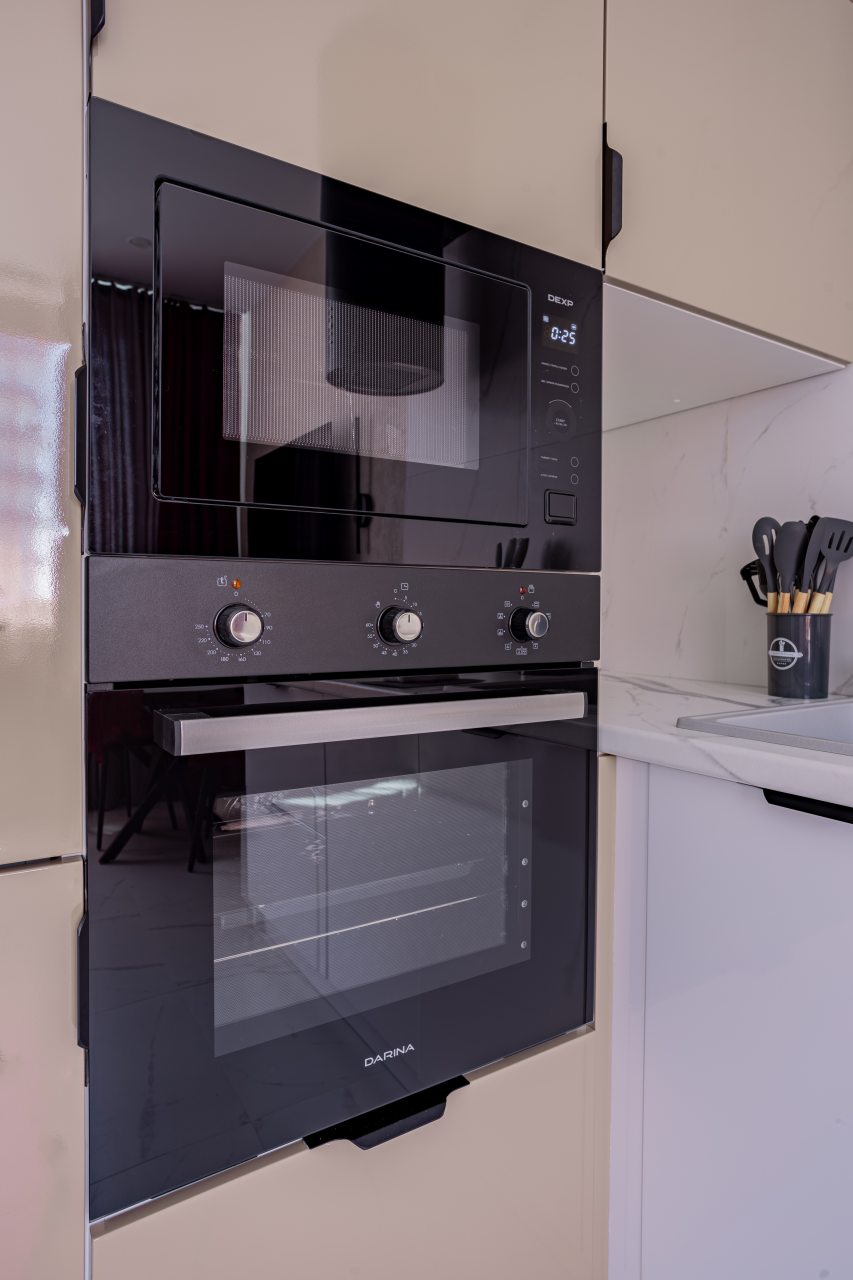 Кухонная зона порадует вас наличием посудомоечной машины, варочной плиты, вытяжки, СВЧ-печи, духового шкафа и всей необходимой для приготовления и сервировки блюд посудой и кухонной утварью.