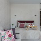 Внутри вы обнаружите не только стильный дизайн, но и двуспальную кровать с мягким изголовьем, удобный диван, ЖК-телевизор, различные световые источники, Wi-Fi, утюг, шкафы, сплит-систему. В санузле предусмотрены средства для личной гигиены, фен, тропический душ.