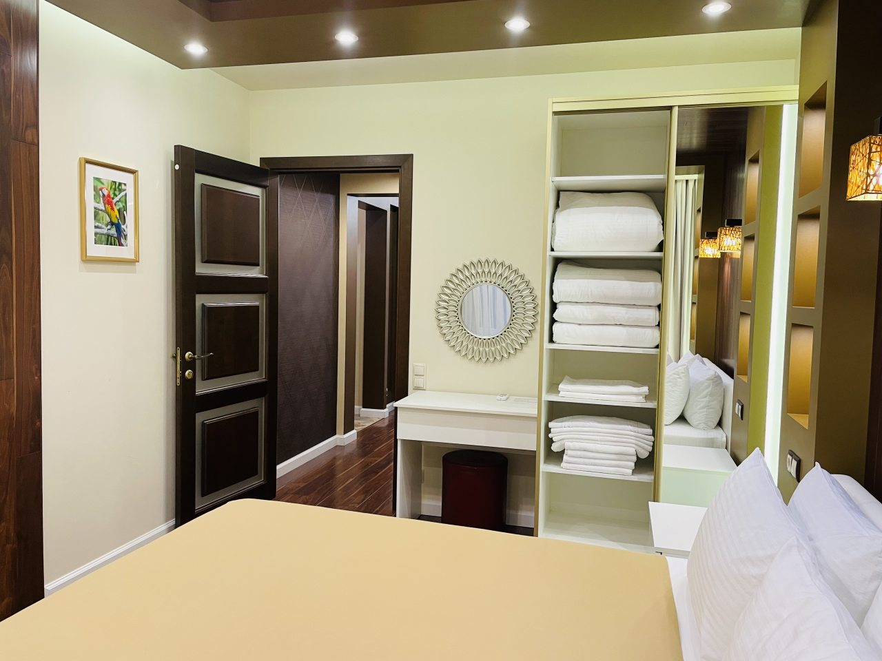 В Сочи решили забронировать квартиру, расположенную почти в центральной части города. Понравился вариант размещения, жили здесь вместе с детьми. Места много, шкафы есть. Хороший запас постельного белья и полотенец присутствует. Ремонт в квартире современный. Понравился интерьер. Для хранения вещей есть и просторная гардеробная. Техника работает. А для тех, кто отдыхает с маленькими детьми, даже есть стульчик для кормления.