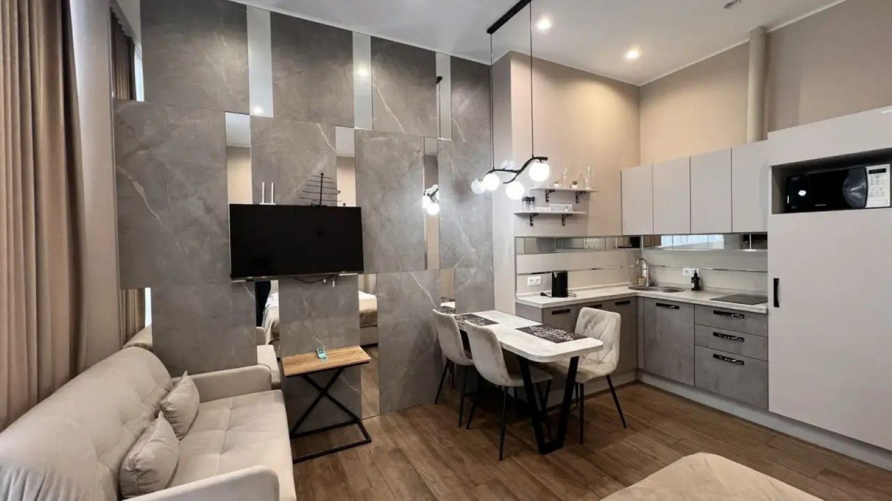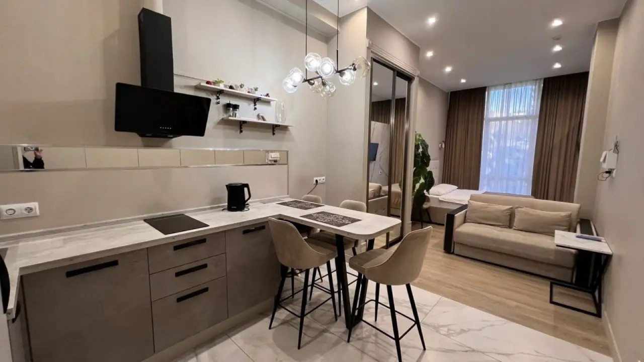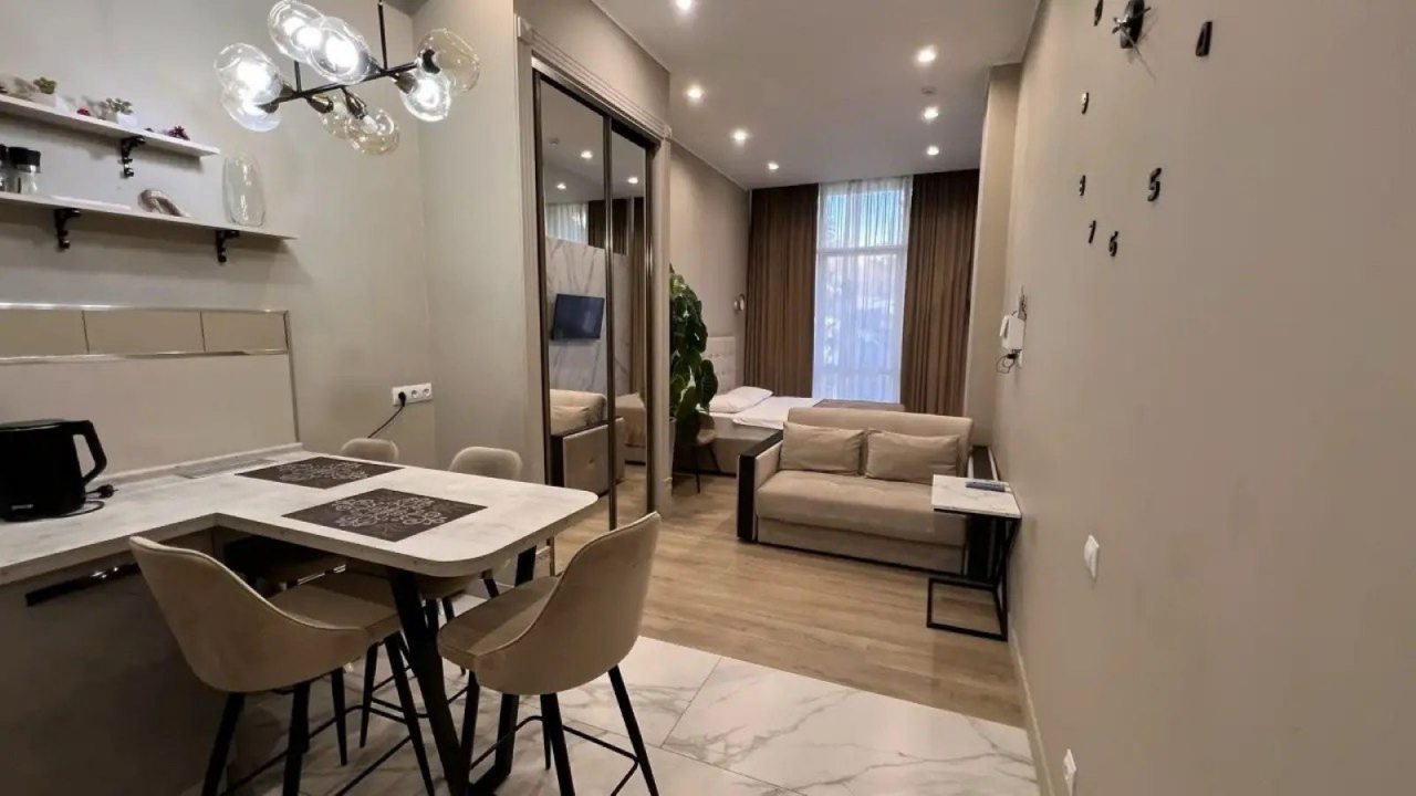 Это полноценная квартира, хоть и небольшая. Находится в красивом стильном доме не так и далеко, по меркам крупного курортного города, месте. Ремонт новый, материалы подобраны со вкусом. Мебель также не убитая, отдыхать и пользоваться было приятно. Есть кухонный уголок, в котором посуда, чайник и т.п. Так что отдых в бытовом плане был комфортный.