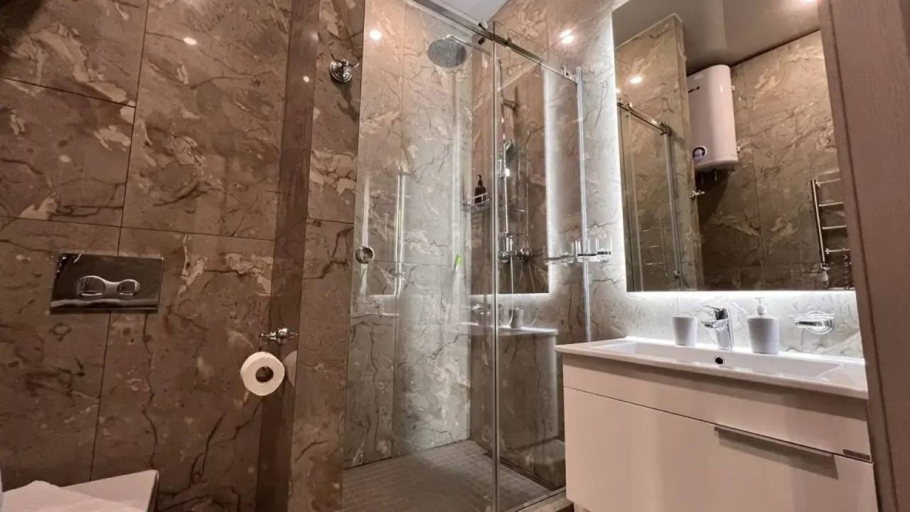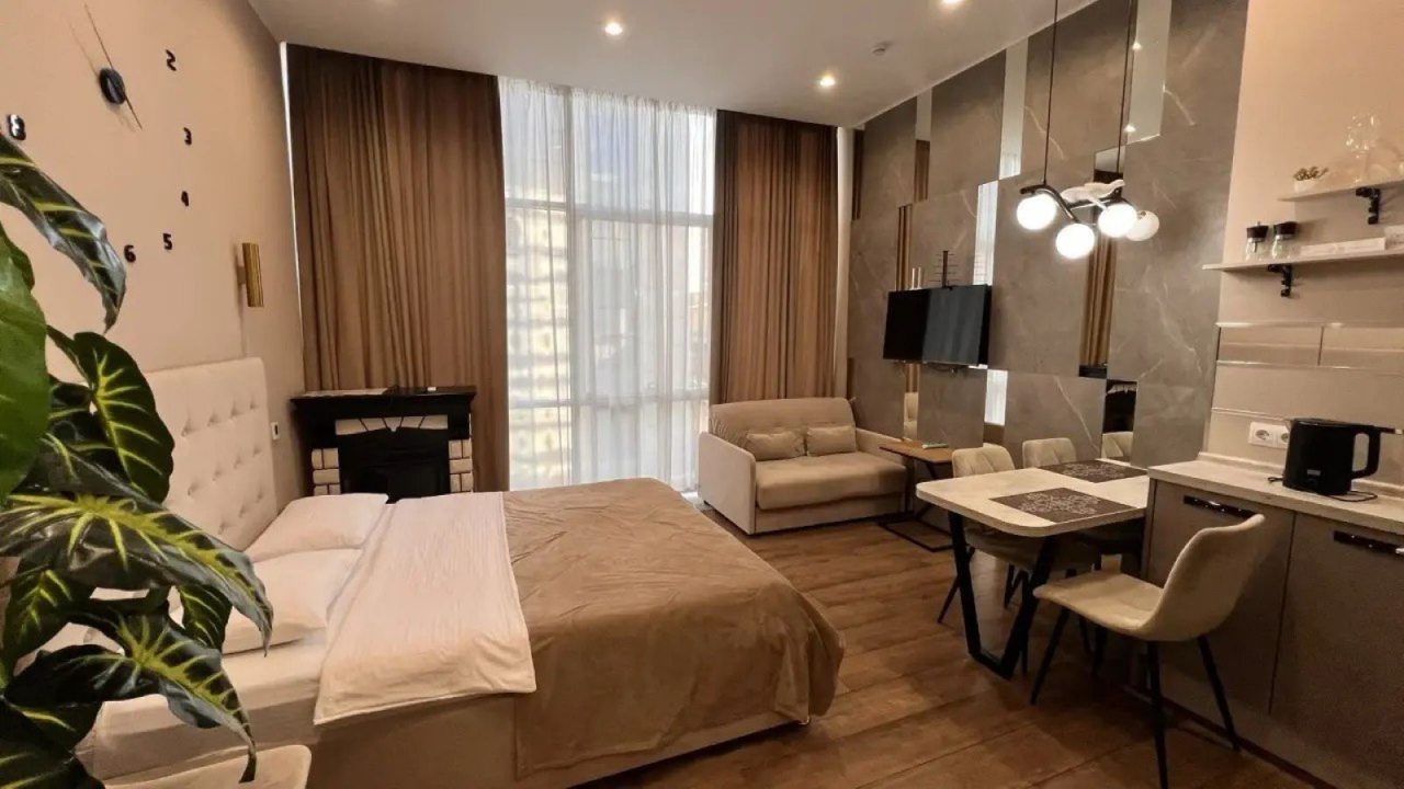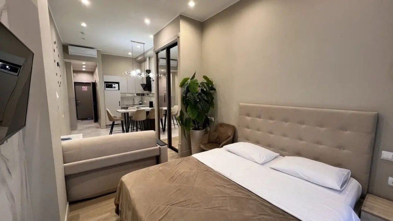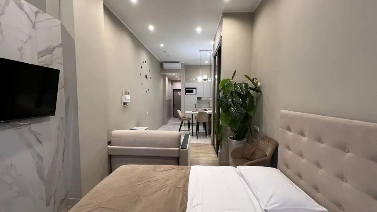 Это полноценная квартира, хоть и небольшая. Находится в красивом стильном доме не так и далеко, по меркам крупного курортного города, месте. Ремонт новый, материалы подобраны со вкусом. Мебель также не убитая, отдыхать и пользоваться было приятно. Есть кухонный уголок, в котором посуда, чайник и т.п. Так что отдых в бытовом плане был комфортный.