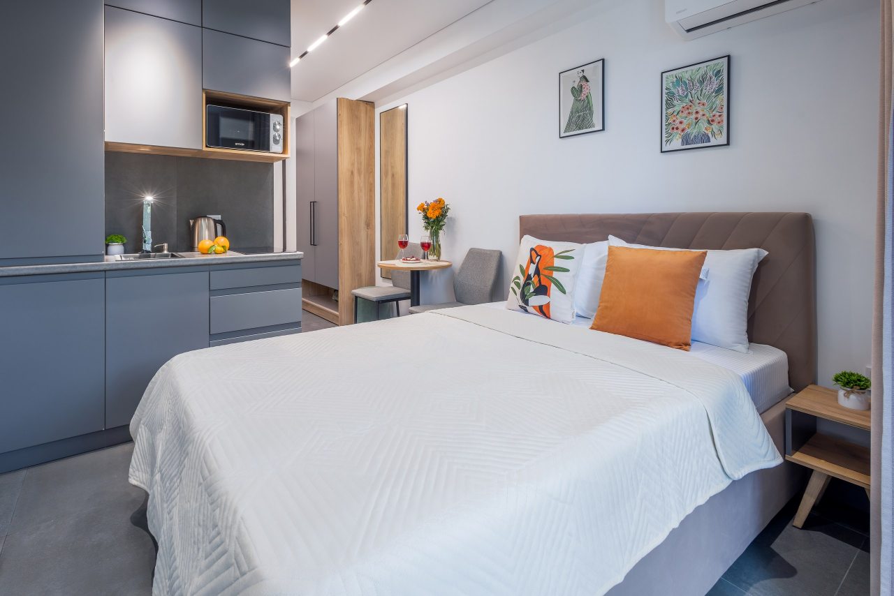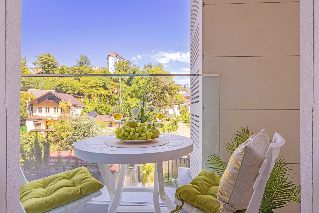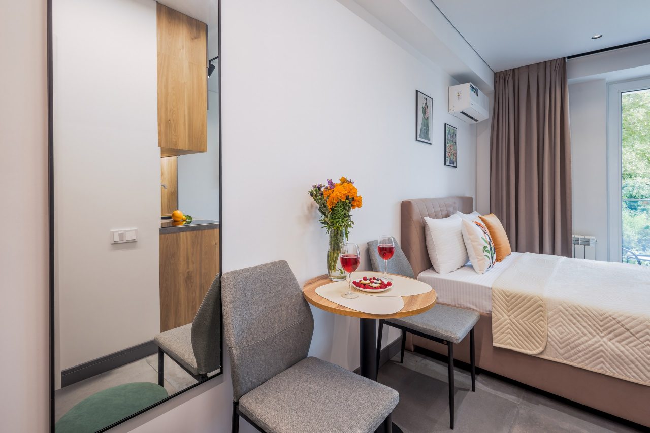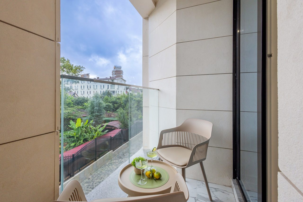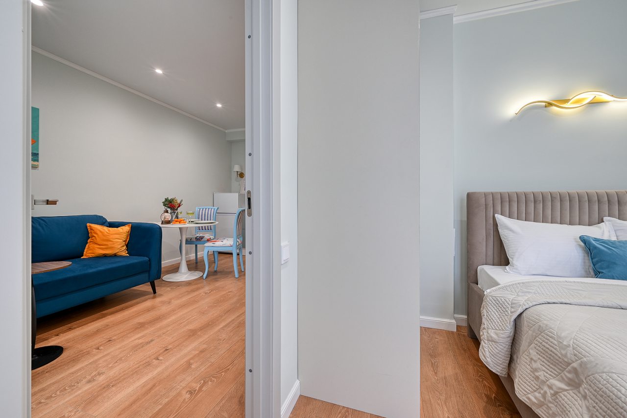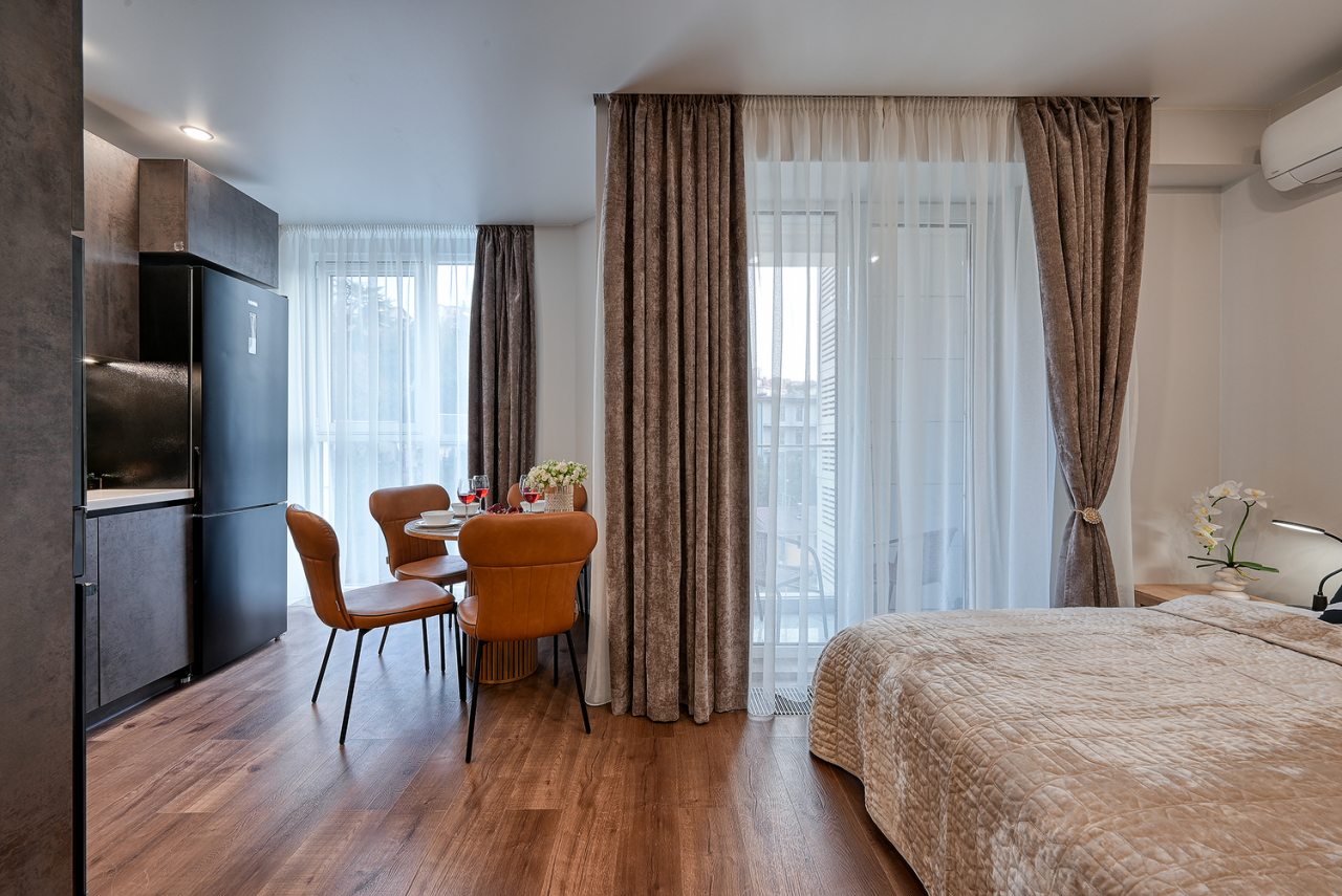 Для проживания предлагаются уютные апартаменты оснащенные удобной двуспальной кроватью, кондиционером, ЖК-телевизором, затемненными шторами, шкафом, кухонной зоной, собственной ванной комнатой и балконом с уличной мебелью. Санузел укомплектован современной сантехникой, стиральной машиной, средствами личной гигиены и феном. Доступна точка высокоскоростного интернета.