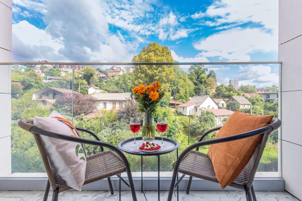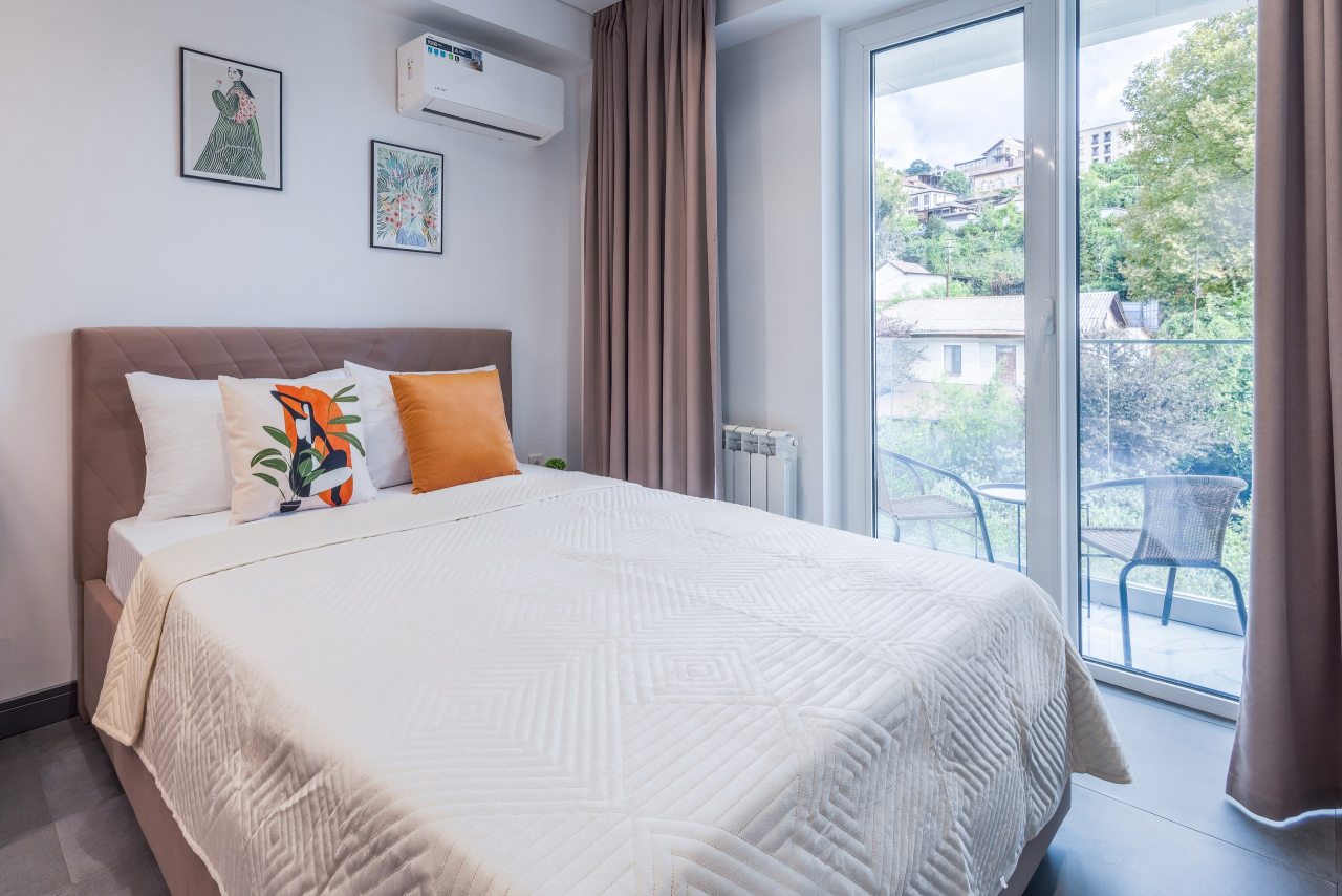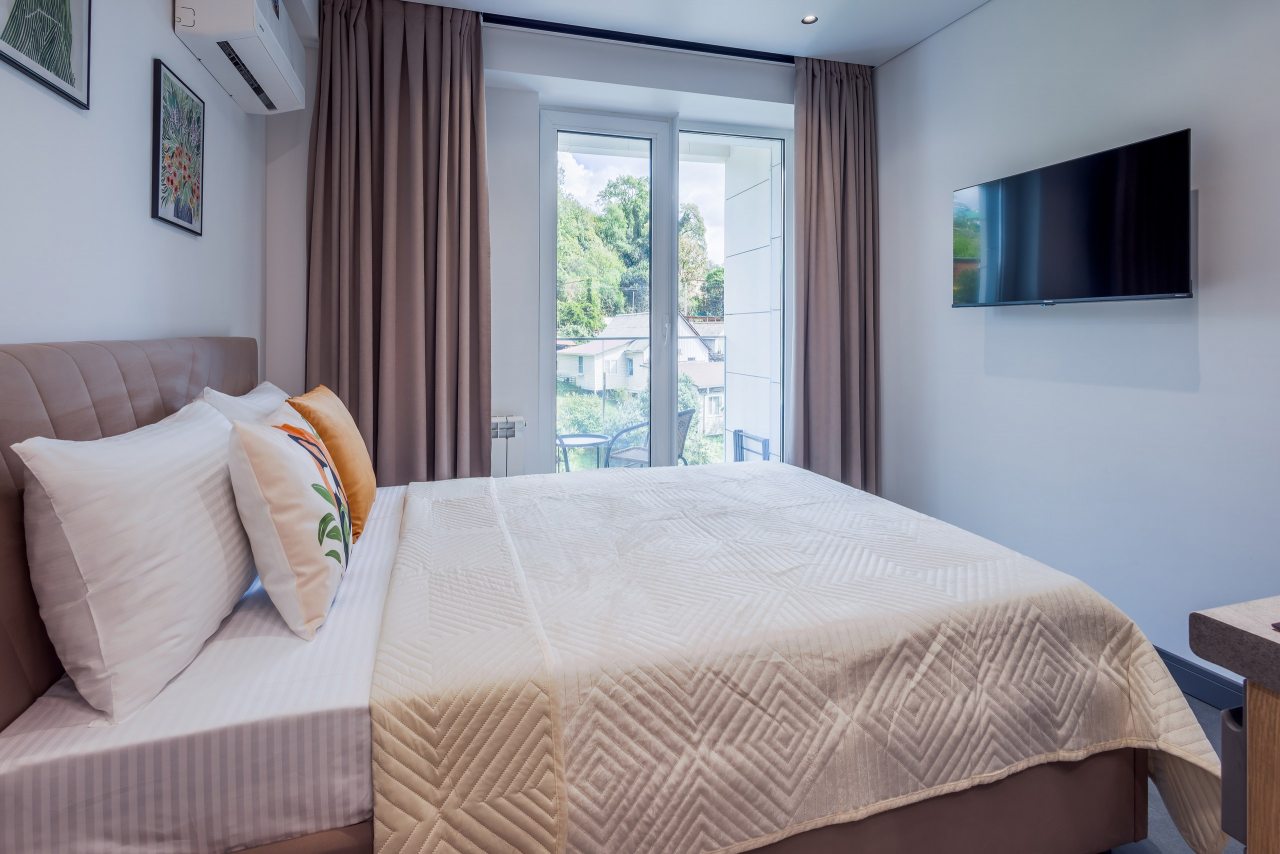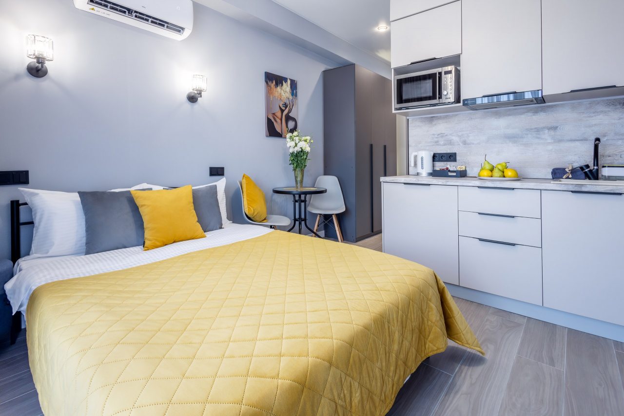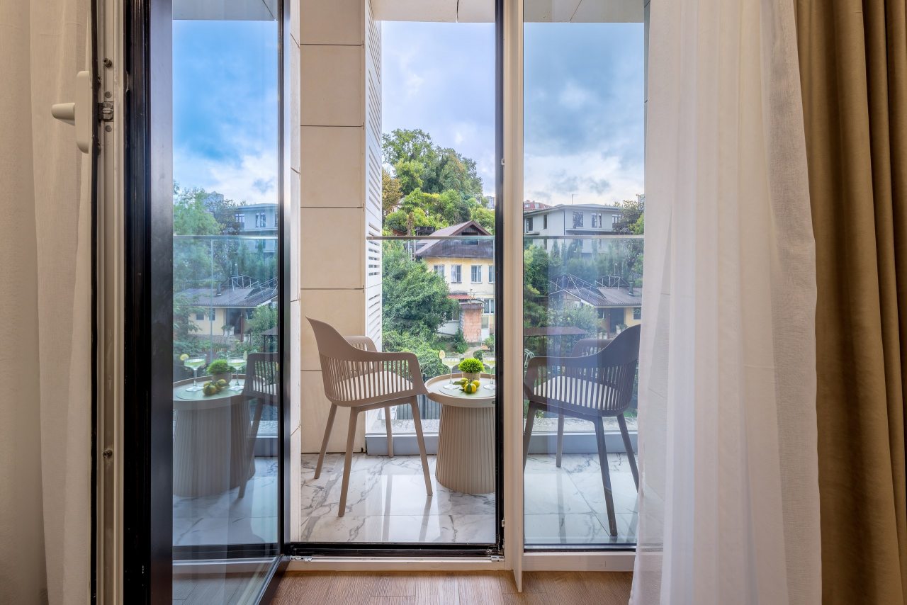 Для проживания предлагаются уютные апартаменты оснащенные удобной двуспальной кроватью, кондиционером, ЖК-телевизором, затемненными шторами, шкафом, кухонной зоной, собственной ванной комнатой и балконом с уличной мебелью. Санузел укомплектован современной сантехникой, стиральной машиной, средствами личной гигиены и феном. Доступна точка высокоскоростного интернета.