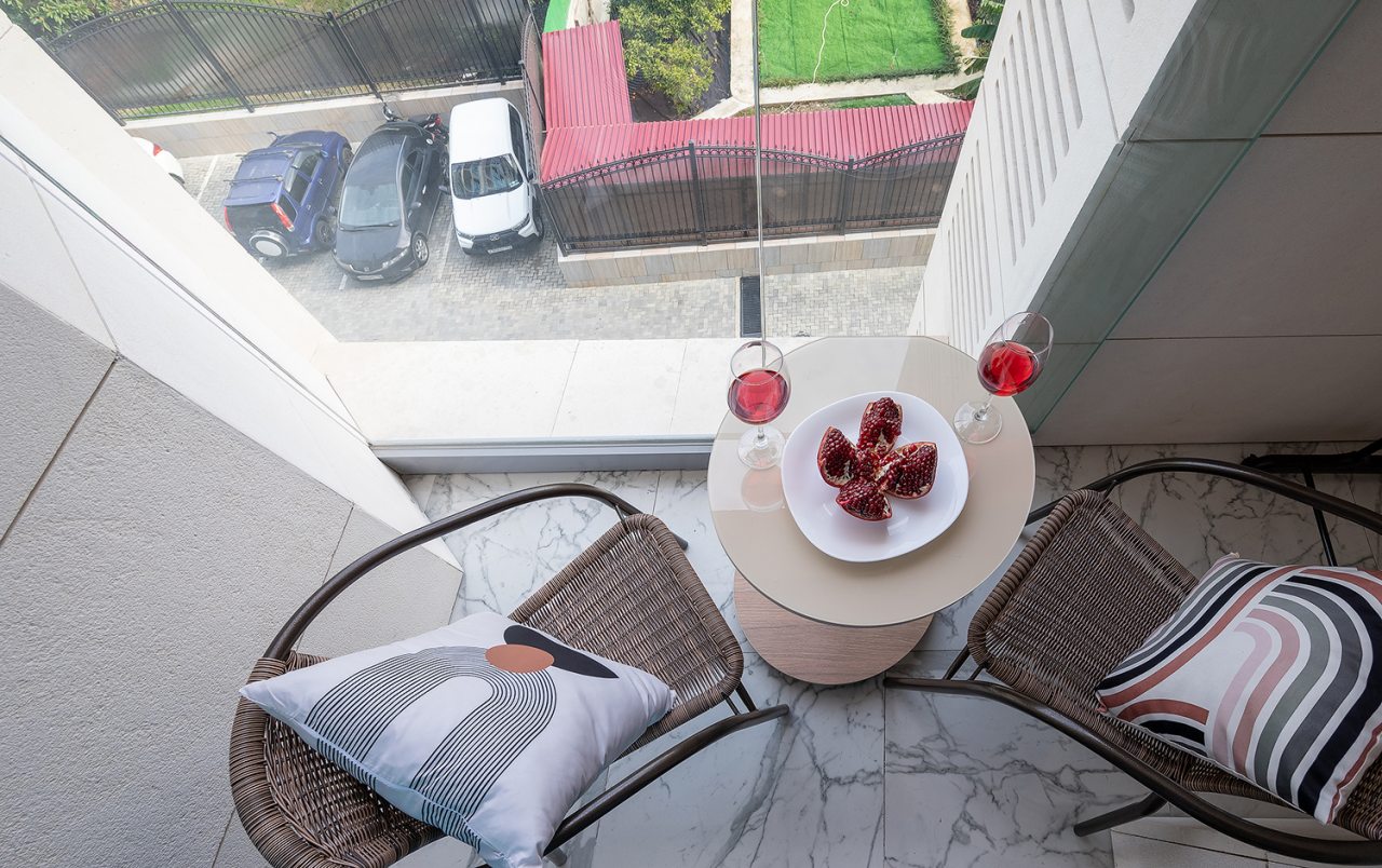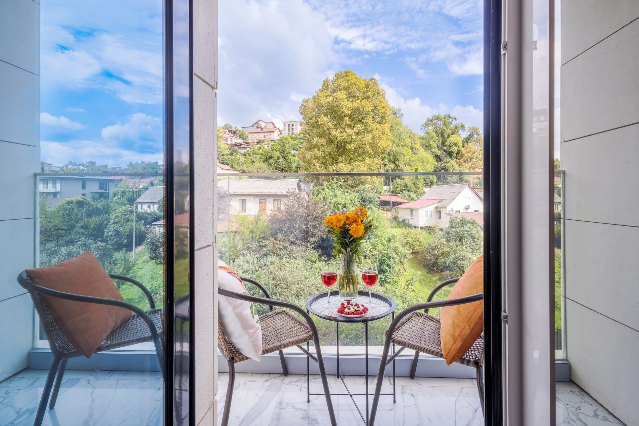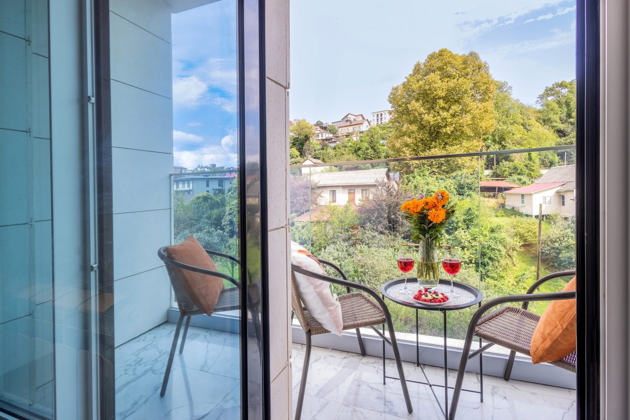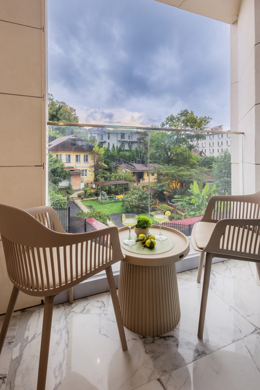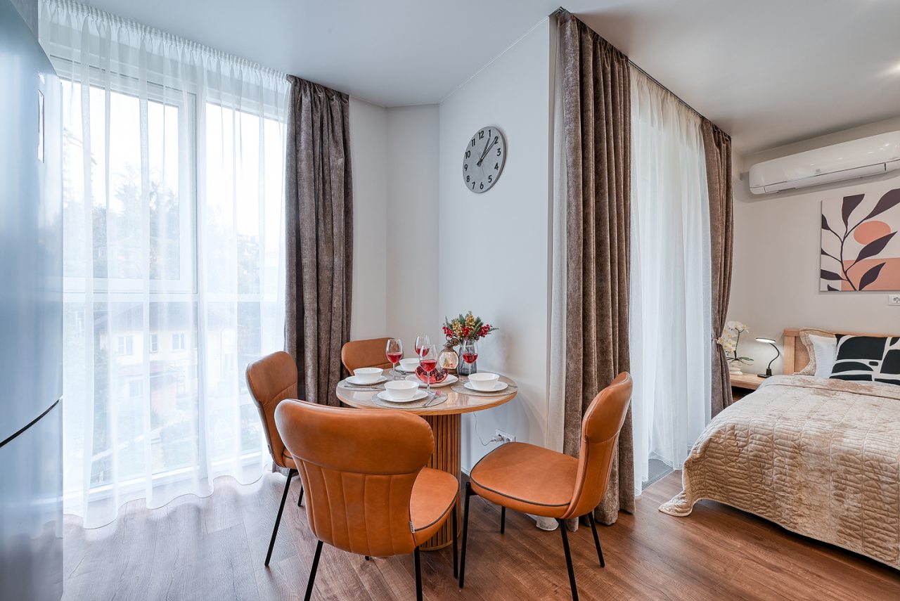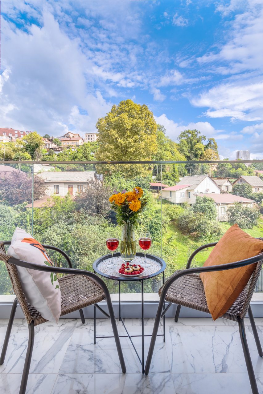 Для проживания предлагаются уютные апартаменты оснащенные удобной двуспальной кроватью, кондиционером, ЖК-телевизором, затемненными шторами, шкафом, кухонной зоной, собственной ванной комнатой и балконом с уличной мебелью. Санузел укомплектован современной сантехникой, стиральной машиной, средствами личной гигиены и феном. Доступна точка высокоскоростного интернета.