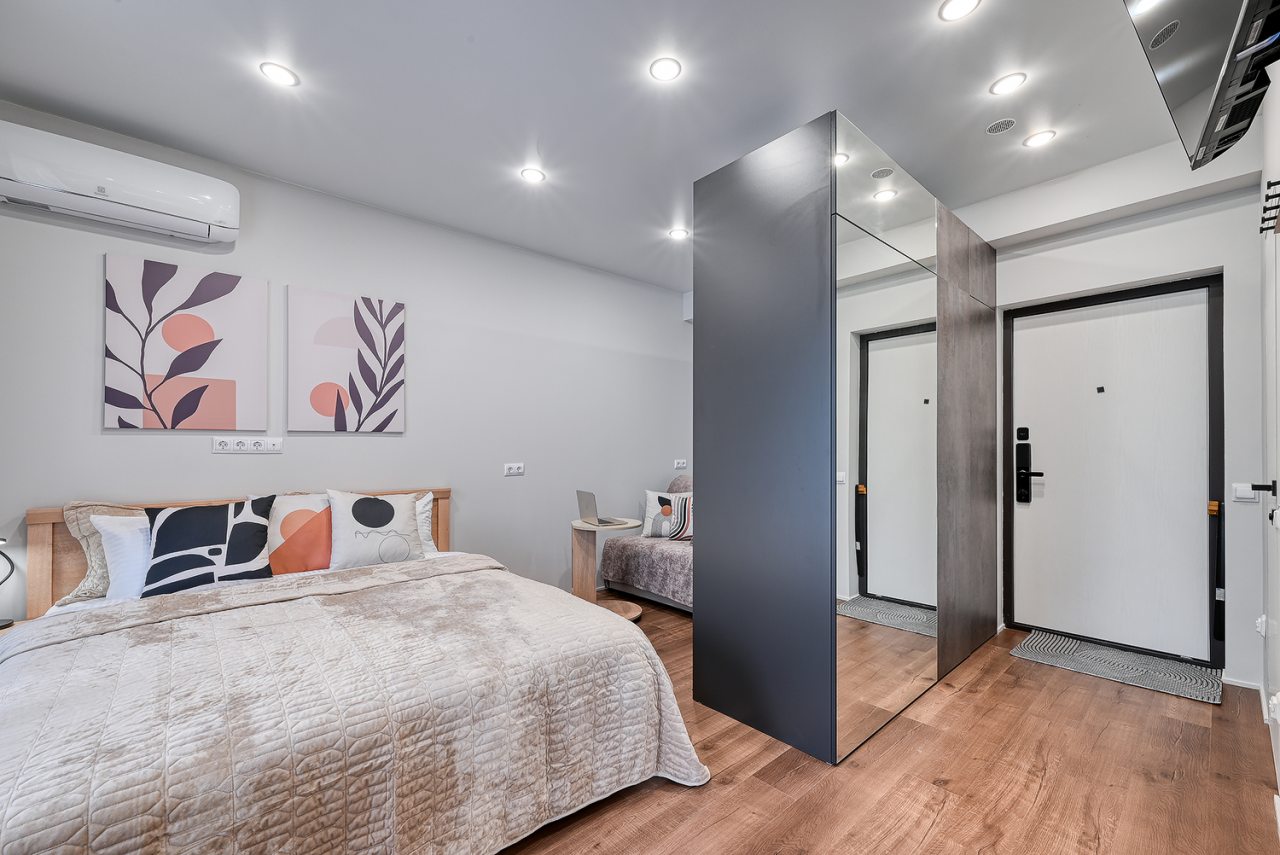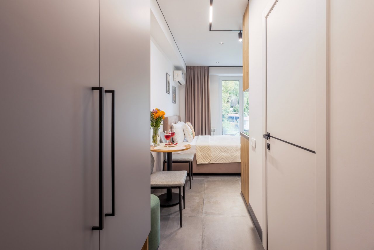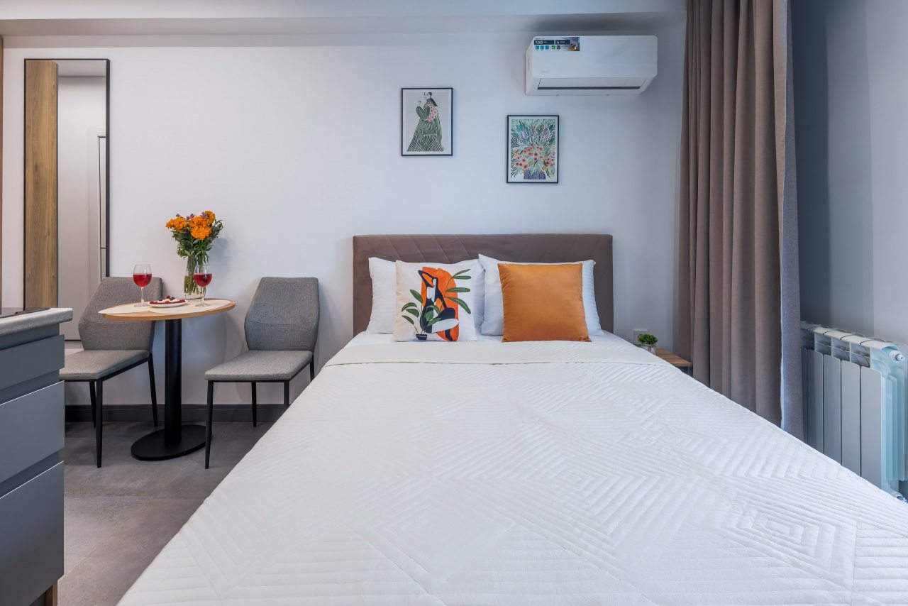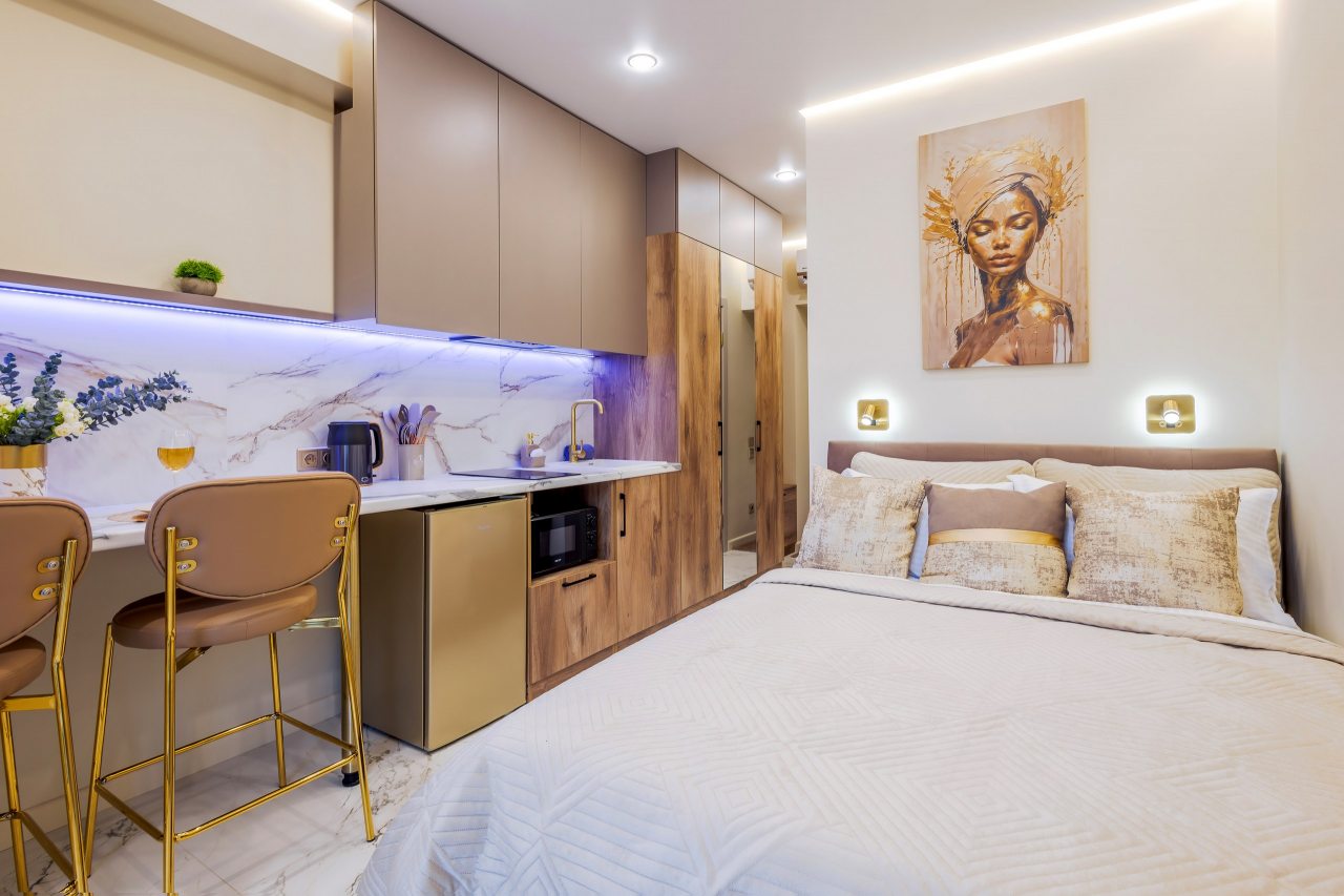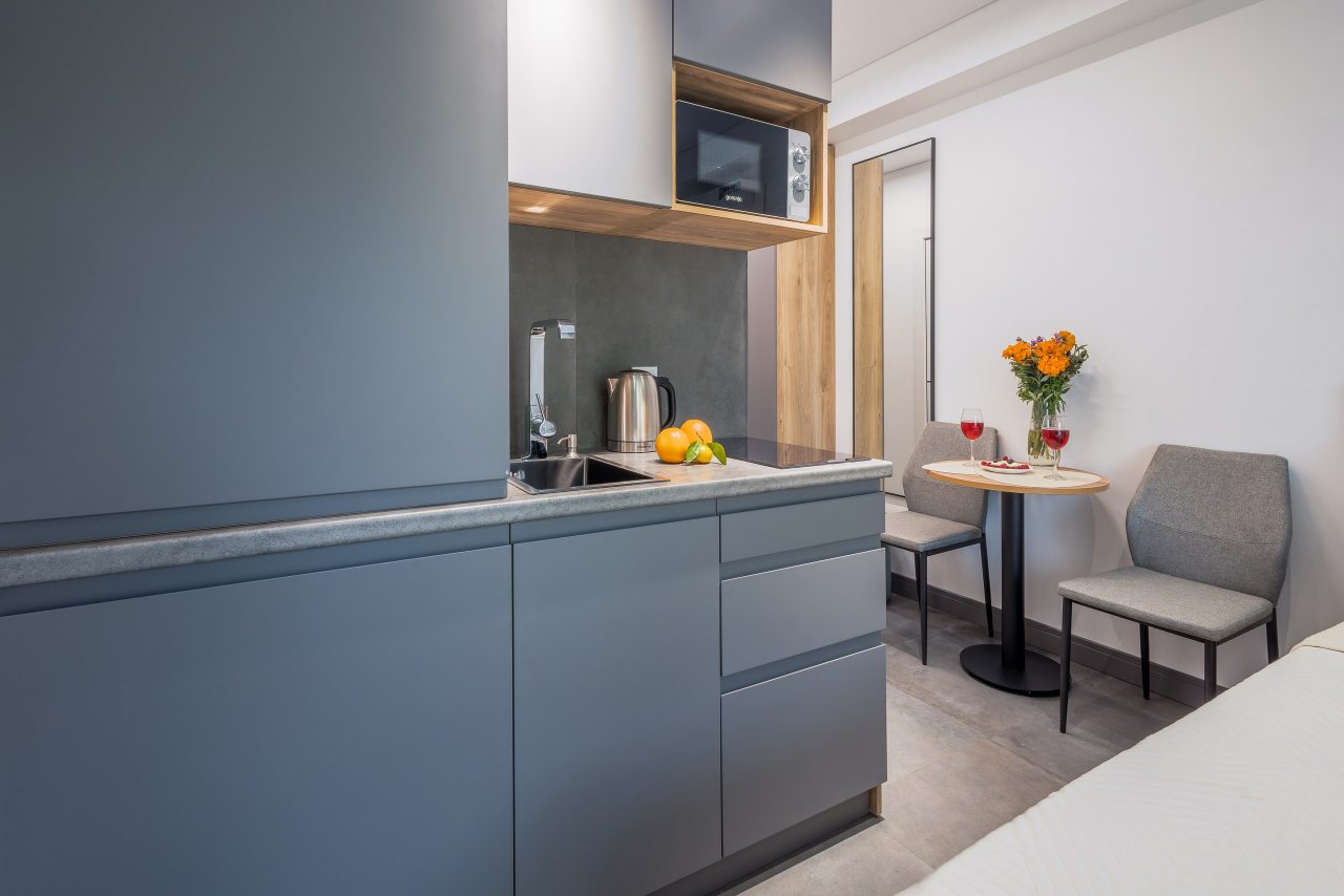 Для проживания предлагаются уютные апартаменты оснащенные удобной двуспальной кроватью, кондиционером, ЖК-телевизором, затемненными шторами, шкафом, кухонной зоной, собственной ванной комнатой и балконом с уличной мебелью. Санузел укомплектован современной сантехникой, стиральной машиной, средствами личной гигиены и феном. Доступна точка высокоскоростного интернета.