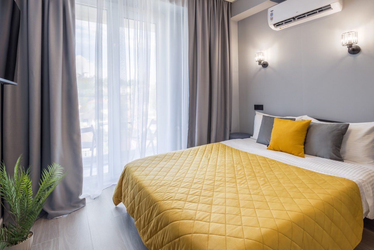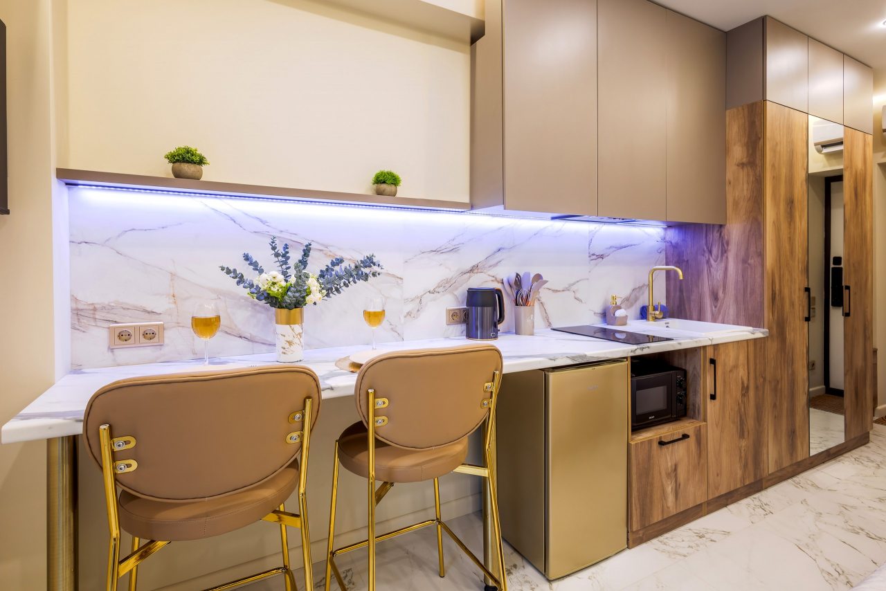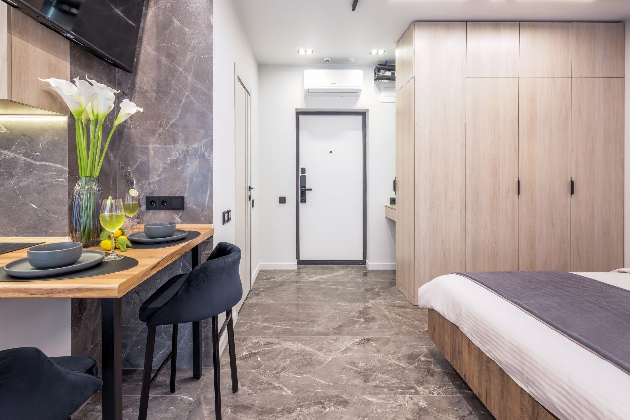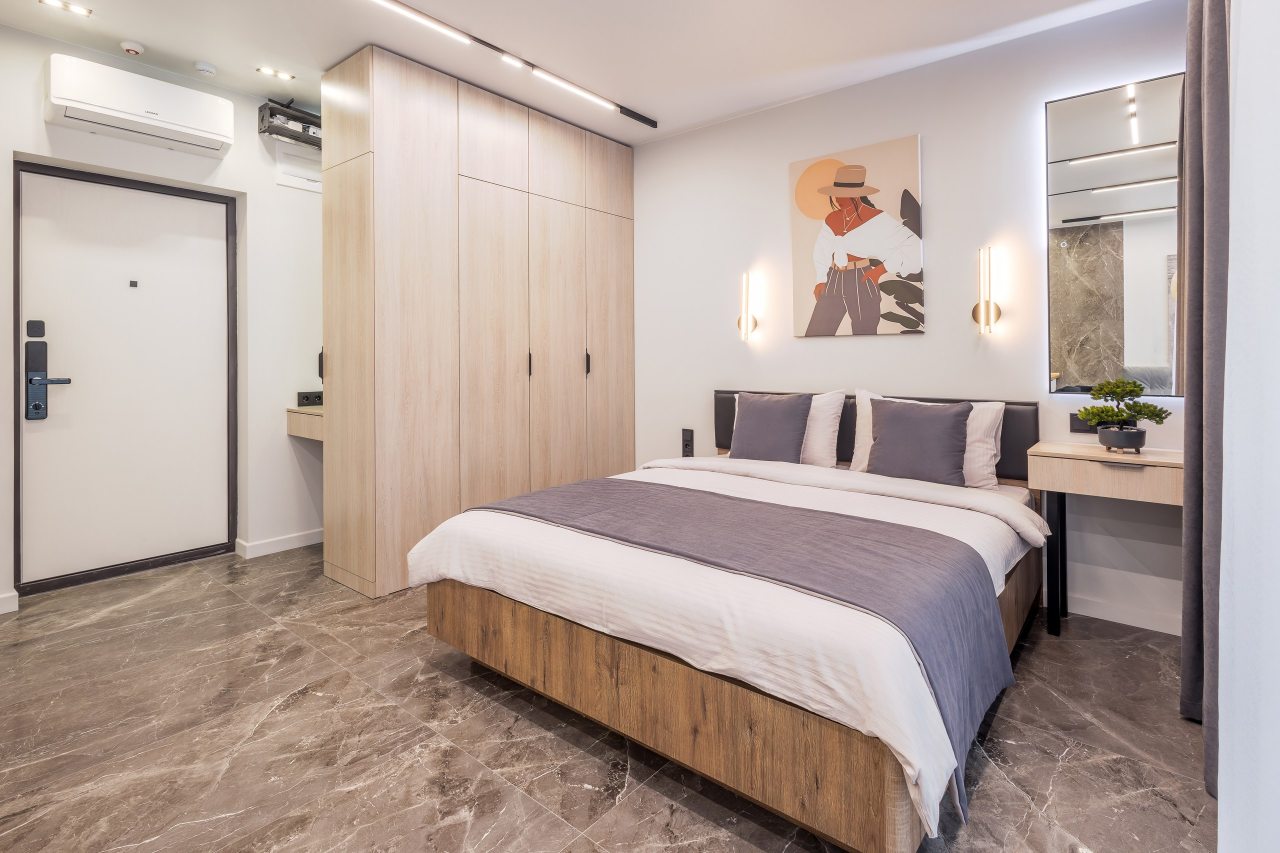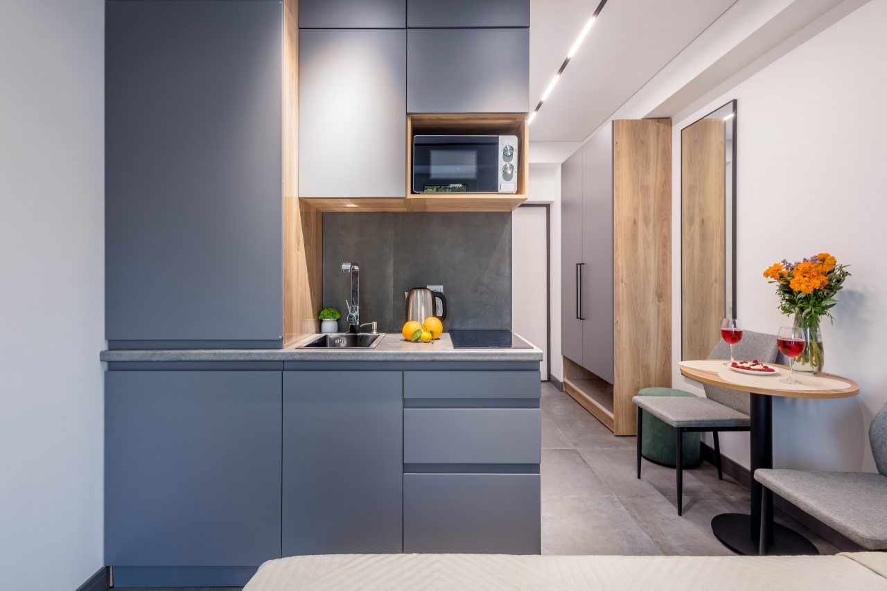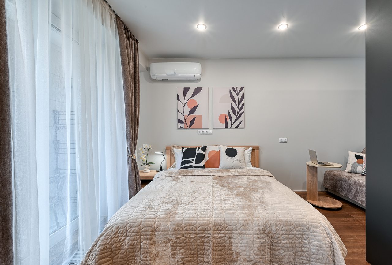 Для проживания предлагаются уютные апартаменты оснащенные удобной двуспальной кроватью, кондиционером, ЖК-телевизором, затемненными шторами, шкафом, кухонной зоной, собственной ванной комнатой и балконом с уличной мебелью. Санузел укомплектован современной сантехникой, стиральной машиной, средствами личной гигиены и феном. Доступна точка высокоскоростного интернета.