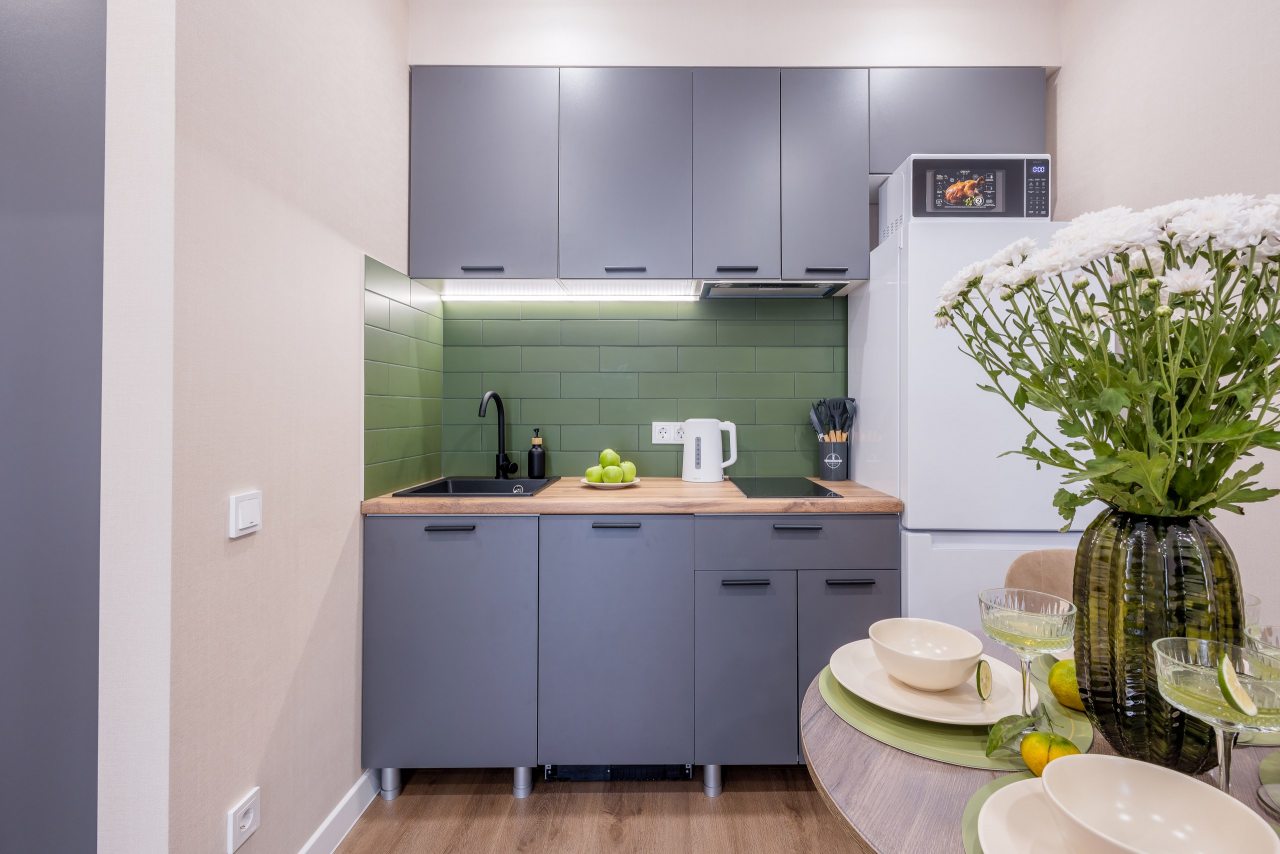 Кухня оборудована всей необходимой мебелью и бытовой техникой для приготовления домашней еды. Пообедать можно в ближайшем кафе.