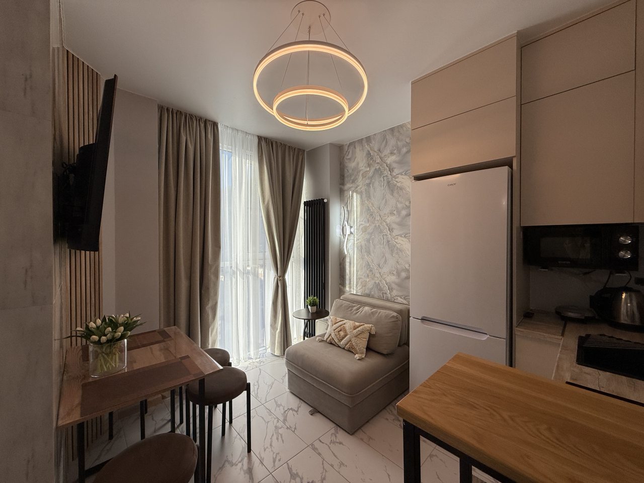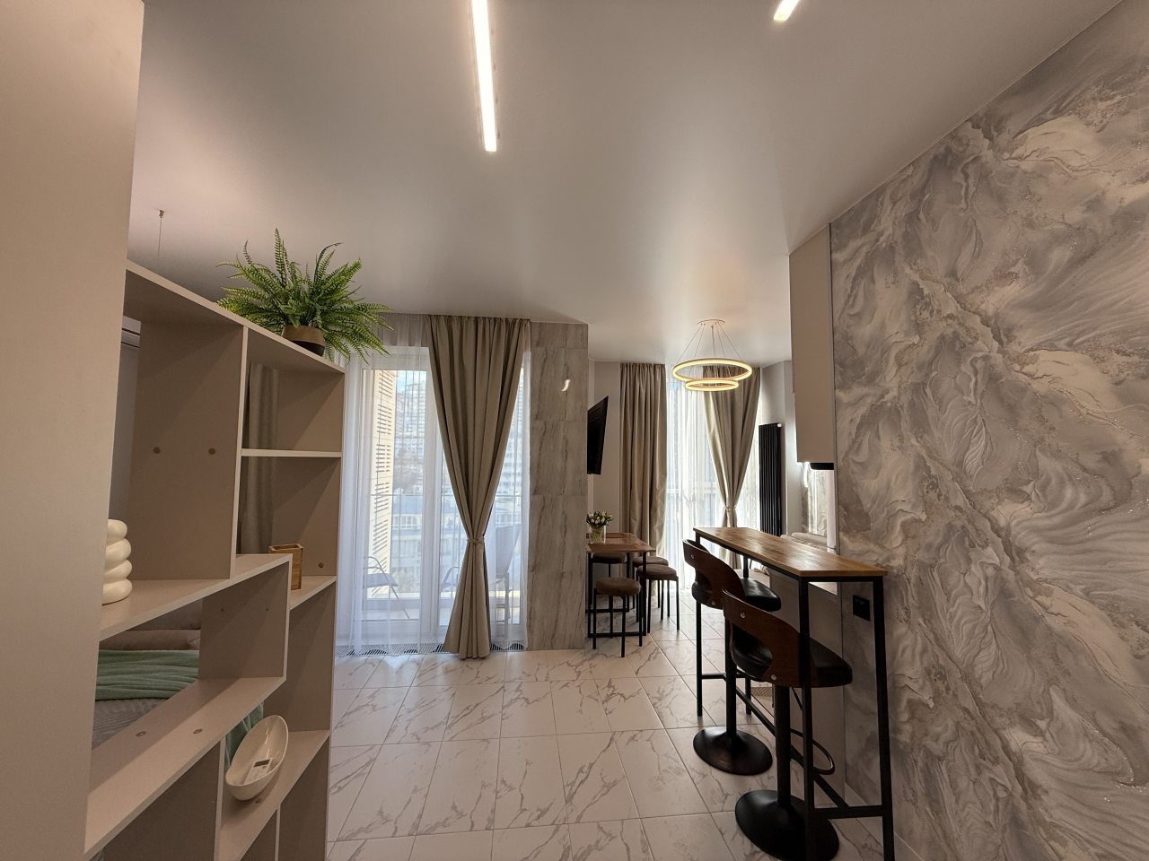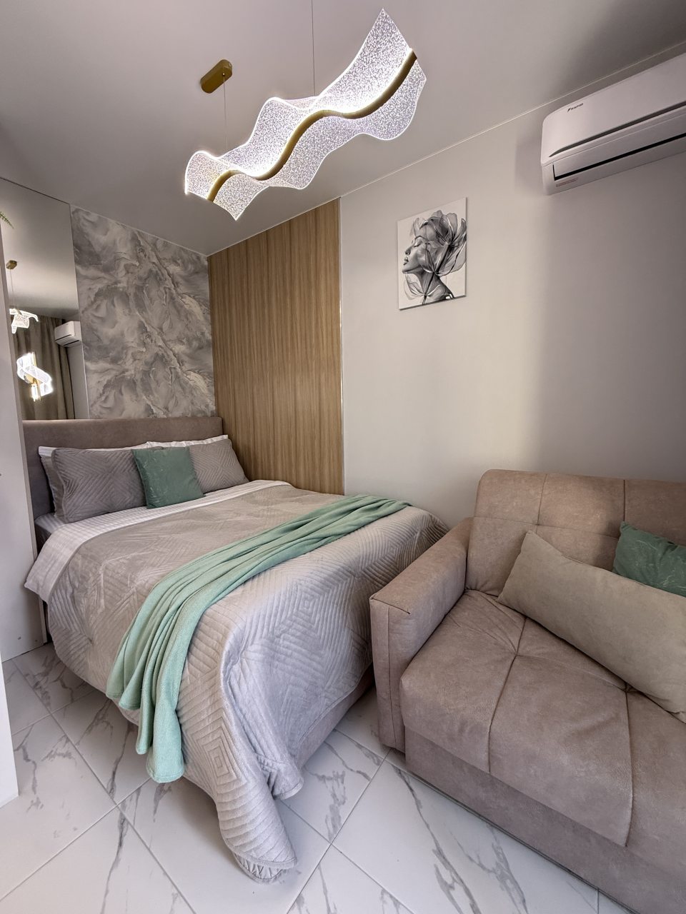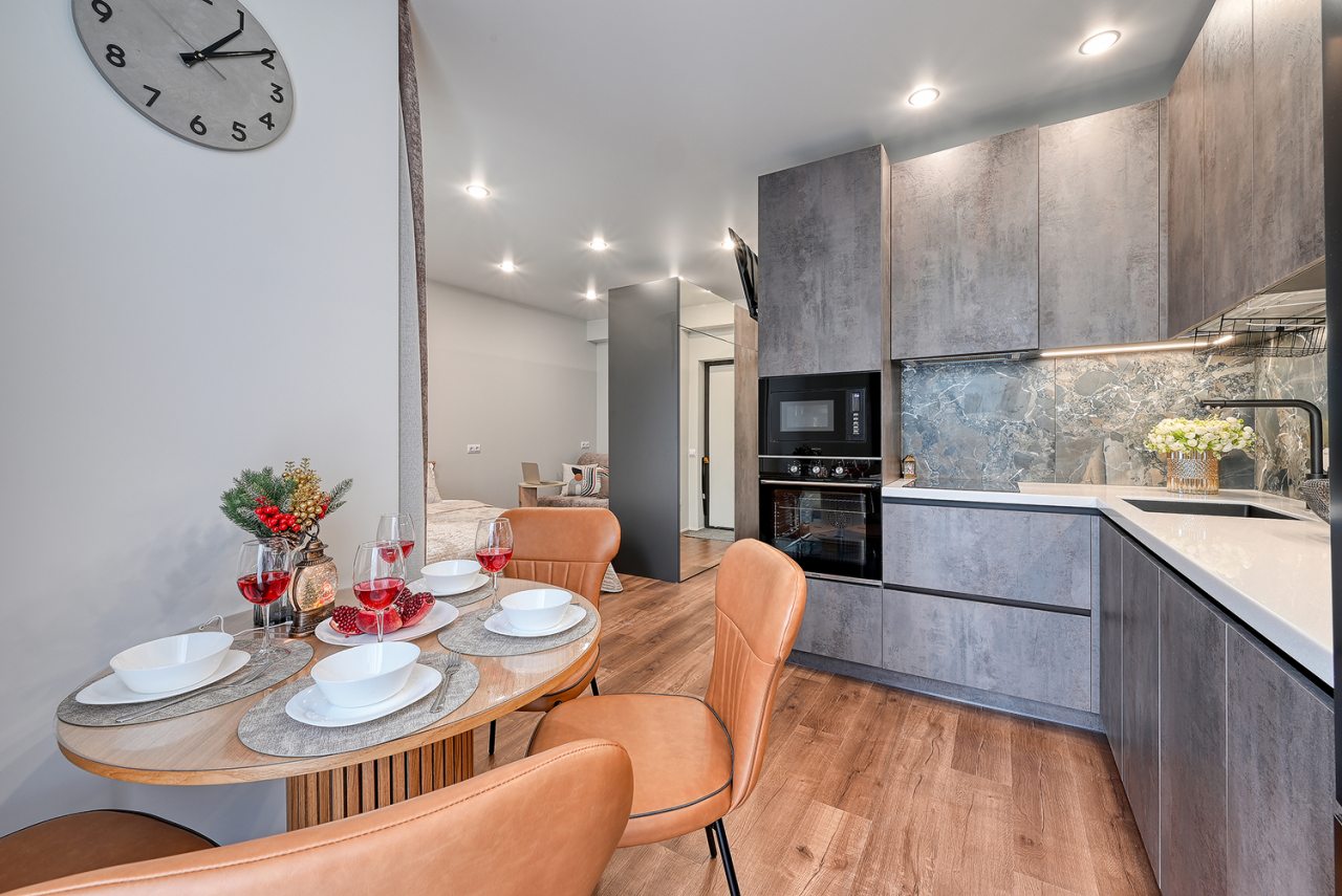 Отличная планировка квартиры, удобно для семьи с двумя детьми, если спят на одном диване, у нас матрас на кровати свежий, очень удобный, современный красивый ремонт, вся необходимая посуда и плита есть, порадовало наличие посудомойки и стиралки с функцией сушки.