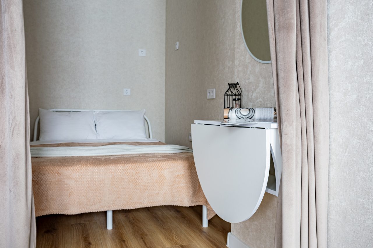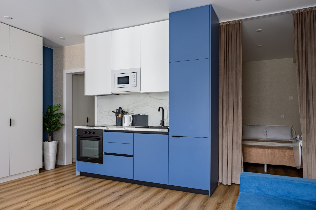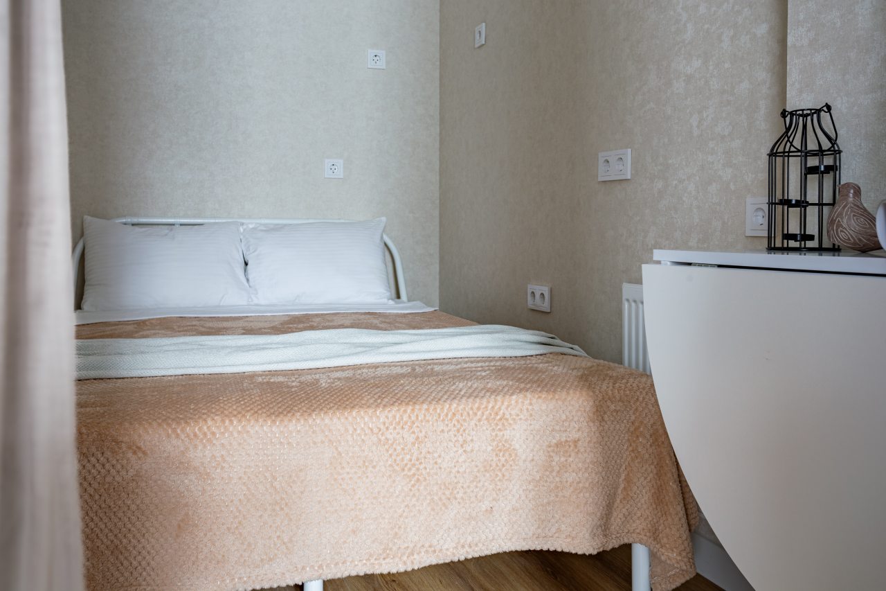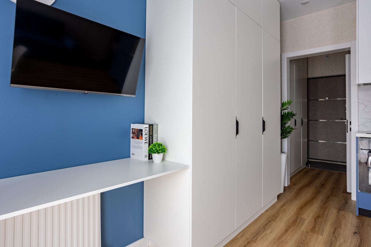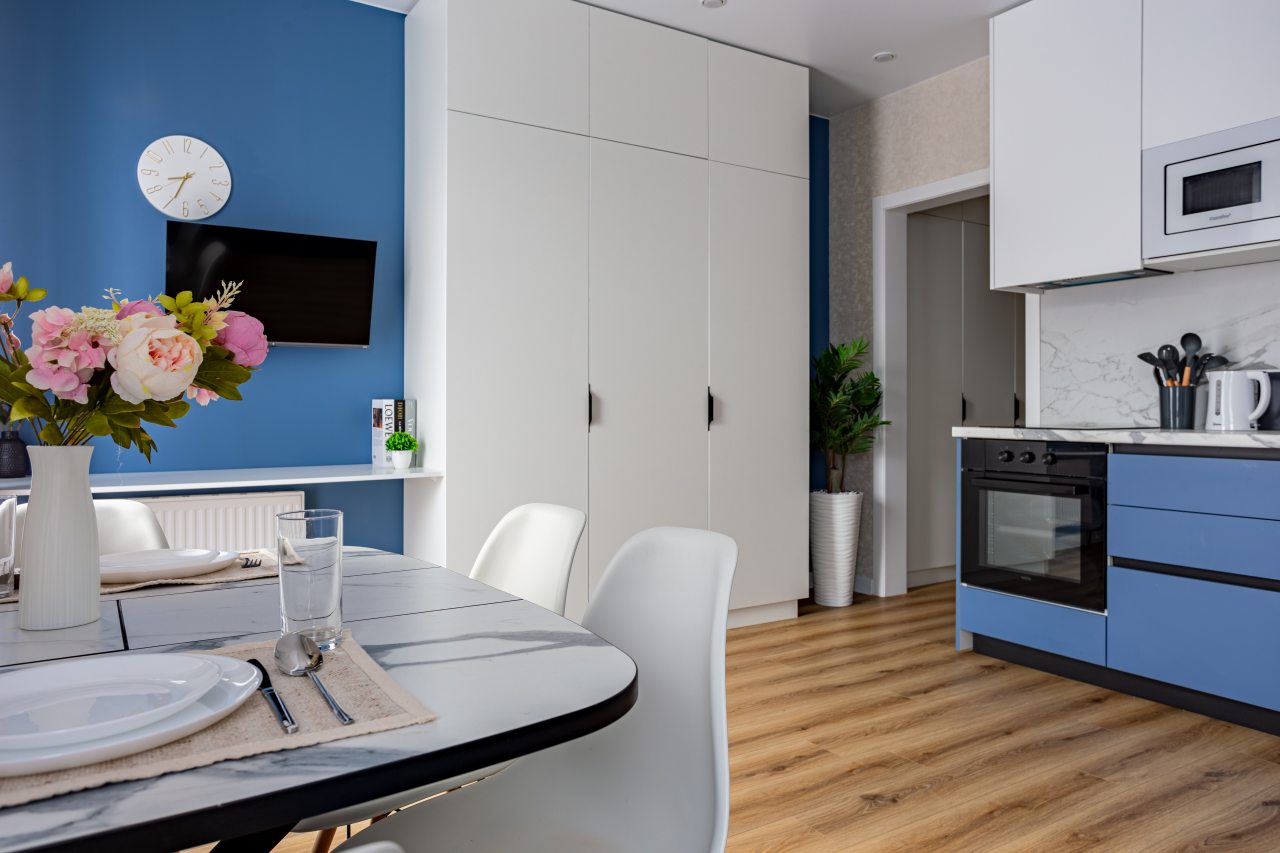 К размещению подготовлены современные апартаменты с приятными синими акцентами в интерьере. Они укомплектованы качественной мебелью и техникой: вместительный шкаф, двуспальная кровать с набором постельного белья, телевизор, кондиционер, круглый обеденный столик на несколько персон. В ванной комнате имеются индивидуальные средства гигиены.