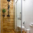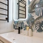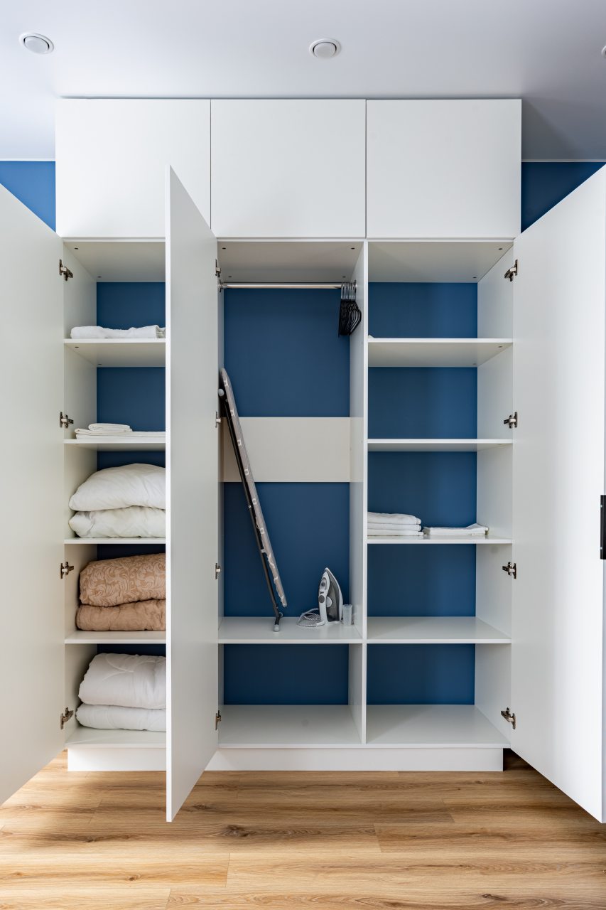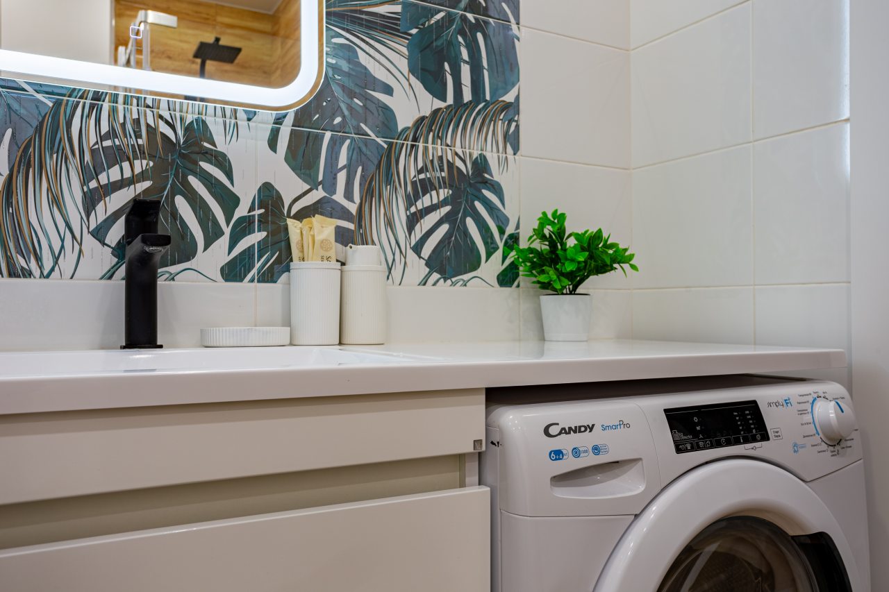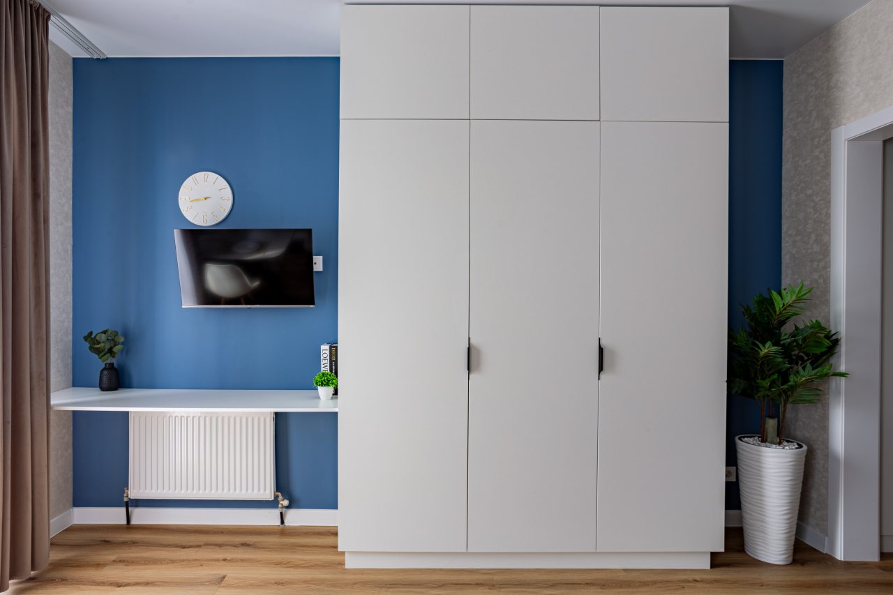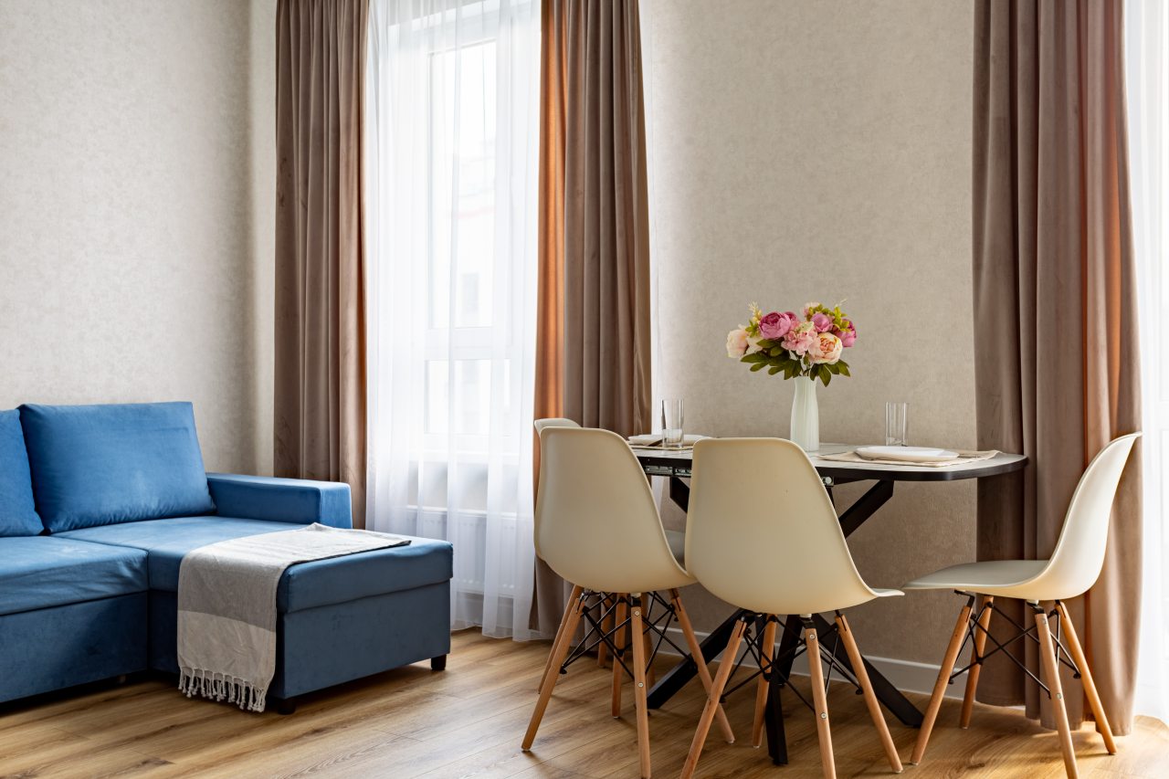 К размещению подготовлены современные апартаменты с приятными синими акцентами в интерьере. Они укомплектованы качественной мебелью и техникой: вместительный шкаф, двуспальная кровать с набором постельного белья, телевизор, кондиционер, круглый обеденный столик на несколько персон. В ванной комнате имеются индивидуальные средства гигиены.