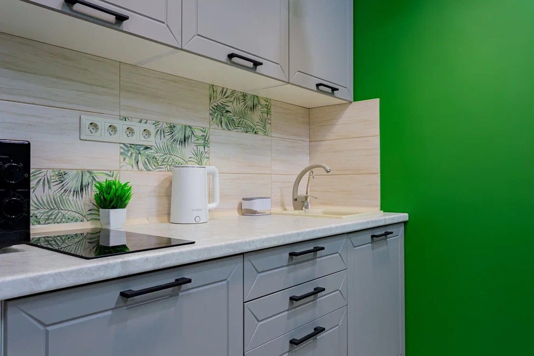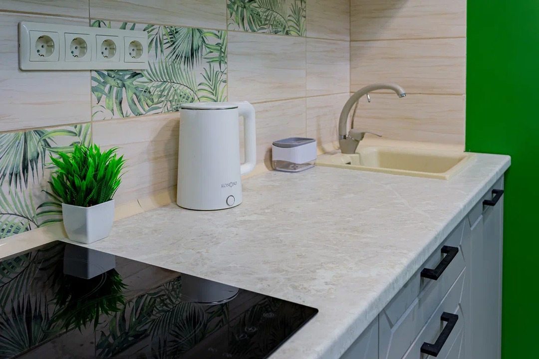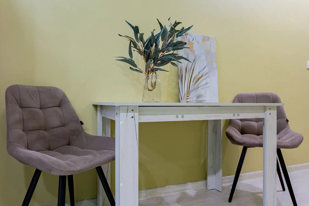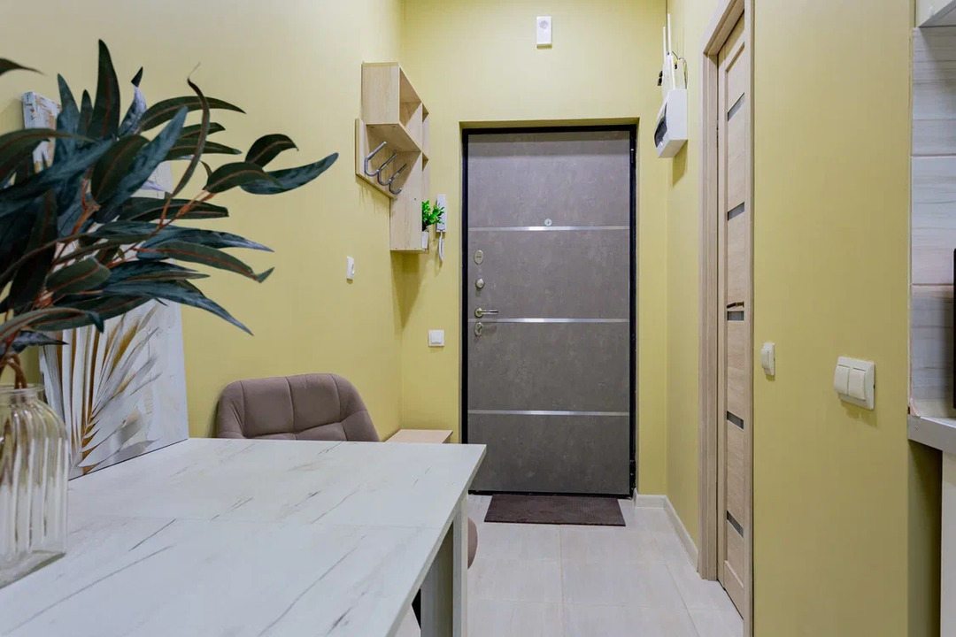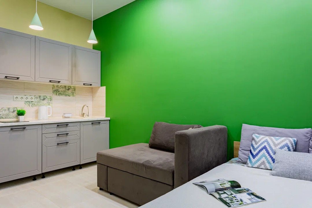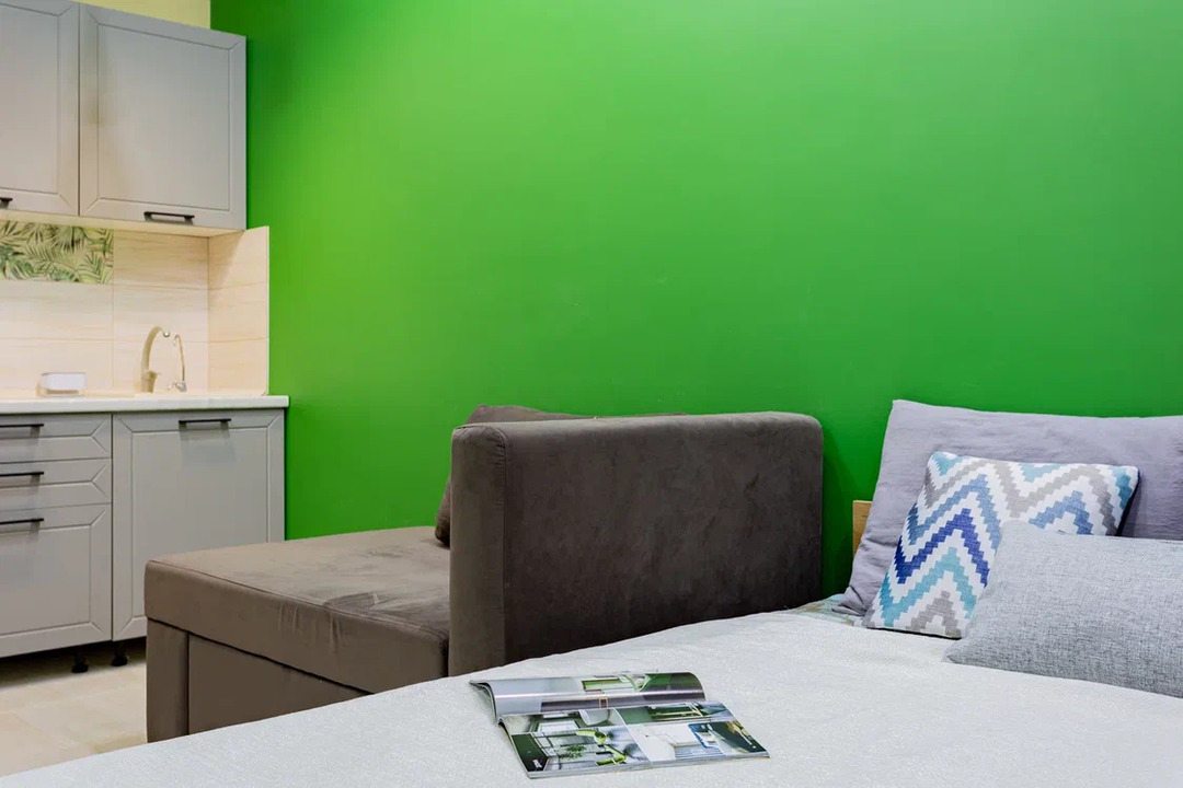 Уютная студия. Нас здесь все устроило. Красивый яркий интерьер, современная мебель и техника, есть все удобства. Владельцы приятные, общение было минимальным, но внимательным. От моря находится далеко, но мы почти и не купались, так что у нас это не вызвало проблем.