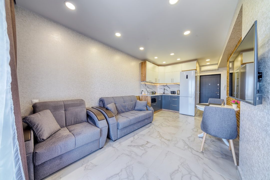 Отдыхая в Сочи, мы забронировали апартаменты в жилом комплексе Сокол. Это новый многоквартирный дом с шикарной планировкой. Квартира понравилась, она достаточно вместительная и с нее открывается вид на море. Диваны удобные, хотя каждый же день их нужно раскладывать. Иначе места остается мало. Кухонная зона вместительная, можно готовить любую еду. Панорамное окно открывает много света, из-за чего здесь намного уютнее. Отлично!