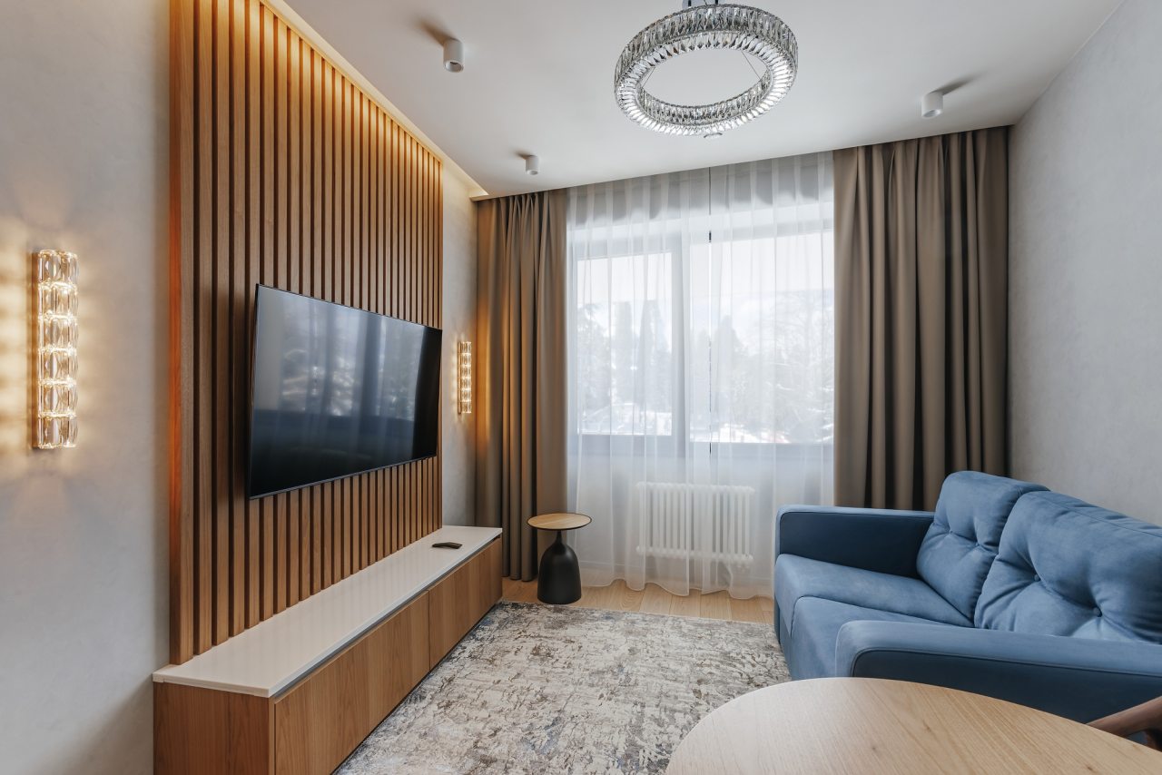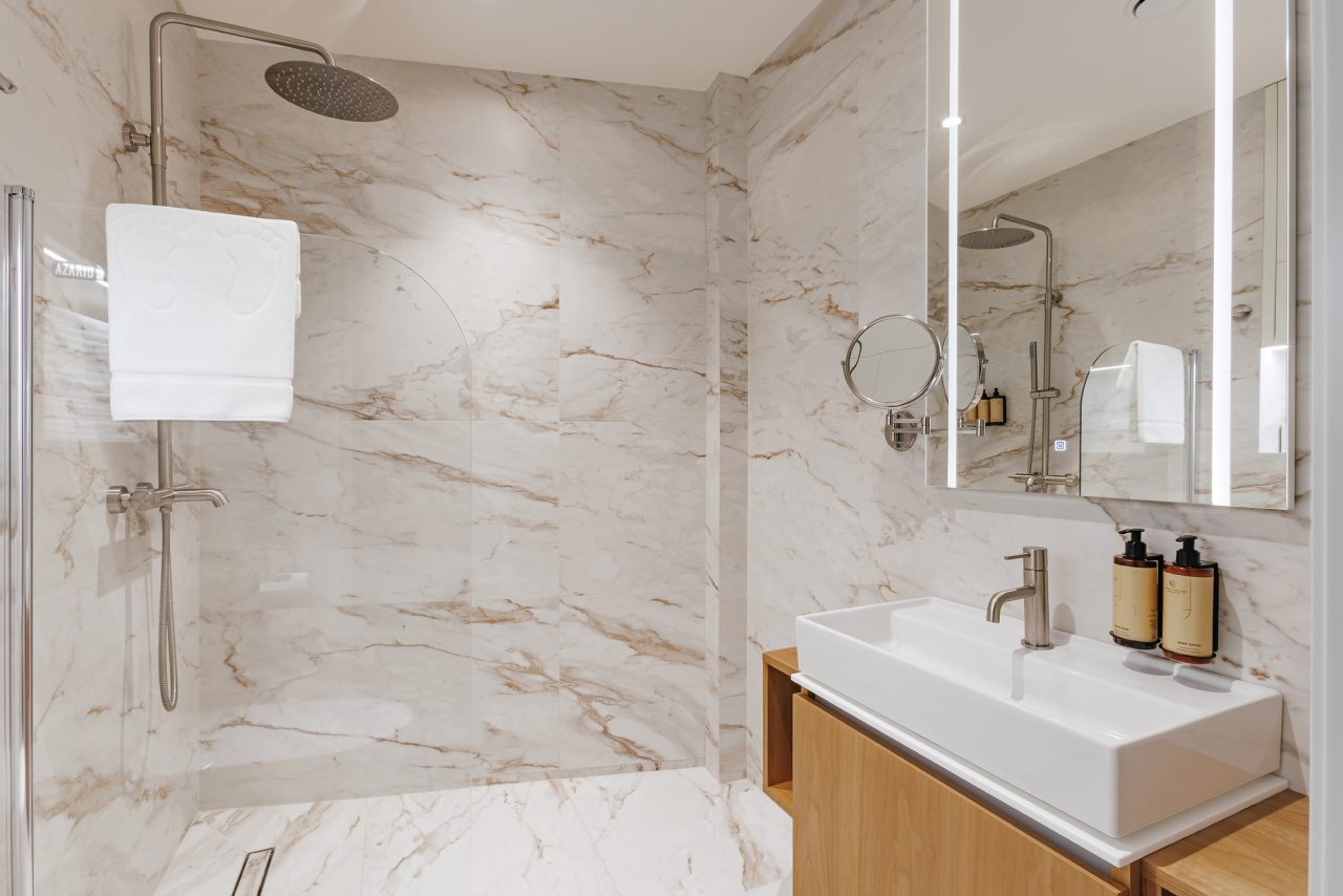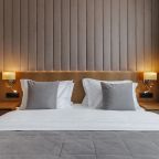 Для проживания доступны 142 номера разной площади, выполненные в индивидуальном стиле. Все с премиальным уровнем отделки: встроенная мебель в гостевых и спальных зонах. Имеется двуспальная кровать, прикроватные тумбочки, шкаф для хранения вещей, зеркало, телевизор. Быть на связи с родными и близкими поможет скоростной интернет. Санузел оснащён нужной сантехникой, набором полотенец, феном, халатами, тапочками, гигиеническими и косметическими средствами.