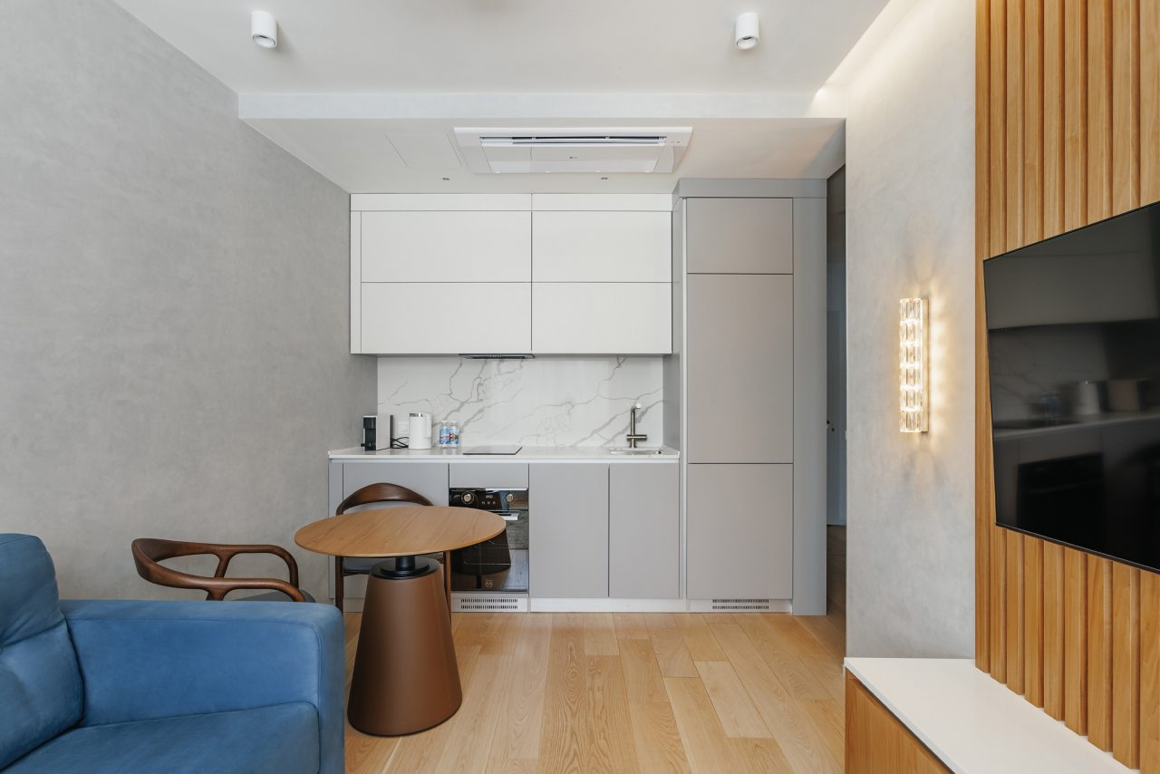 Некоторые номера оснащены современной кухней с холодильным шкафом, СВЧ-печью, кофемашиной, варочной панелью, электрочайником, бутилированной водой. Также в комплексе — кафе, кондитерская и лаундж для делового ужина.