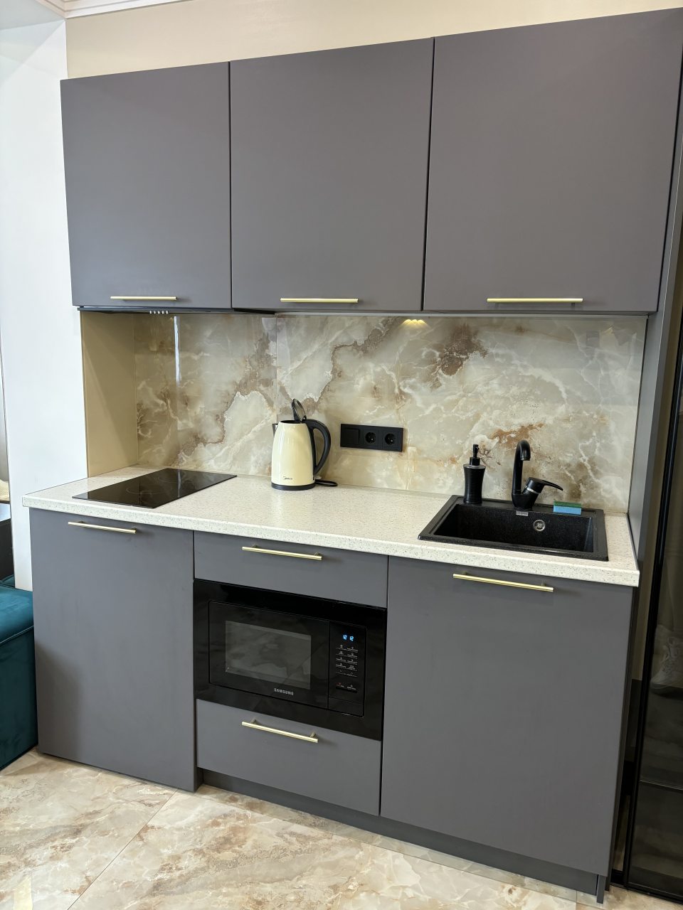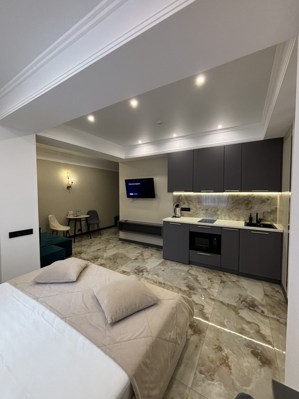 Доставку из местного кафе можно заказывать в номер. Тут даже меню лежит. Кроме этого, есть плита и прочее, так что можно и самостоятельно готовить при желании или разогревать. В Атмосфере все понравилось. Хорошие условия для пребывания. Мебель, гигиена, кровать и другие – все в полном порядке.