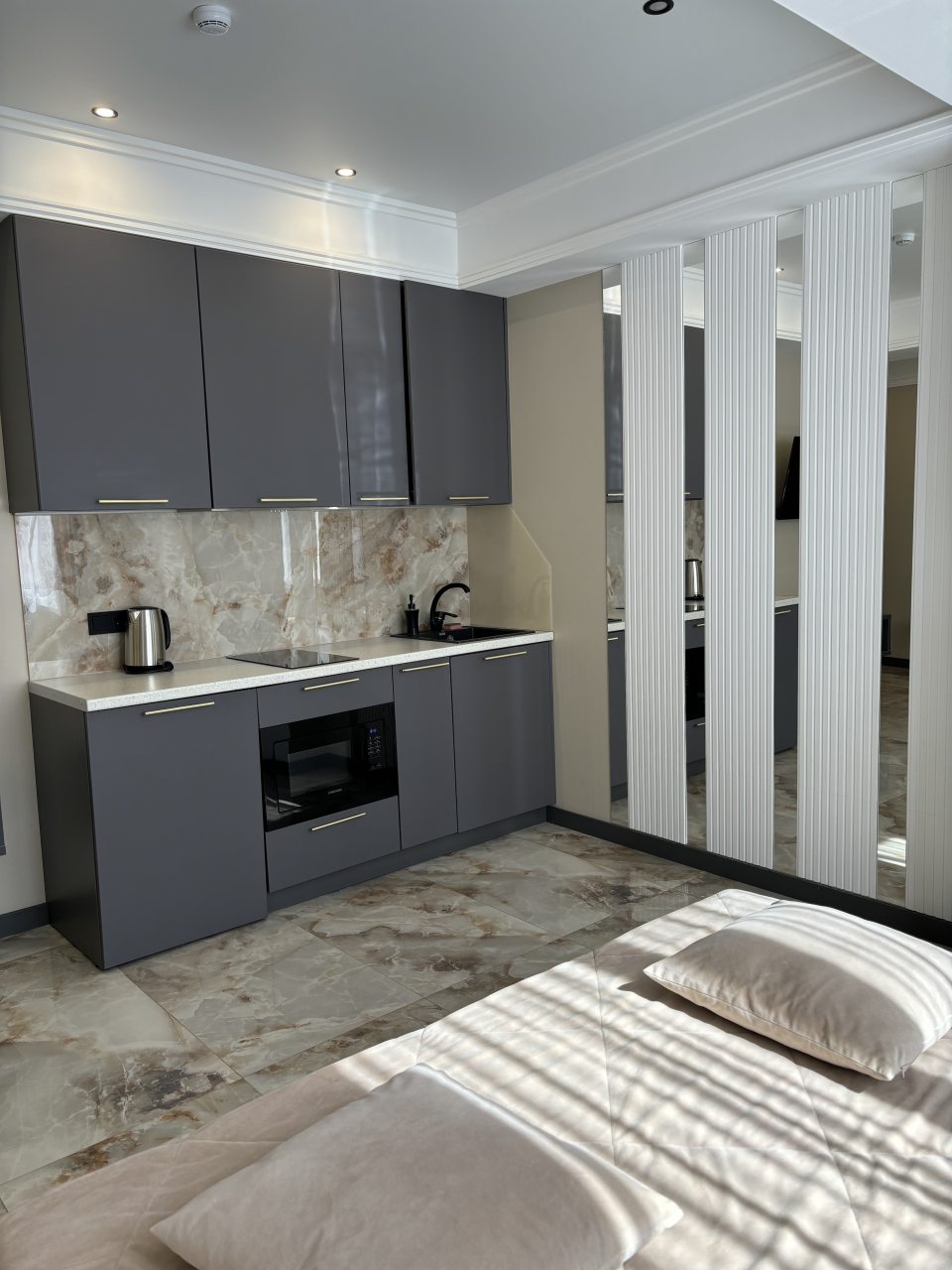 Современная кухня оборудована необходимой техникой, в том числе варочной панелью и микроволновой печью, а также посудой и обеденным уголком. Здесь точно каждый почувствует себя шеф-поваром. На первом этаже находится кафе «Атмосфера».
