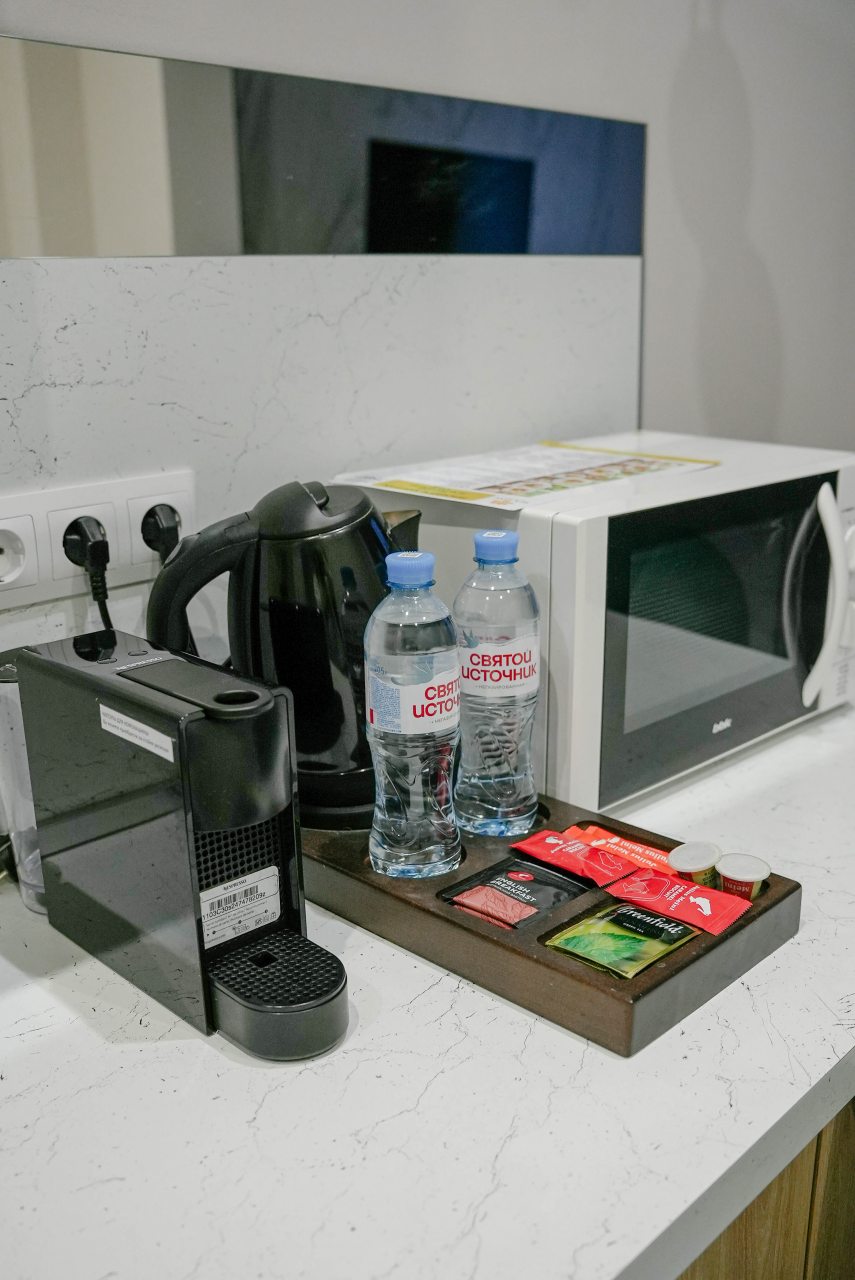 На кухне есть холодильник, электрочайник, микроволновая печь. В здании отеля работает кафе «Матрёшка».