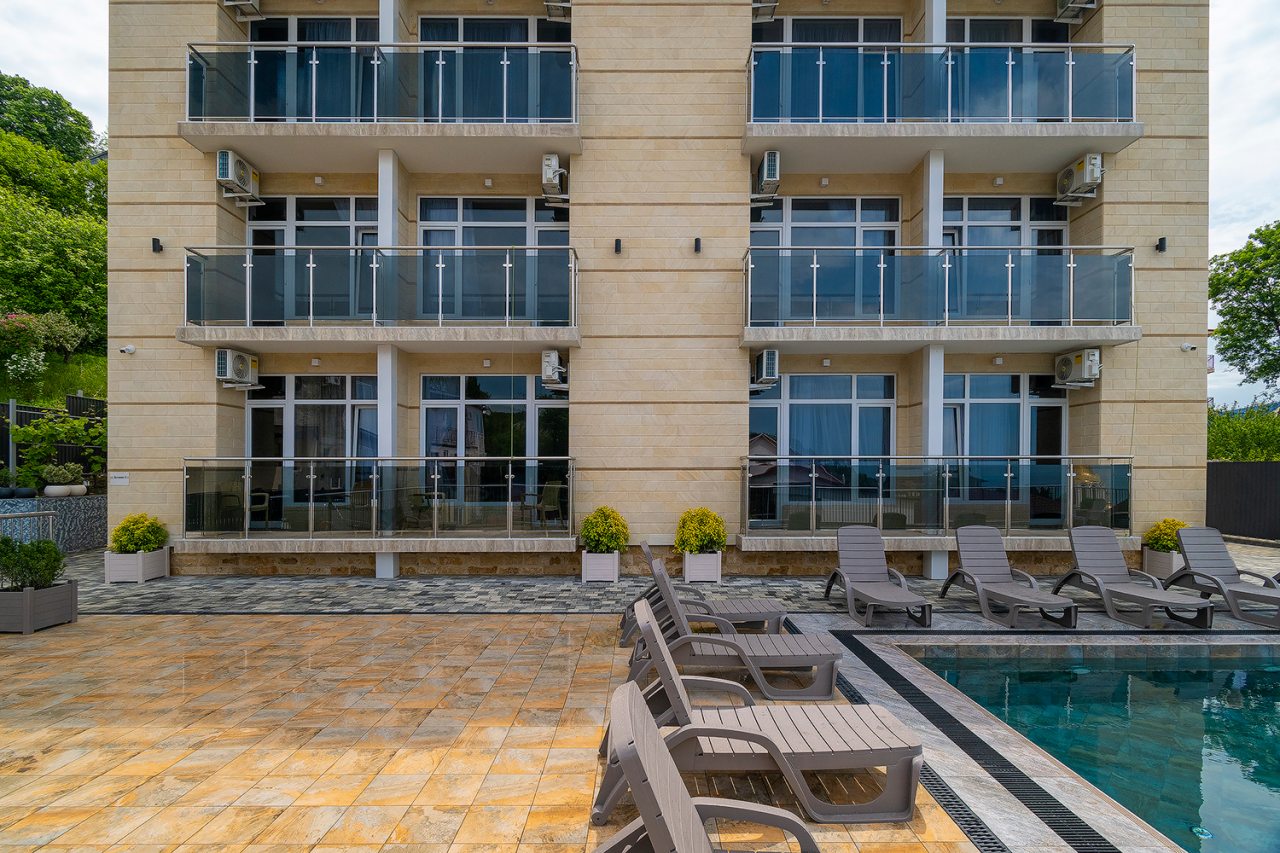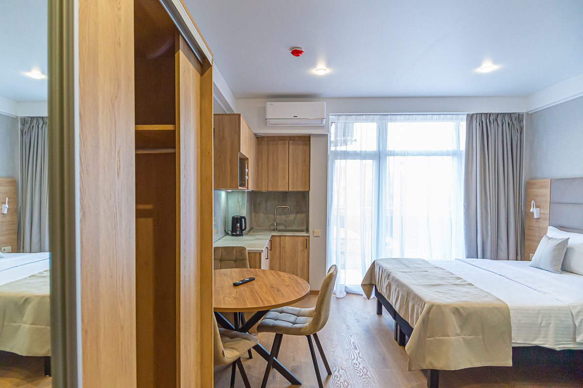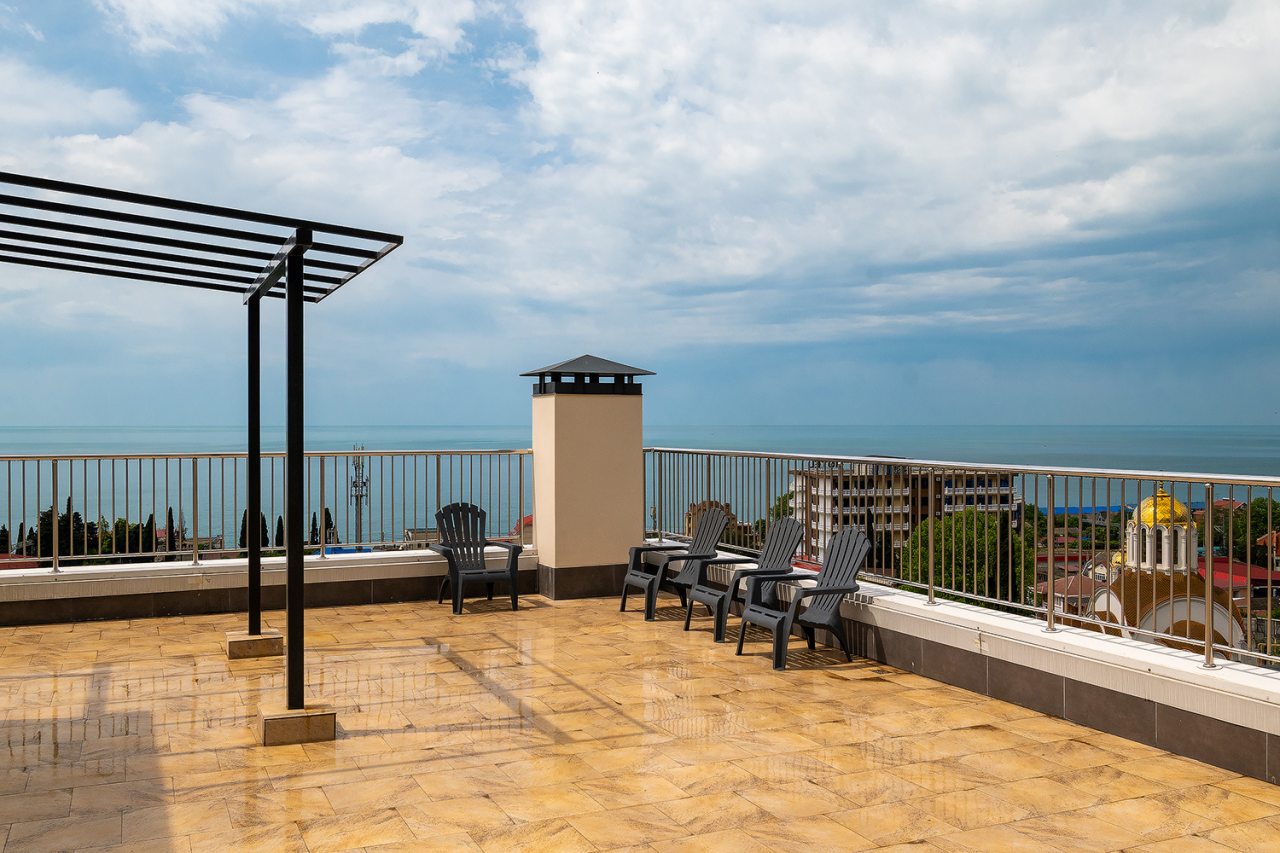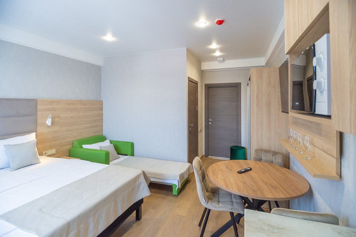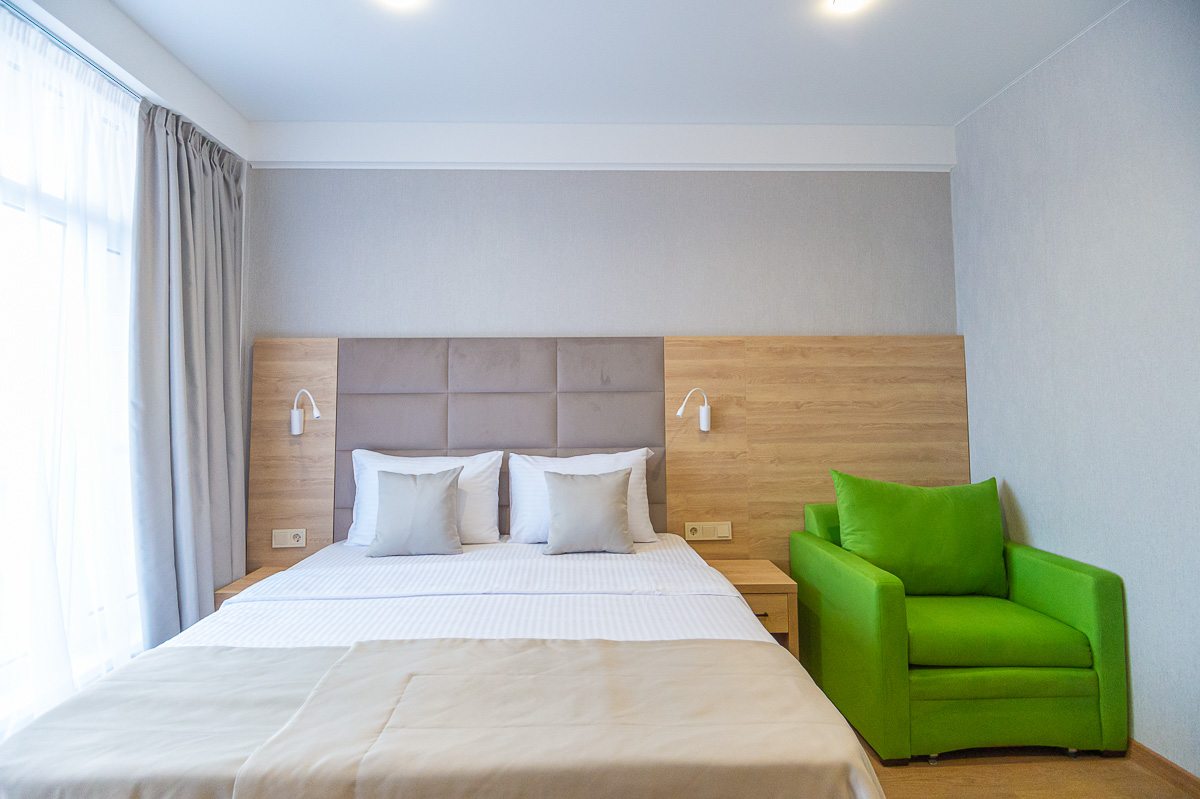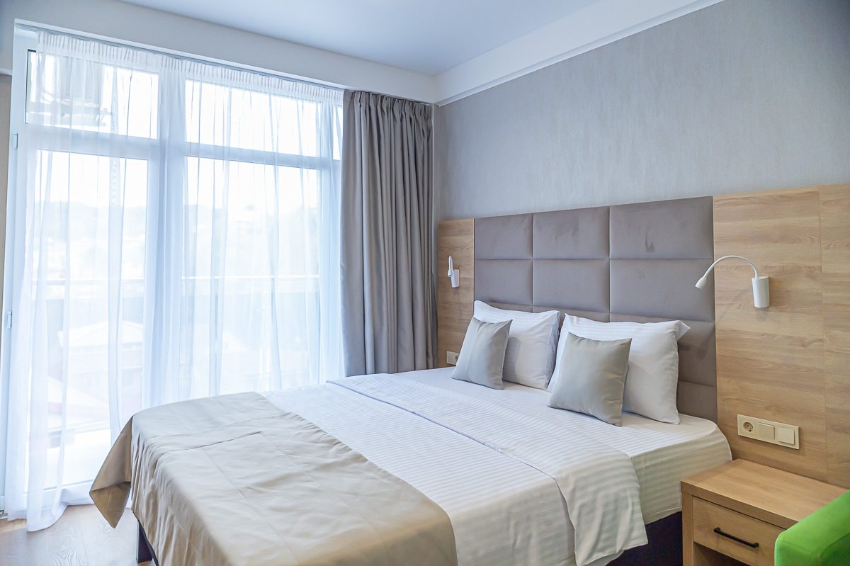 Расположена гостиница недалеко от моря, она оснащена классными номерами. У нас была большая двуспальная кровать и для ребенка мы раскладывали кресло. Удалось тут отлично провести свой отпуск. Еду готовили на кухне, которая полностью оснащена всей техникой. Мы ходили в баньку, а еще я приятно впечатлена панорамными видами с крыши отеля.