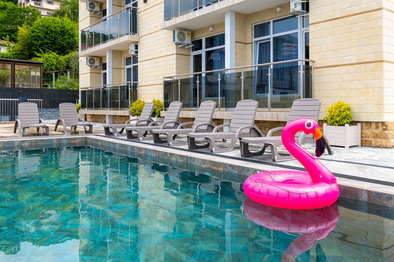 На территории есть открытый бассейн, баня и пространство для отдыха на панорамной крыше отеля. В 0,395 км находится пляж «Прозрачный». Расстояние до железнодорожного вокзала Лоо — 0,72 км, до аэропорта Сочи — 61 км.