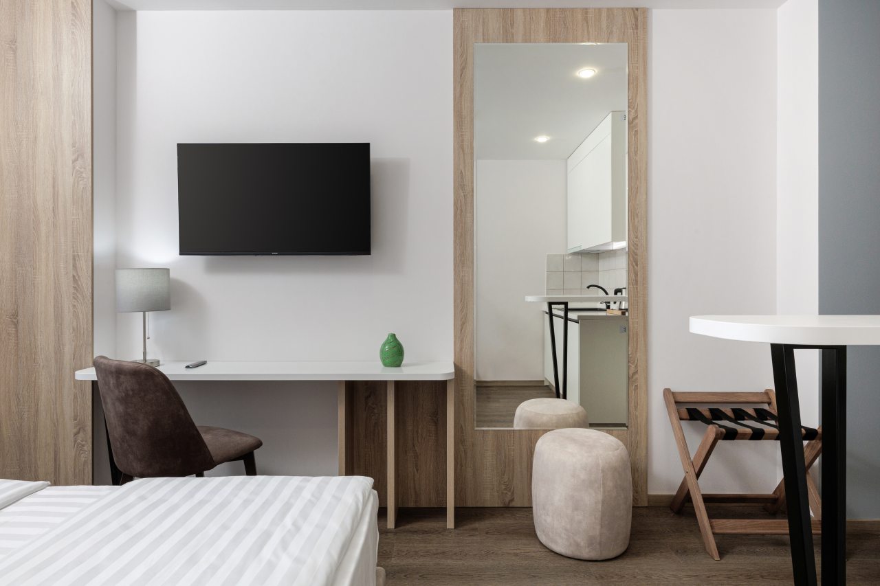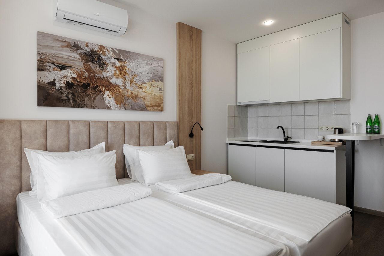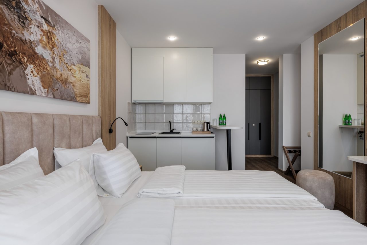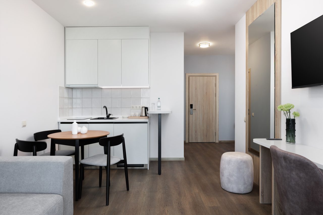 Вы можете воспользоваться бытовой техникой и набором посуды для самостоятельного приготовления еды на кухонной зоне, которая оборудованная в каждом из номеров. Помимо этого в отеле работает ресторан, где предоставляется трехразовое питание, и каждый желающий может побаловать себя любимыми деликатесами. Доступна доставка еды и напитков в номер.