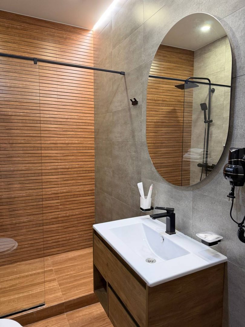 Чистый и просторный номер, рядом пляж, близость до Сочи-парк, магазины в шаговой доступности, внизу столовая, недалеко несколько кофейных. Теплый номер, подогрев полов в ванной комнате.