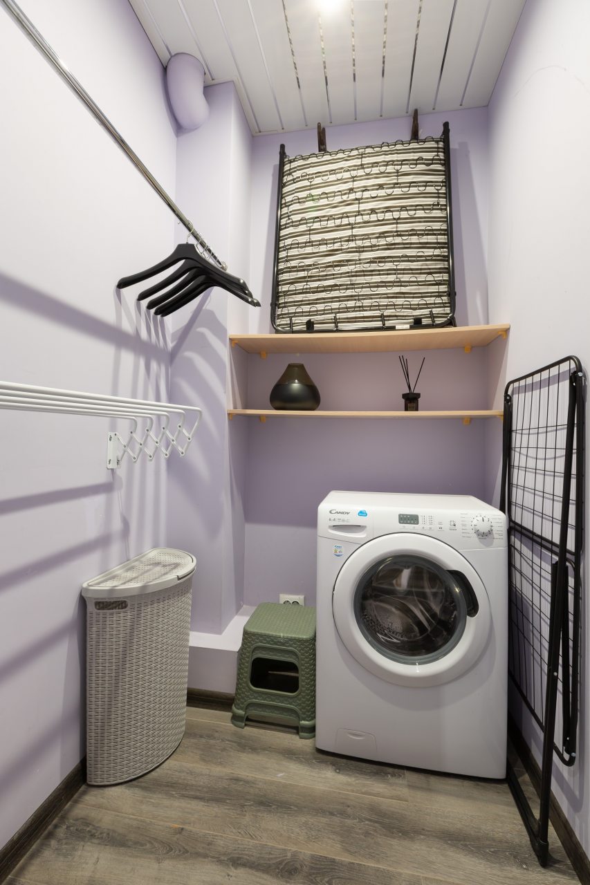 Внутри продумано всё для качественного и комфортного отдыха, включая удобную двуспальную кровать с телевизором, прикроватные лампы и тумбы, стиральную машину, панорамное остекление, вместительный шкаф и гардеробную, мягкий диван, а также санузел с душевой.