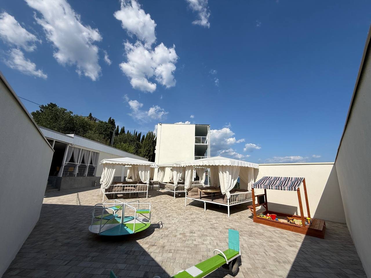 Это великолепное место с зеленой территорией и видом на море. Да, оно на горе, но в этом и вся фишка. Эти беседки, в которых просто отлично и днем, и особенно вечером романтично. Главное, что весь текстиль стирается своевременно, следов потоков туристов не заметно. Мы не готовили сами, а питались в местном кафе. Поверьте, оно того стоит!