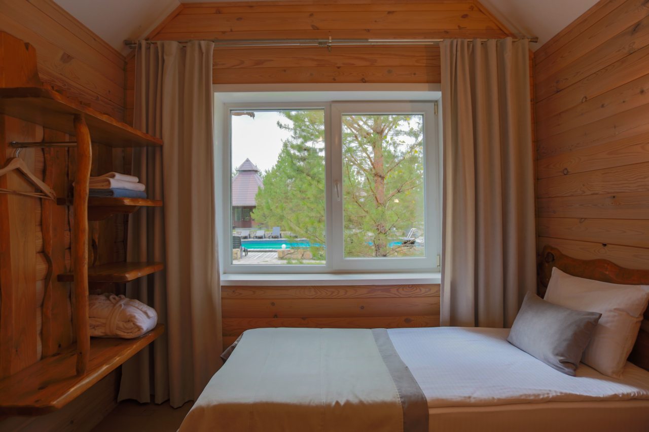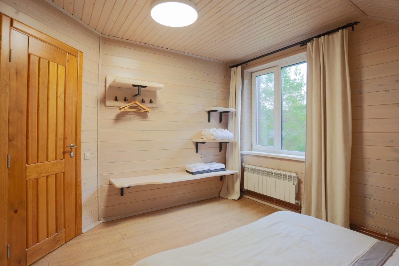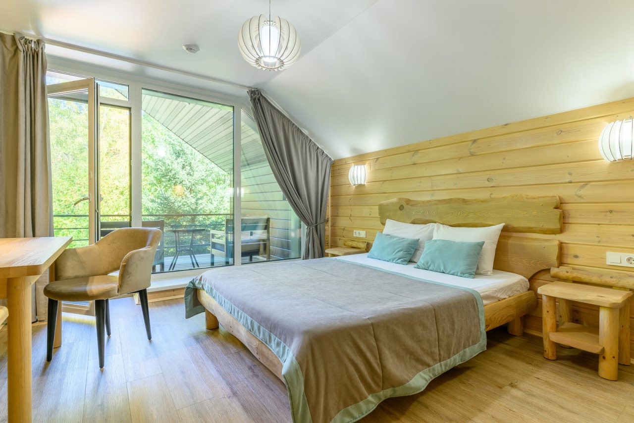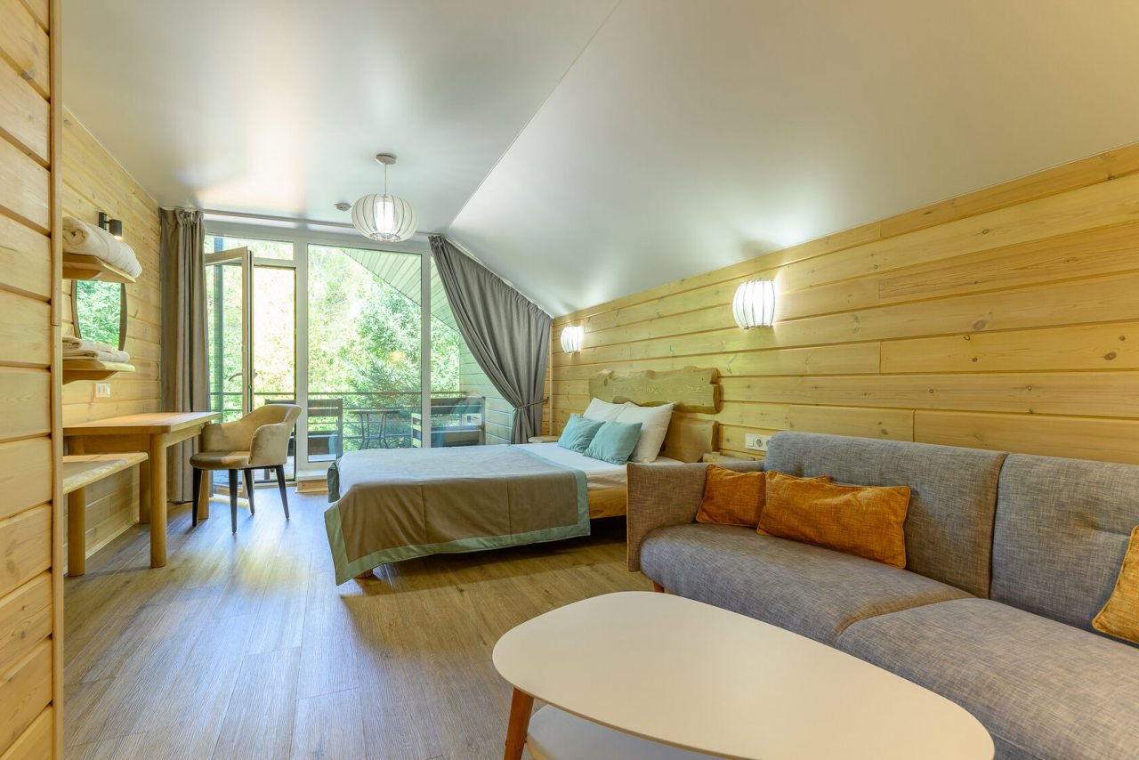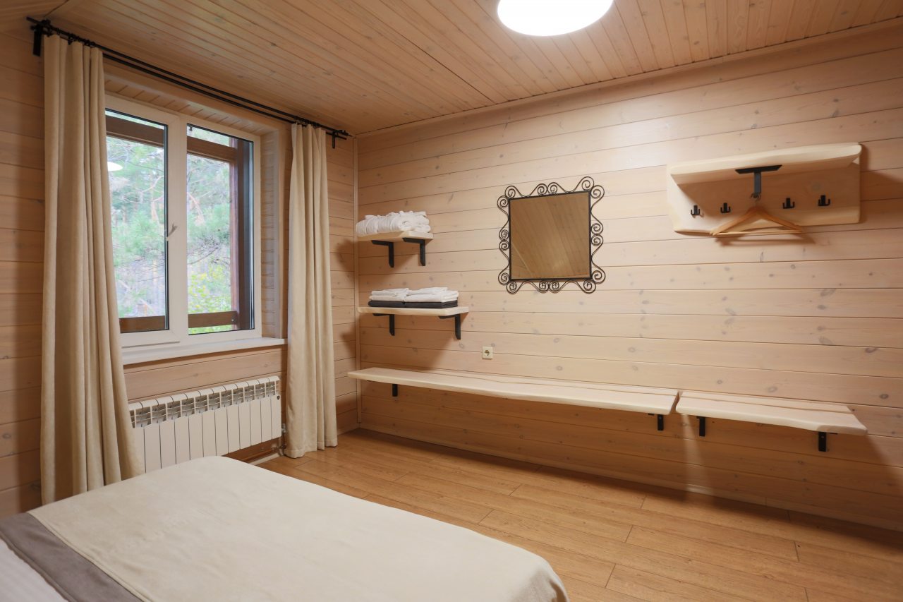 Территория восьми гектаров разделена на отдельные зоны, благодаря чему обеспечивается приватность. Для размещения представлено 39 номеров: роскошные шале, вместительные коттеджи и кедровые домики, построенные из экологически чистых материалов. Каждый из выбранных вариантов оснащен качественной мебелью, техникой и собственной ванной комнатой. Вместительность зависит от выбранной категории — от двух до восьми гостей, что идеально как для пары любых возрастов, так и семей с детьми.