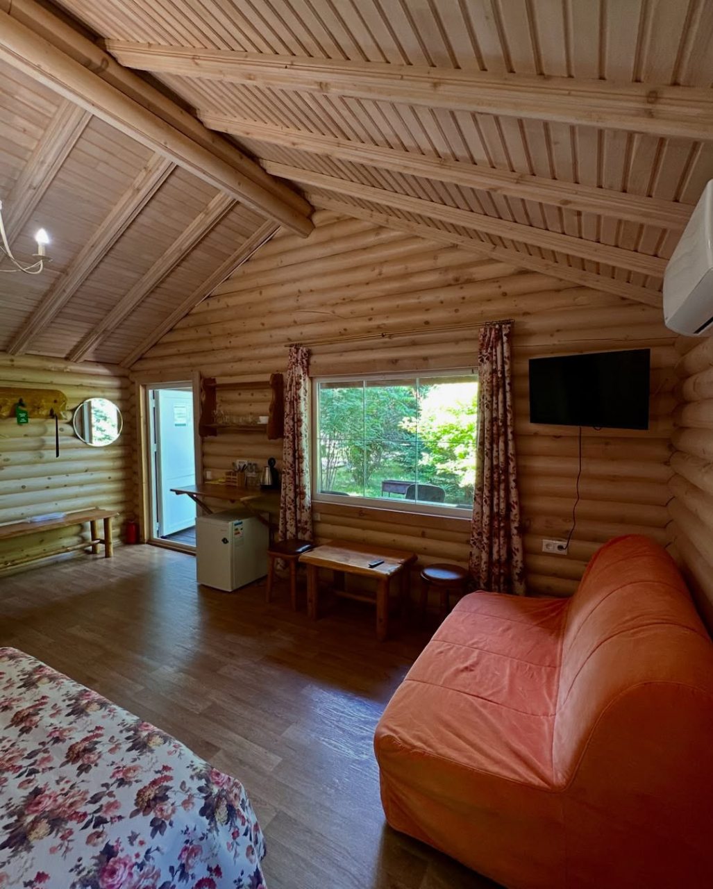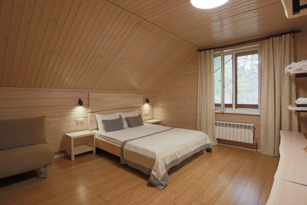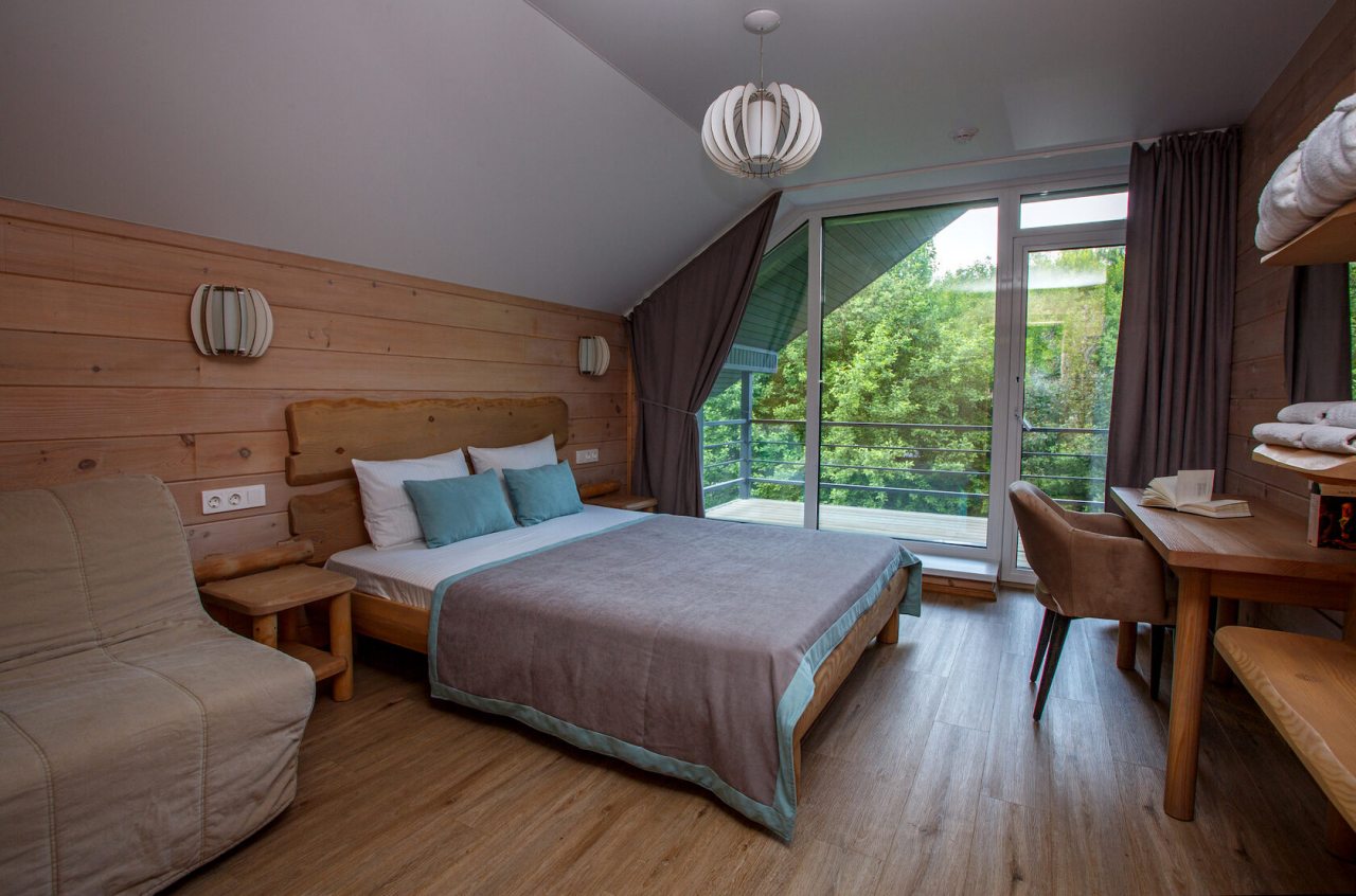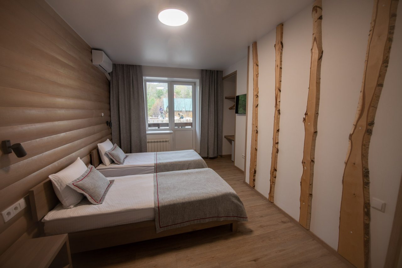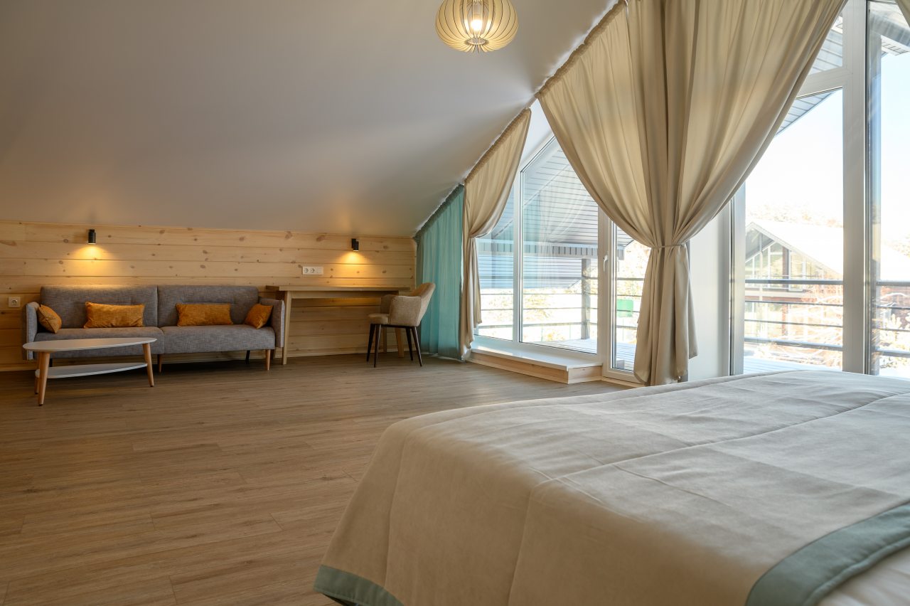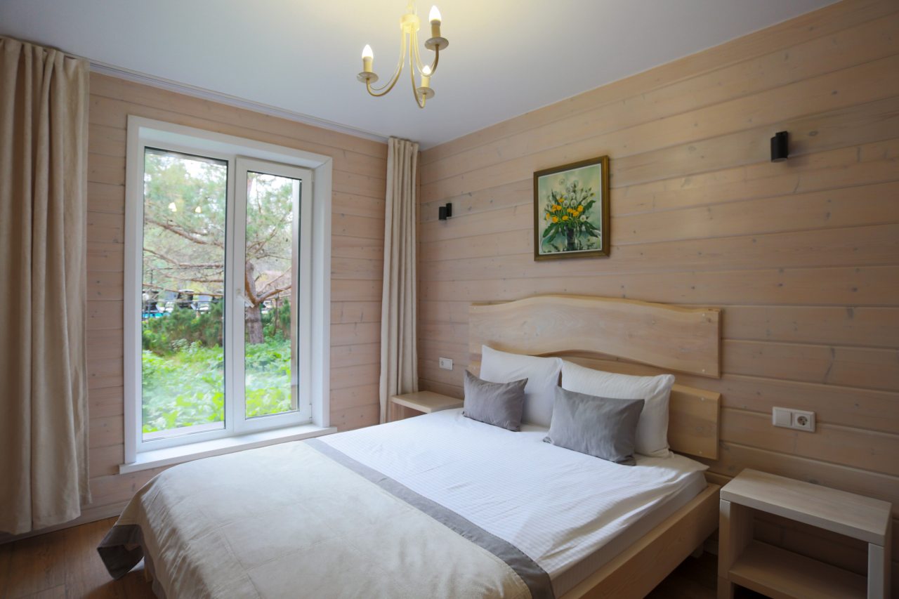 Территория восьми гектаров разделена на отдельные зоны, благодаря чему обеспечивается приватность. Для размещения представлено 39 номеров: роскошные шале, вместительные коттеджи и кедровые домики, построенные из экологически чистых материалов. Каждый из выбранных вариантов оснащен качественной мебелью, техникой и собственной ванной комнатой. Вместительность зависит от выбранной категории — от двух до восьми гостей, что идеально как для пары любых возрастов, так и семей с детьми.