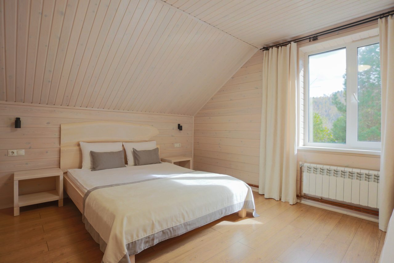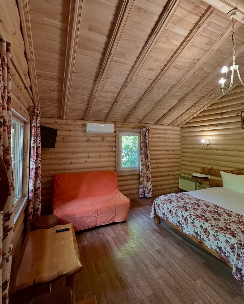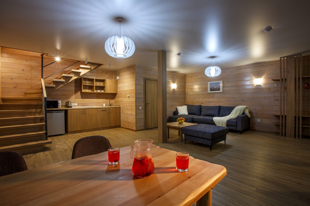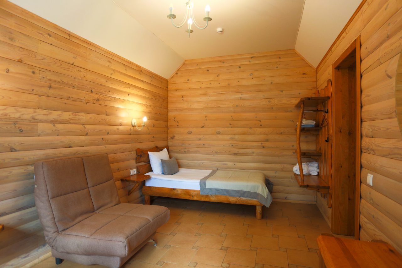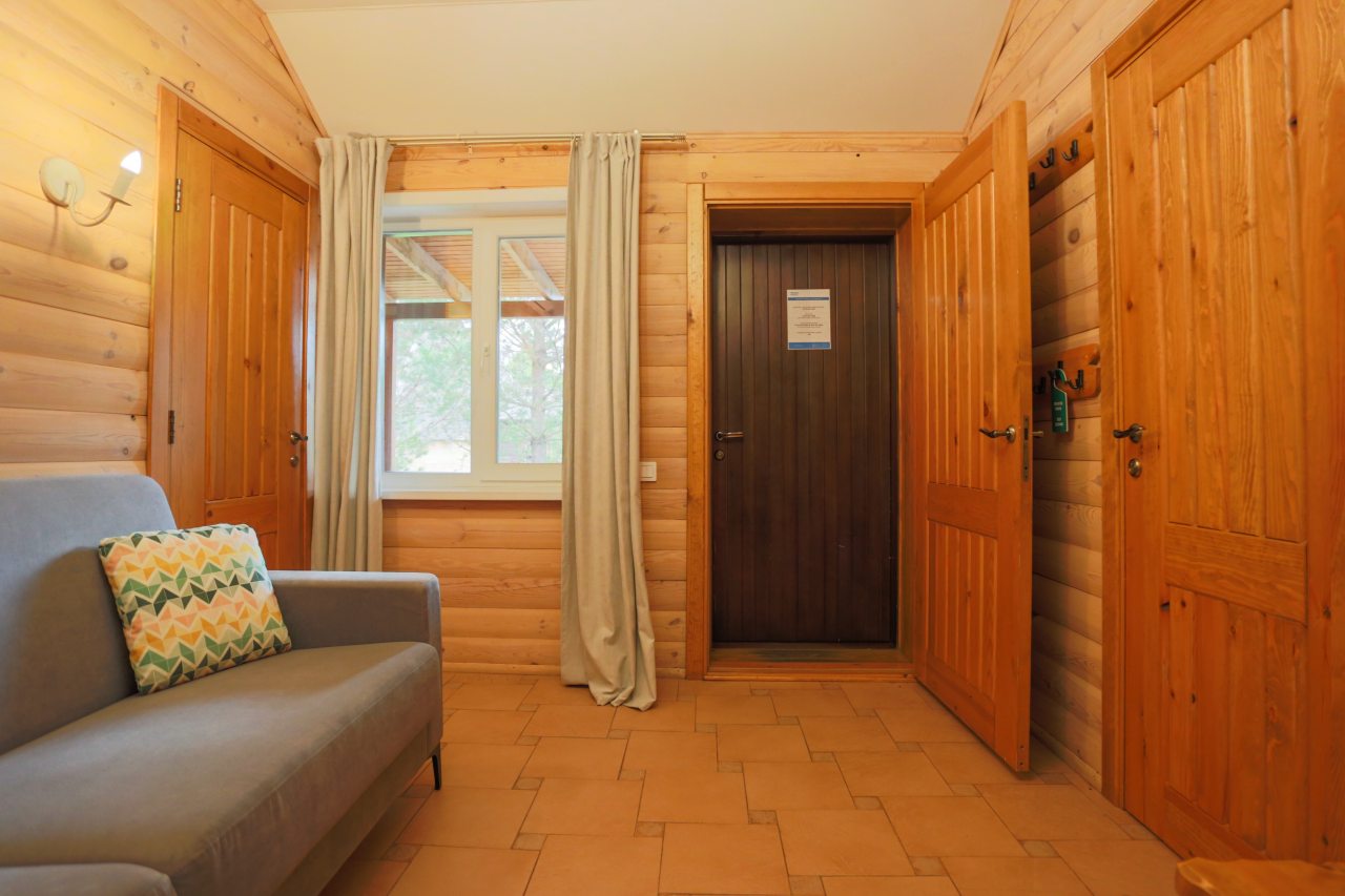 Территория восьми гектаров разделена на отдельные зоны, благодаря чему обеспечивается приватность. Для размещения представлено 39 номеров: роскошные шале, вместительные коттеджи и кедровые домики, построенные из экологически чистых материалов. Каждый из выбранных вариантов оснащен качественной мебелью, техникой и собственной ванной комнатой. Вместительность зависит от выбранной категории — от двух до восьми гостей, что идеально как для пары любых возрастов, так и семей с детьми.