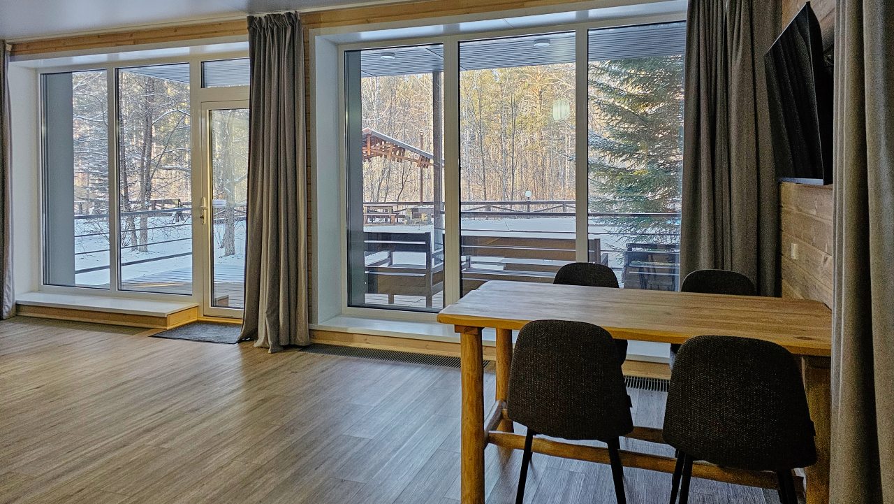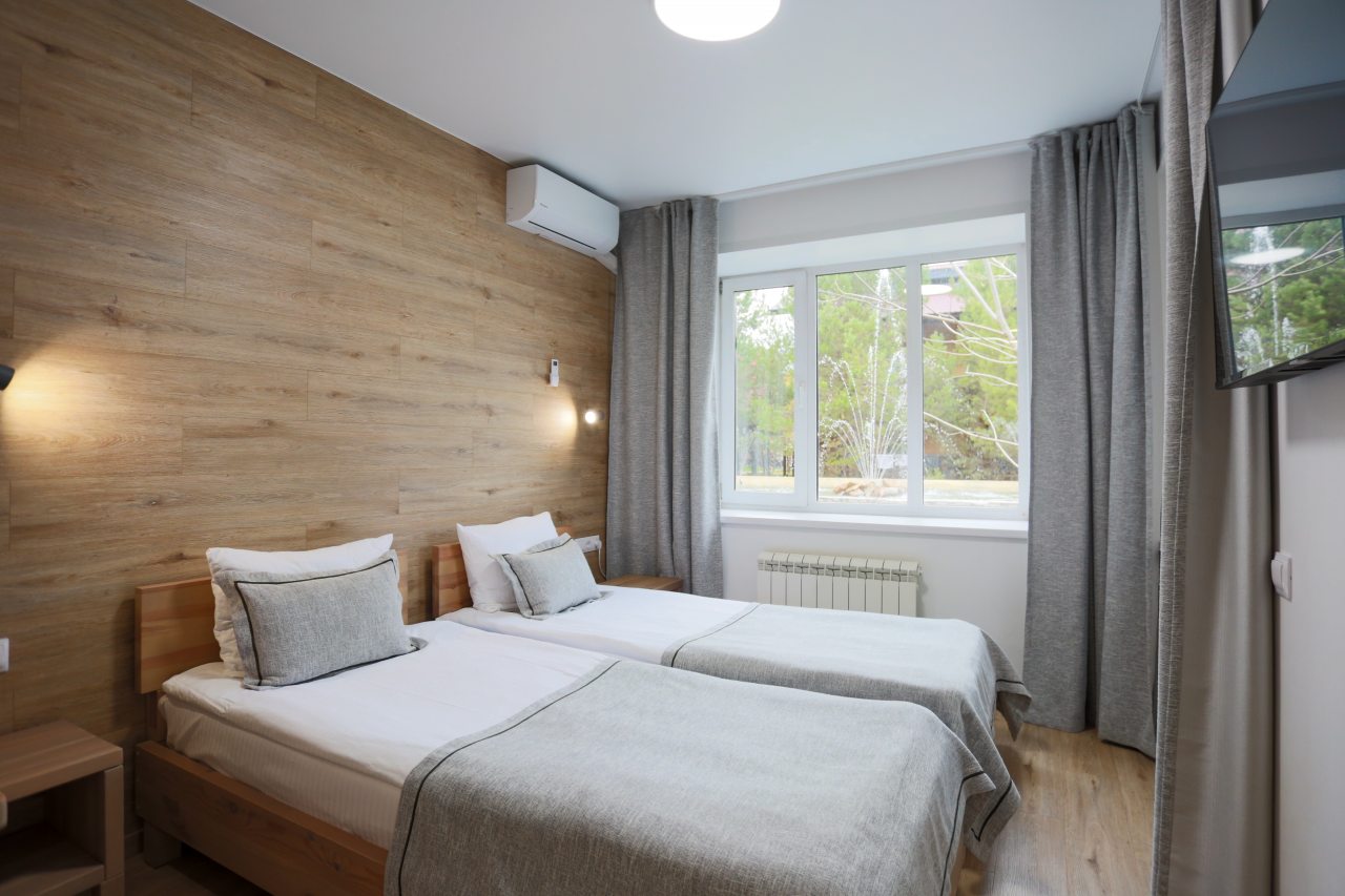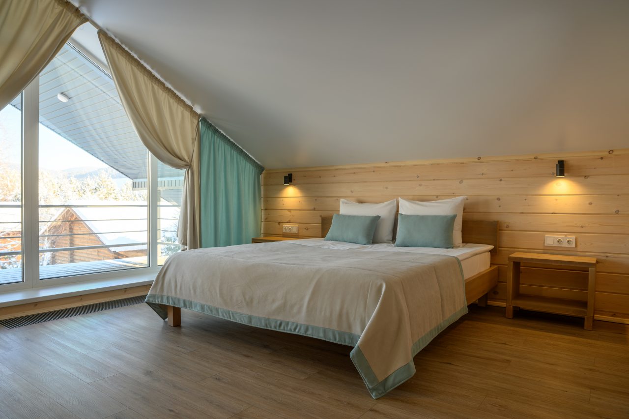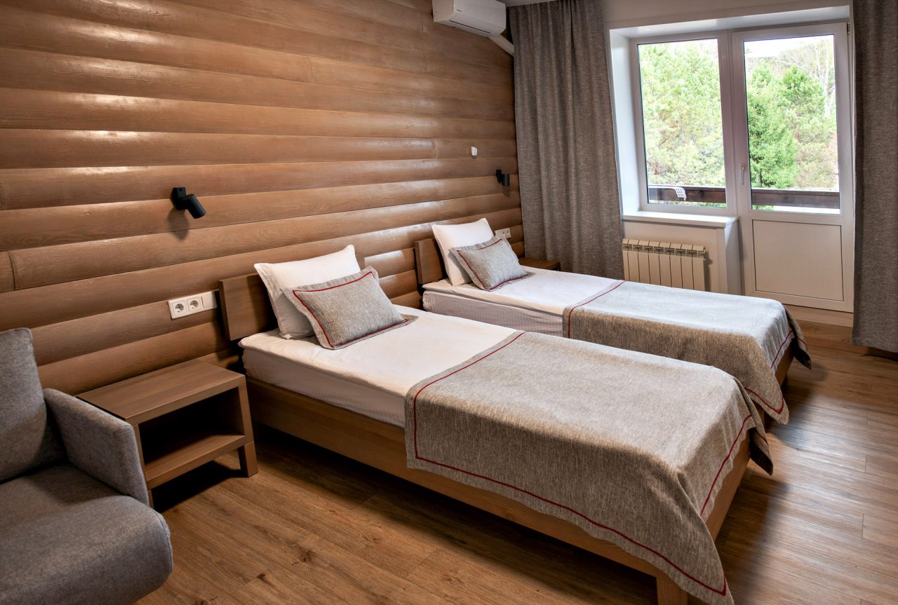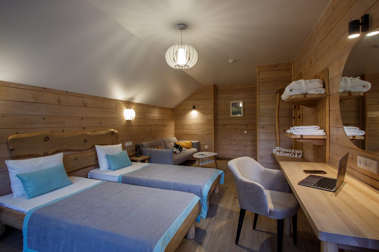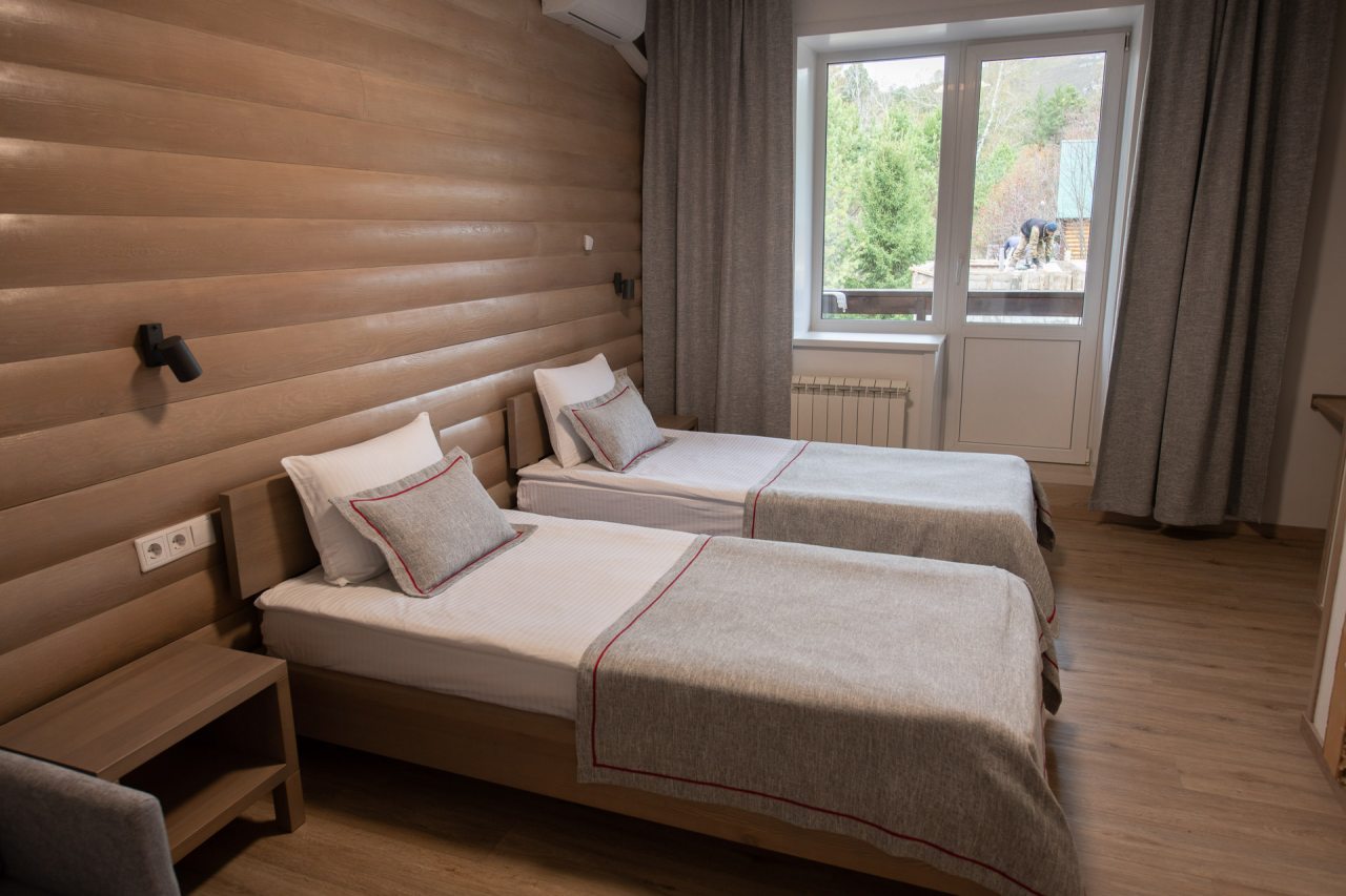 Территория восьми гектаров разделена на отдельные зоны, благодаря чему обеспечивается приватность. Для размещения представлено 39 номеров: роскошные шале, вместительные коттеджи и кедровые домики, построенные из экологически чистых материалов. Каждый из выбранных вариантов оснащен качественной мебелью, техникой и собственной ванной комнатой. Вместительность зависит от выбранной категории — от двух до восьми гостей, что идеально как для пары любых возрастов, так и семей с детьми.