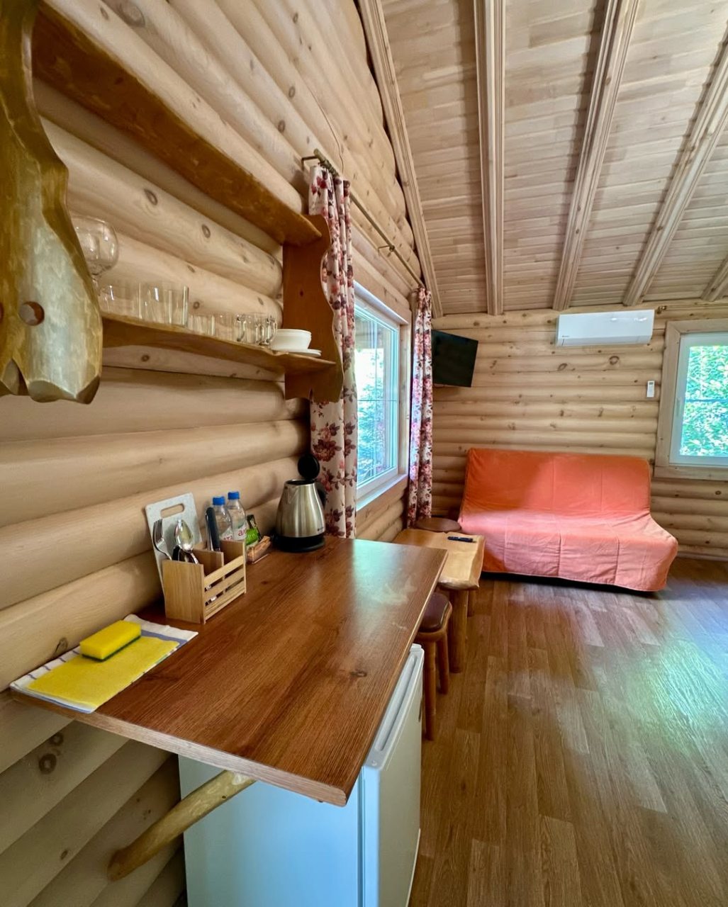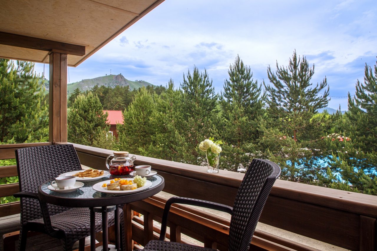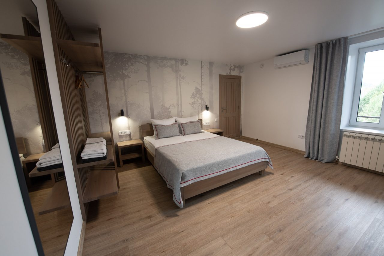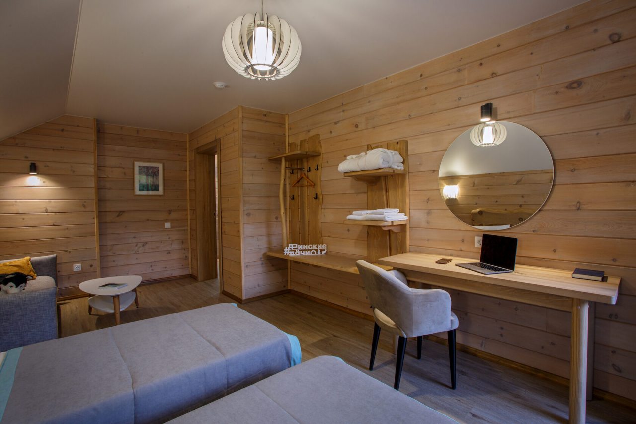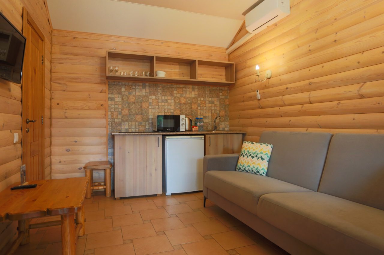 Территория восьми гектаров разделена на отдельные зоны, благодаря чему обеспечивается приватность. Для размещения представлено 39 номеров: роскошные шале, вместительные коттеджи и кедровые домики, построенные из экологически чистых материалов. Каждый из выбранных вариантов оснащен качественной мебелью, техникой и собственной ванной комнатой. Вместительность зависит от выбранной категории — от двух до восьми гостей, что идеально как для пары любых возрастов, так и семей с детьми.