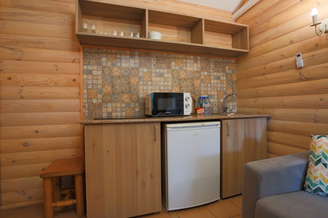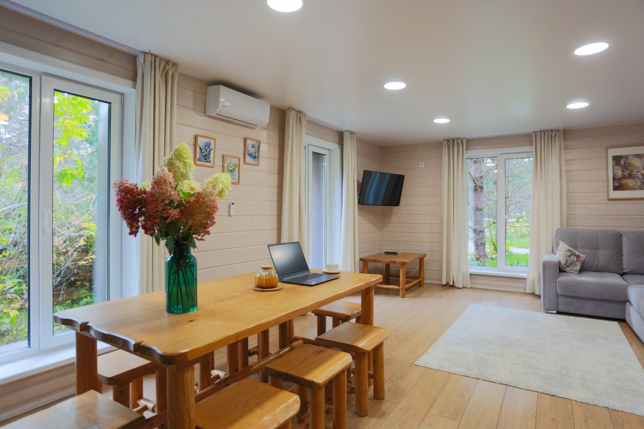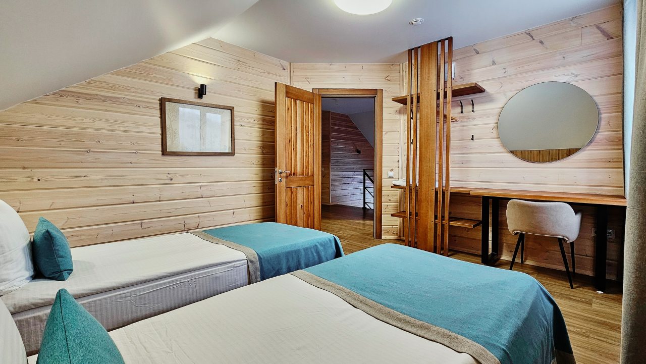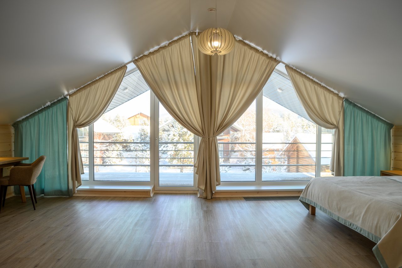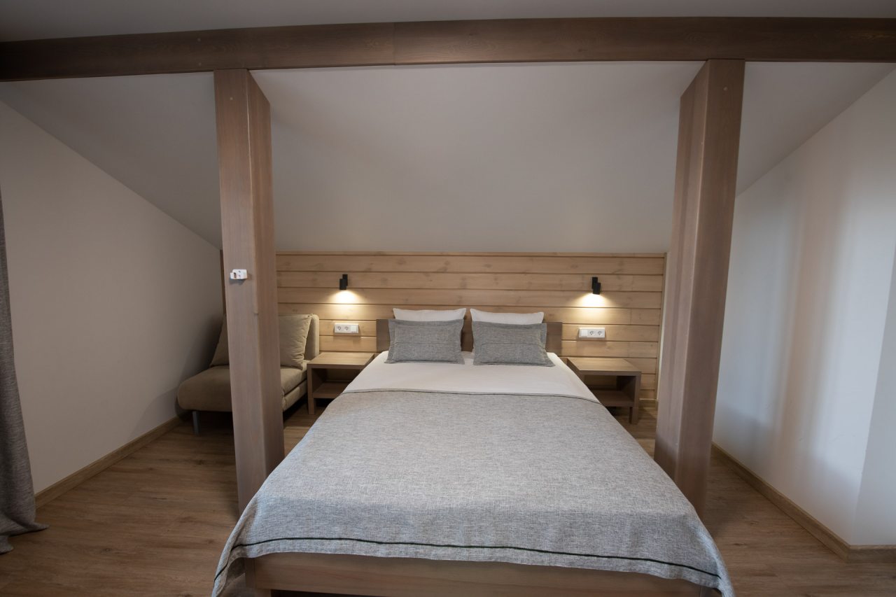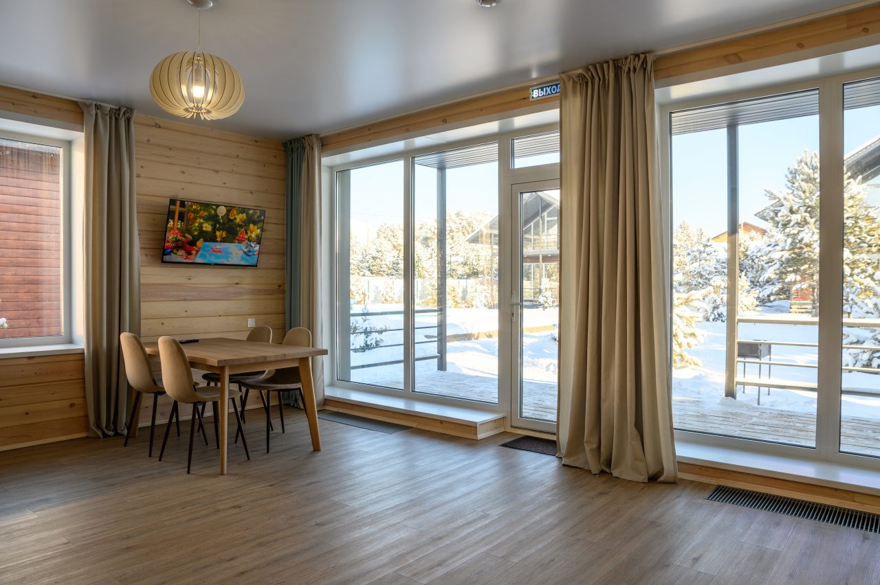 Территория восьми гектаров разделена на отдельные зоны, благодаря чему обеспечивается приватность. Для размещения представлено 39 номеров: роскошные шале, вместительные коттеджи и кедровые домики, построенные из экологически чистых материалов. Каждый из выбранных вариантов оснащен качественной мебелью, техникой и собственной ванной комнатой. Вместительность зависит от выбранной категории — от двух до восьми гостей, что идеально как для пары любых возрастов, так и семей с детьми.
