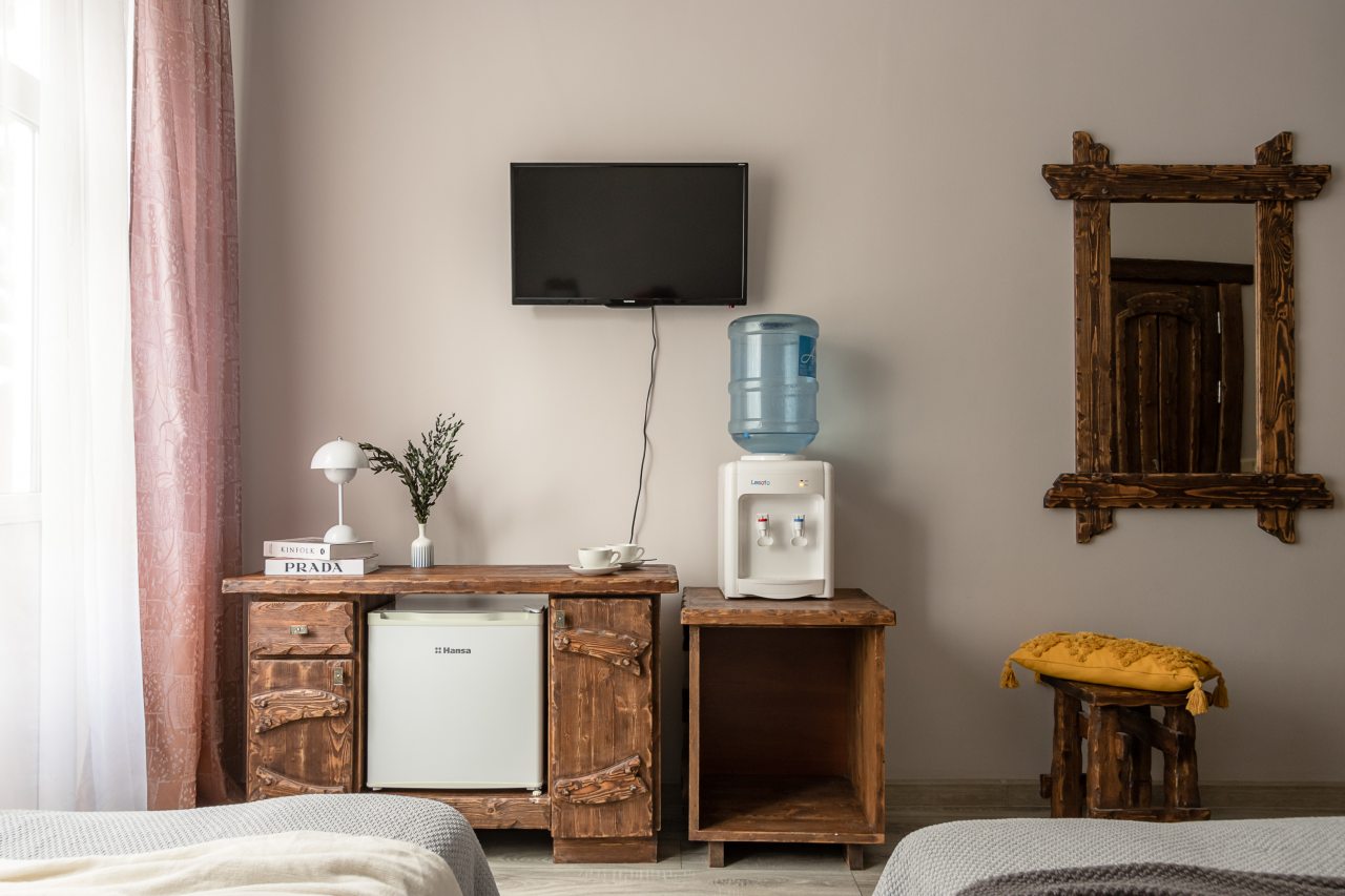Для организации перекусов в номерах установлен кулер с питьевой водой, имеется небольшой холодильник и стаканы. Поблизости работают супермаркеты.