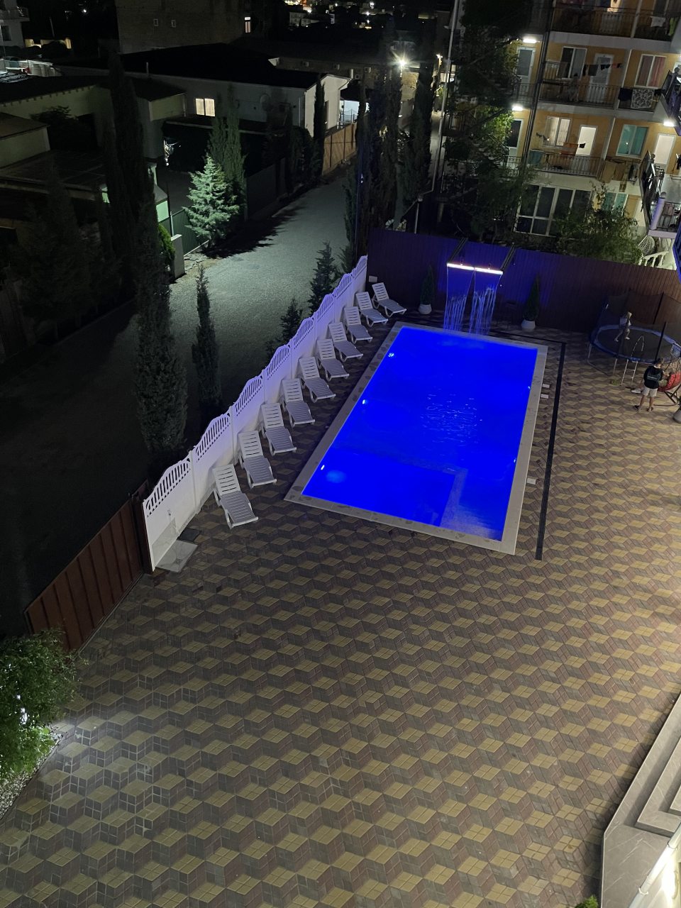 Номер чистый, достаточно уютный. Прекрасно работает душ, кондиционер. Красивый вид с общего балкона. Во дворе есть каркасный бассейн, уютные кресла, общая кухня, парковочные места.