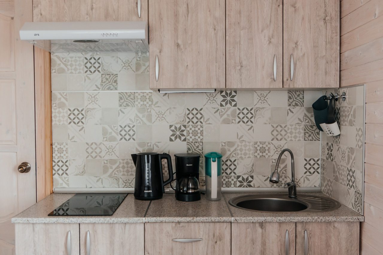 Кухонная зона оснащена всей необходимой бытовой техникой, включая посудомоечную машину и тостер.