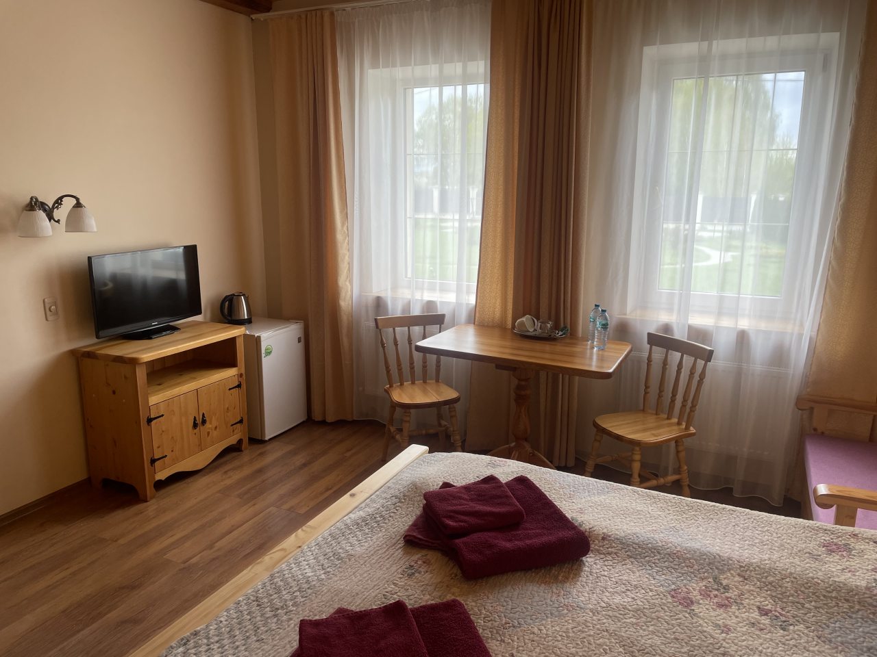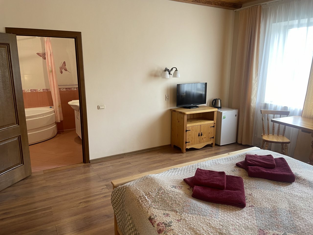 Отель представляет из себя настоящий русский терем, какие, видимо, были в старину. Внутри тоже все сделано по-настоящему под старину, но в тоже время современная качественная техника, чистая красивая ванная комната. Номер просторный, светлый. Все очень понравилось, особенная добрая атмосфера в этих стенах.