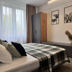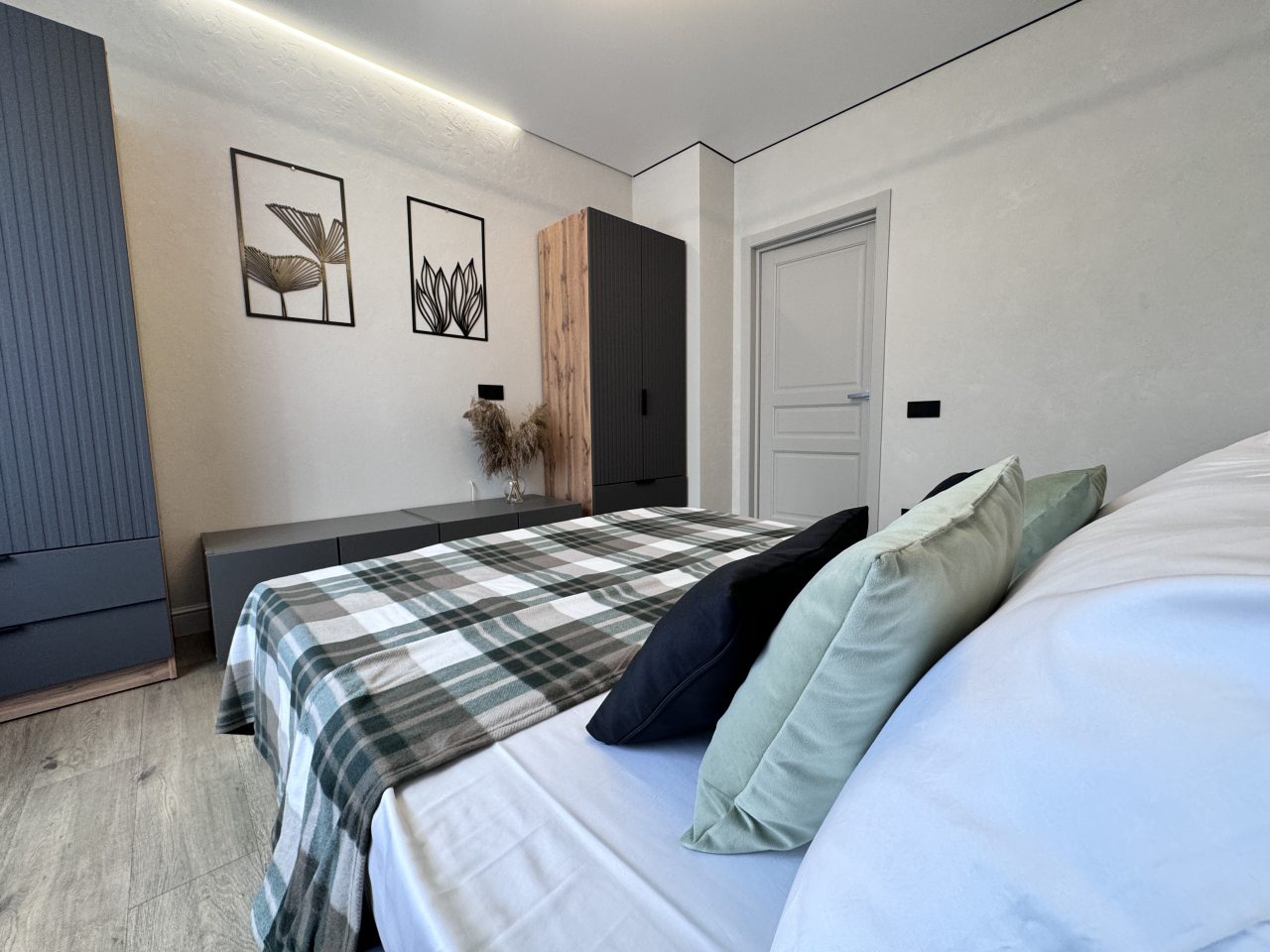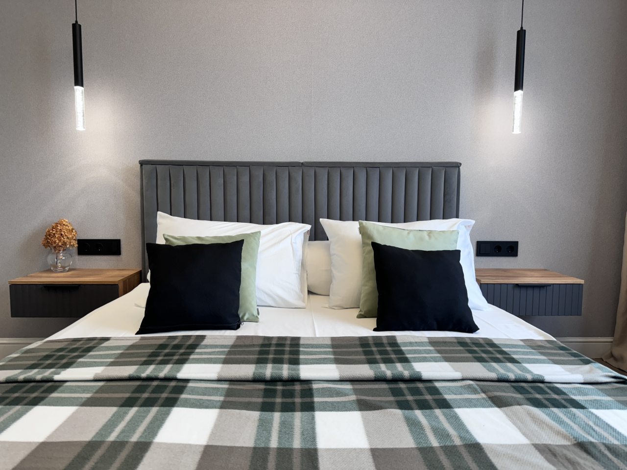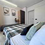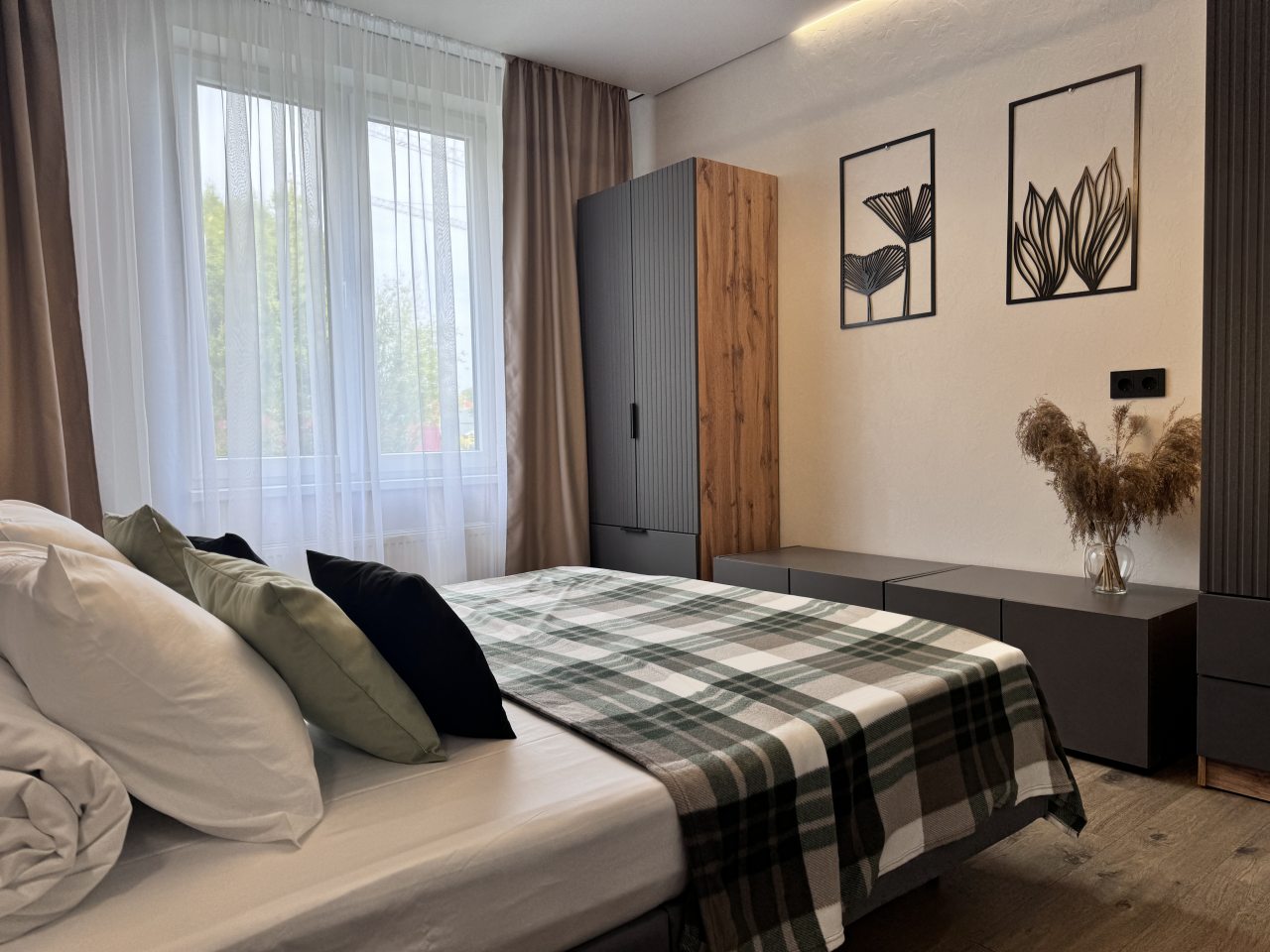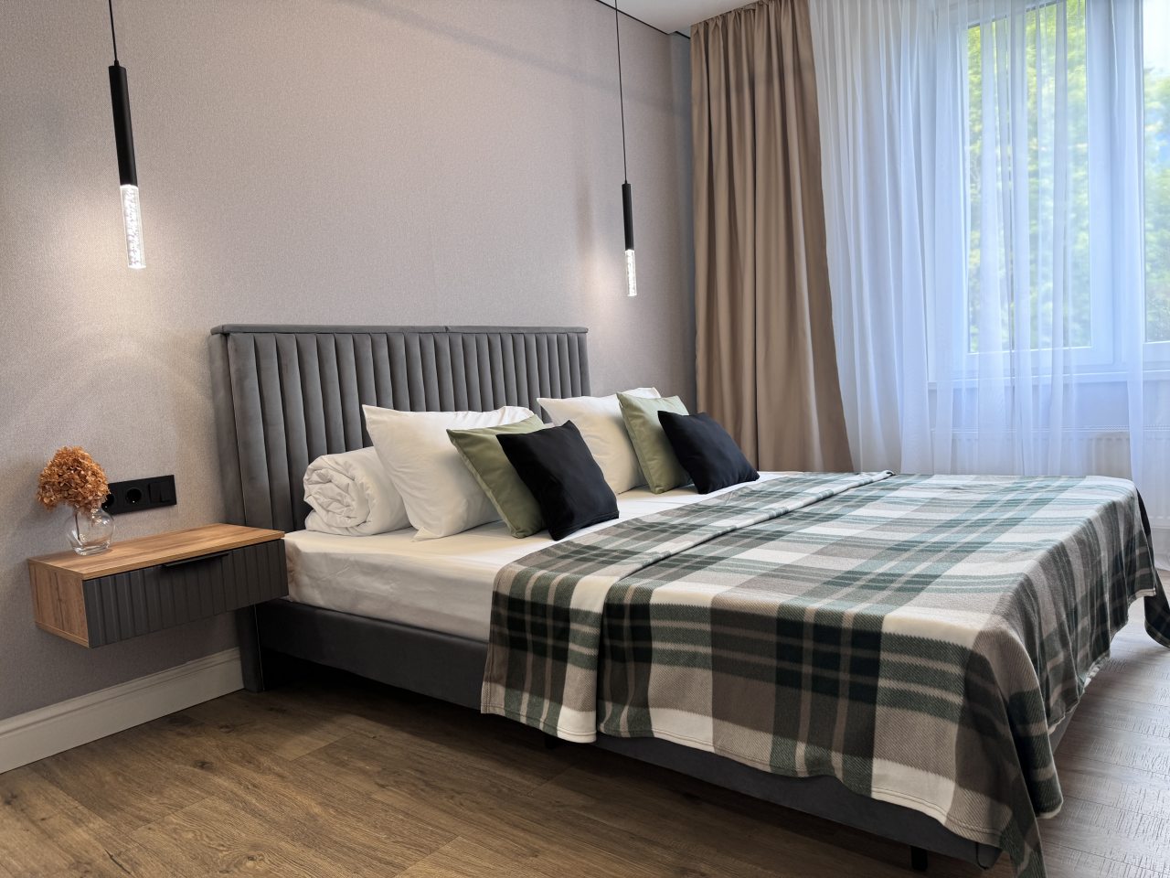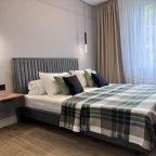 Дизайнерские стильные апартаменты готовы ко встрече с гостями города. Они оснащены удобной кроватью с ортопедическим матрасом, зеркалом, шкафом для хранения вещей, плотными шторами, которые способствуют качественному сну. Также установлены светильники, журнальный столик и телевизор. В ванной комнате есть все необходимые принадлежности для душа, стиральная машина и комплект полотенец.