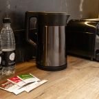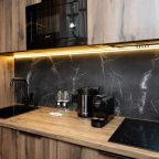 Кухонная зона оснащена комплектом гарнитура, кофемашиной, холодильником, микроволновой печью, электрочайником, варочной панелью и набором посуды. Пообедать можно в одном из ближайших кафе.