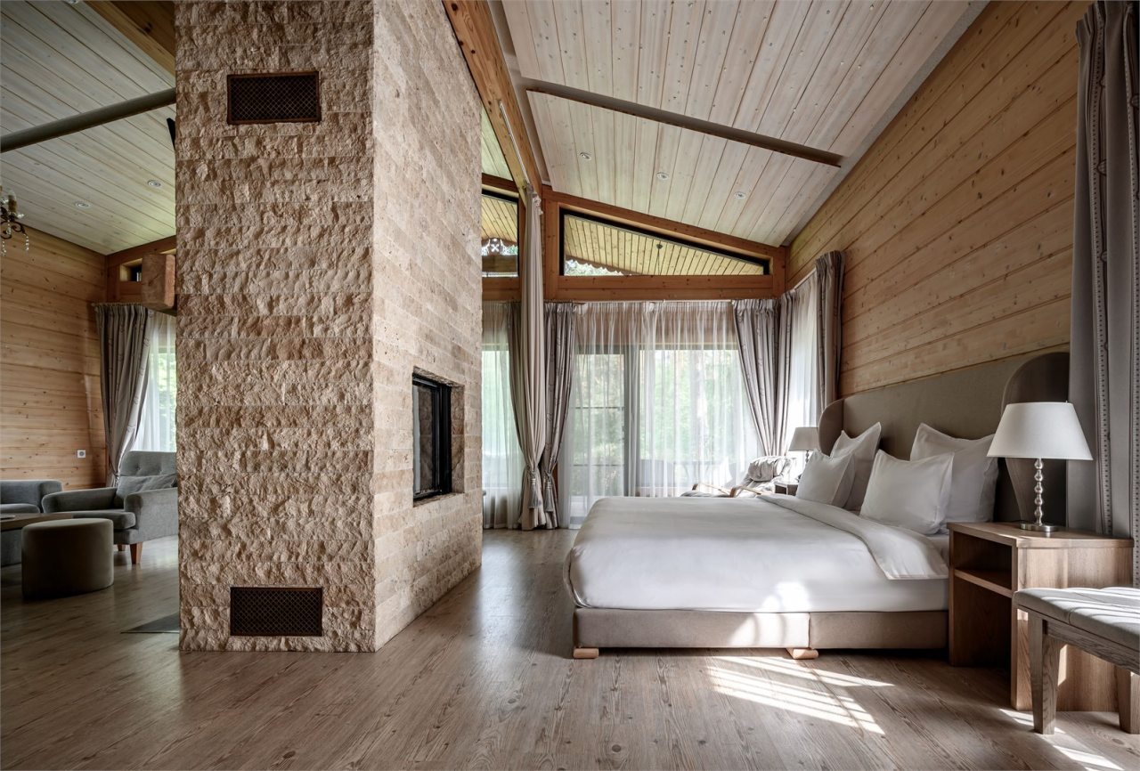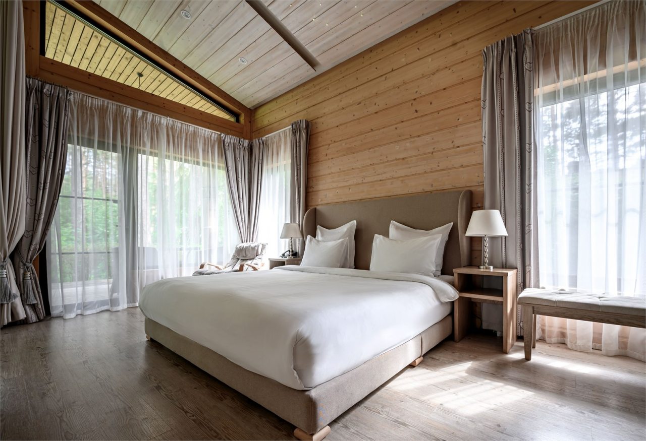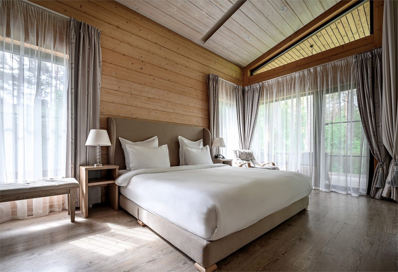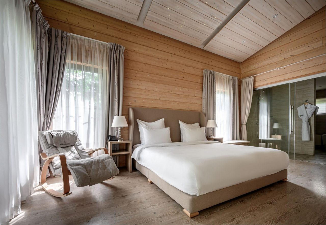 Отельный комплекс красивый, комфортный. В номере сделан хороший ремонт, отделка деревянная, при этом современная и стильная мебель присутствует. Досуг здесь предоставлен на любой вкус, но преимущественно активный. Можно покататься на велосипедах, погулять. Wi-fi работает практически на всей теории. Есть своя баня, тренажерный зал. Мы обязательно вернемся сюда снова.