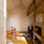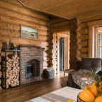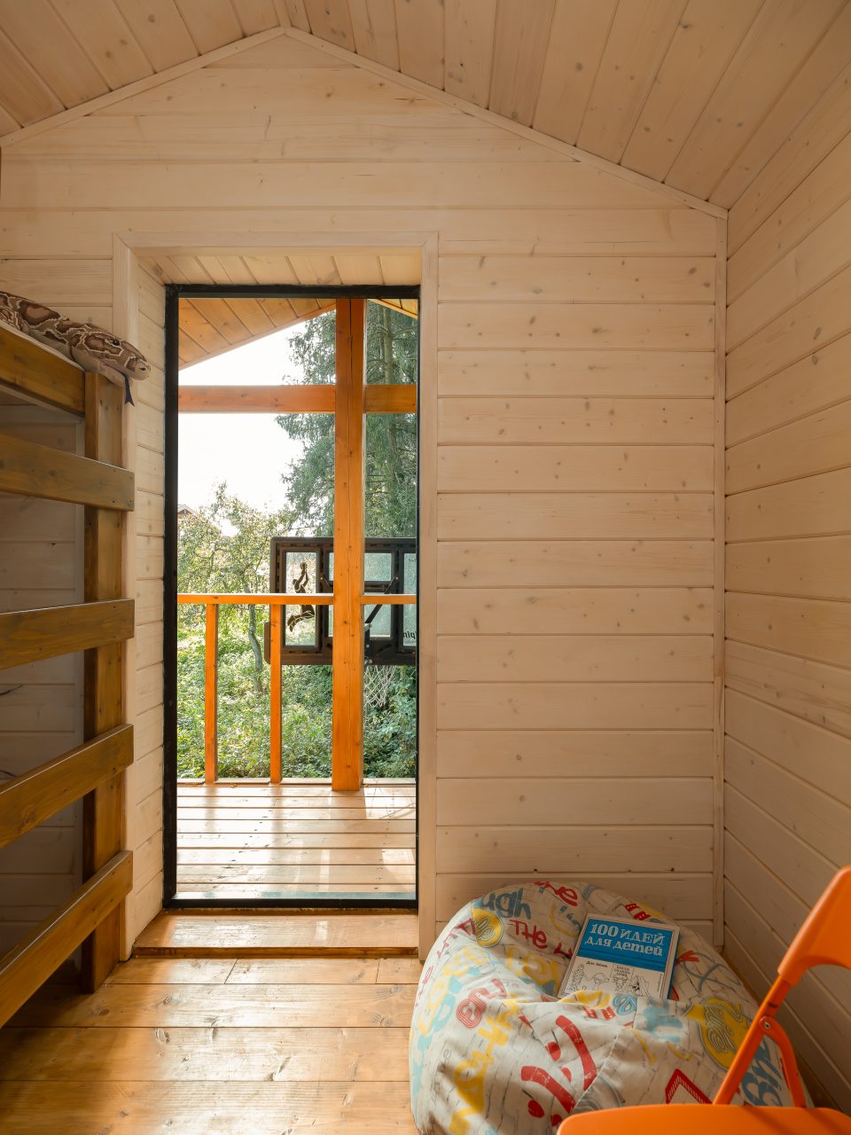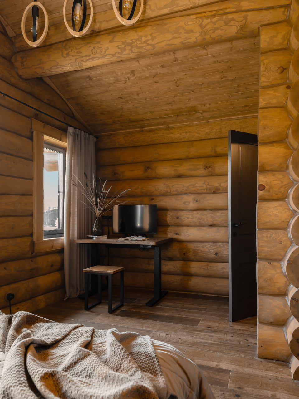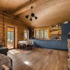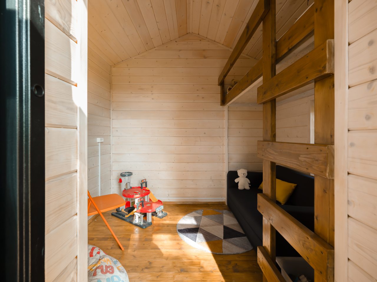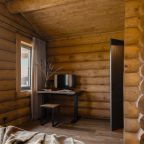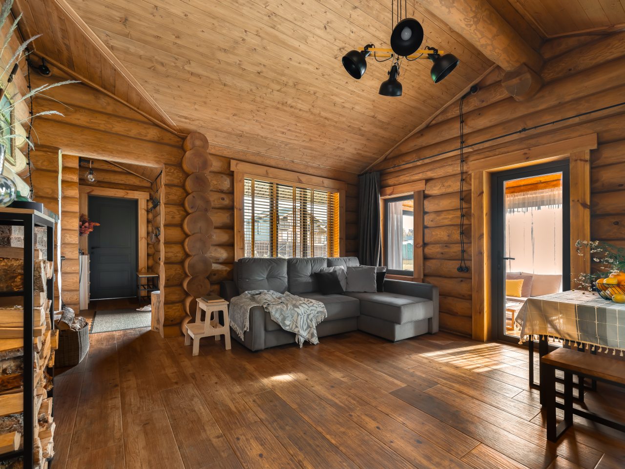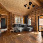 Внутри есть как спальня с удобной двуспальной кроватью, так и детская с диваном и односпальной кроватью. Также имеется уютная зона отдыха с вместительным диваном и печью. Санузел укомплектован полотенцами, стиральной машиной и необходимой сантехникой.