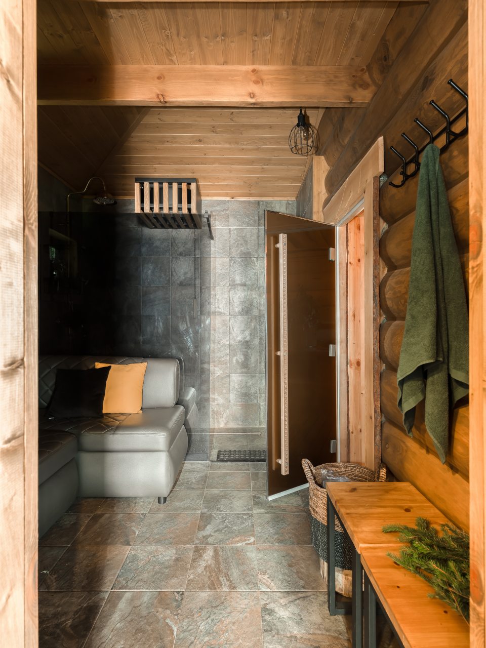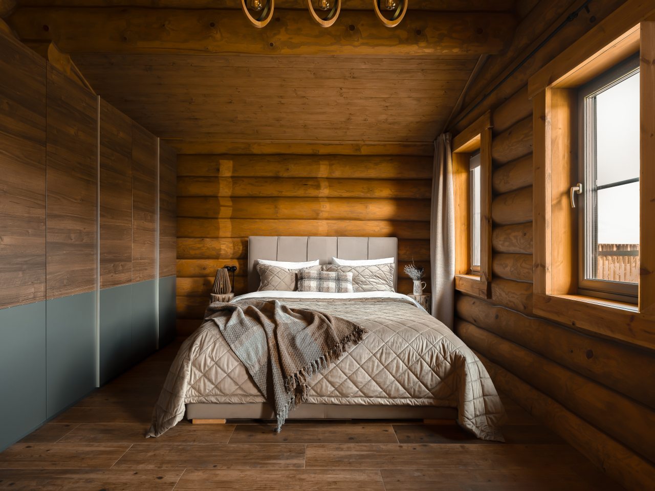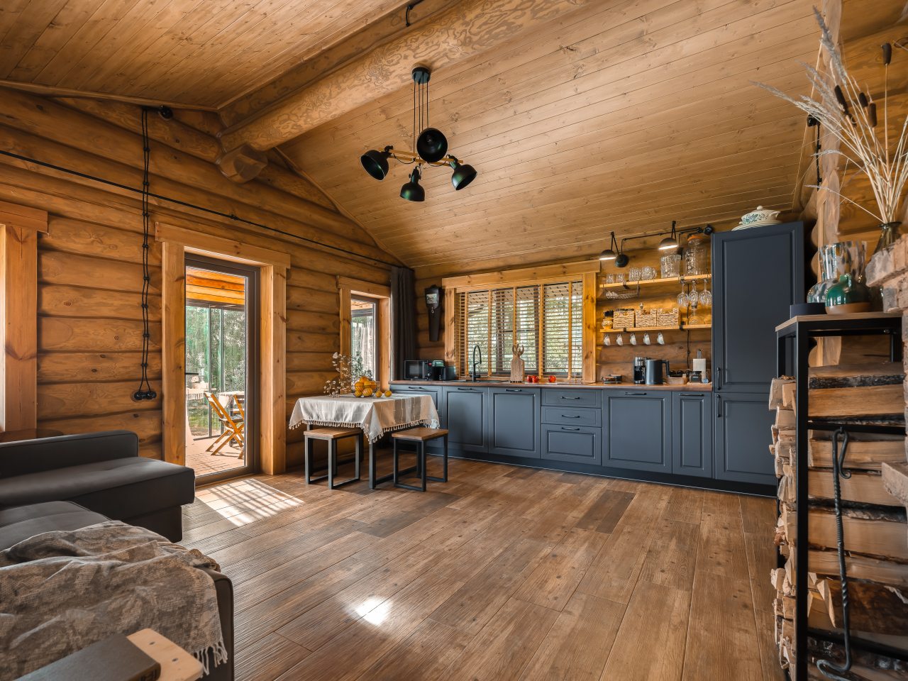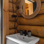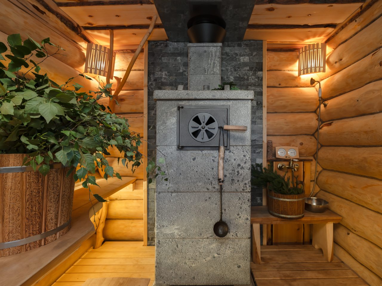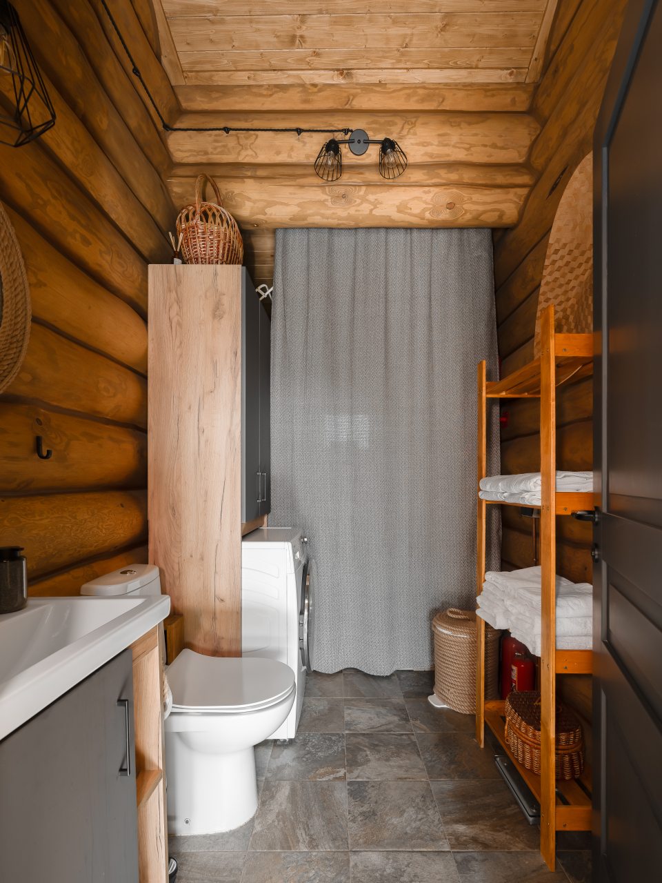 Внутри есть как спальня с удобной двуспальной кроватью, так и детская с диваном и односпальной кроватью. Также имеется уютная зона отдыха с вместительным диваном и печью. Санузел укомплектован полотенцами, стиральной машиной и необходимой сантехникой.