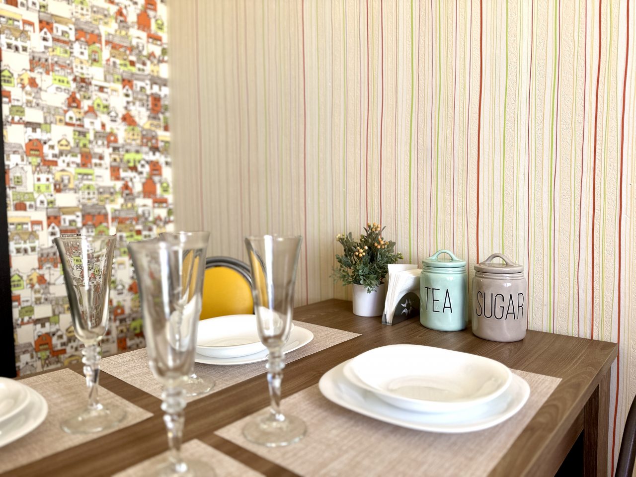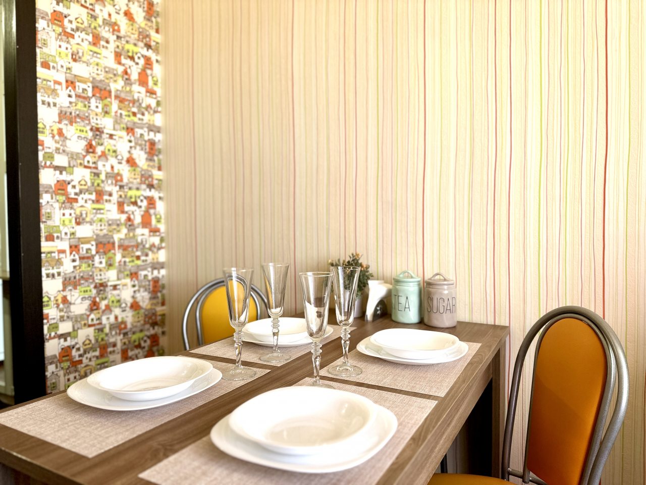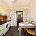 На уютной кухне есть все необходимое для самостоятельного приготовления еды: плита, микроволновая печь, чайник, холодильник, а также набор посуды и столовых приборов.