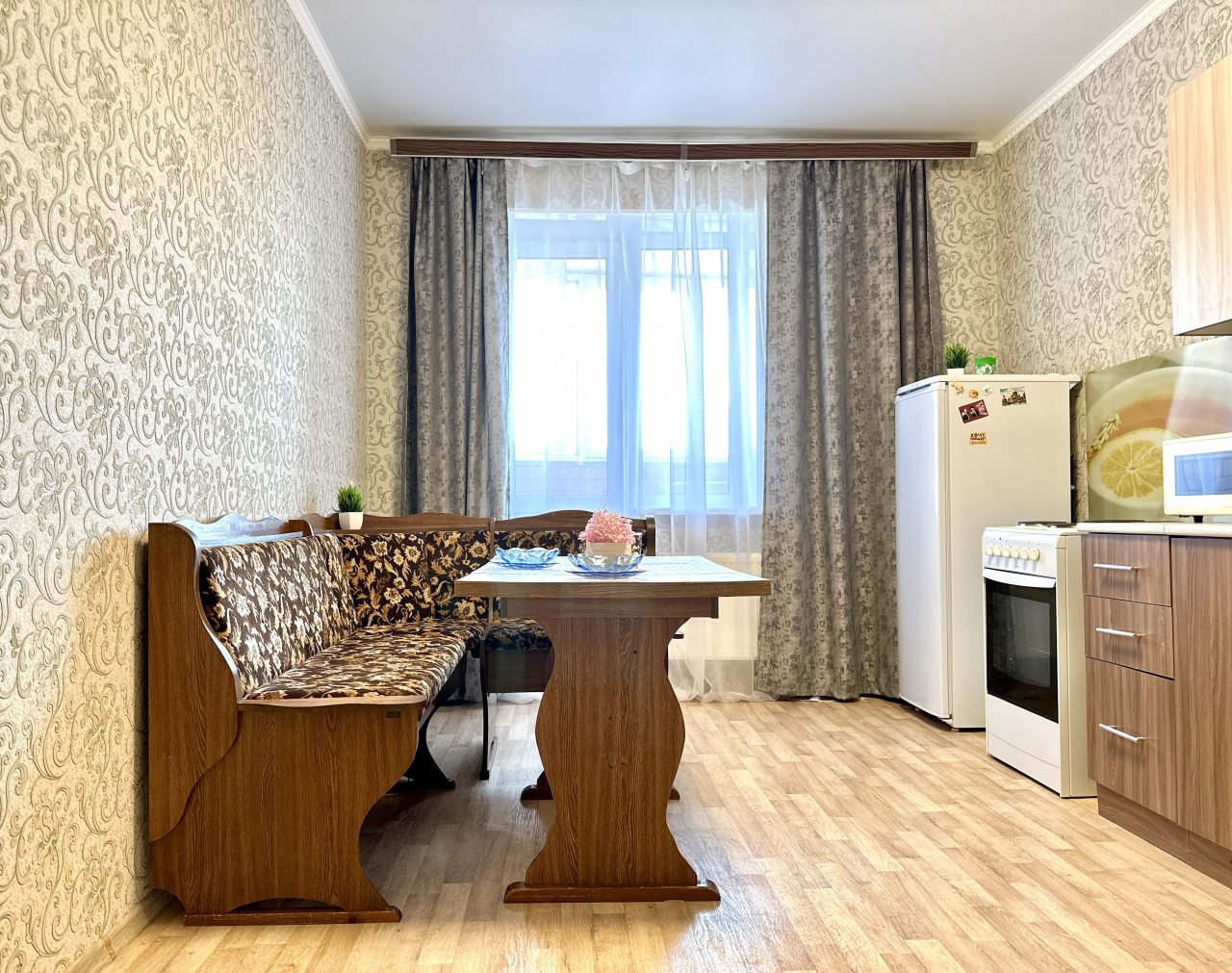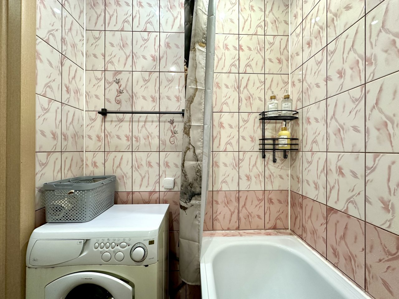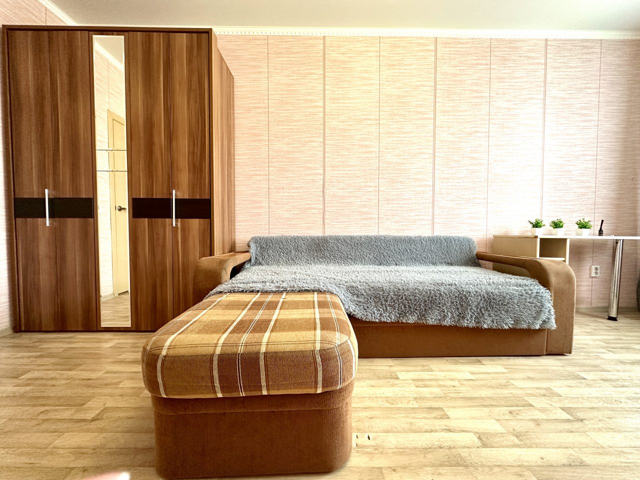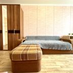 Интерьер апартаментов оформлен в современном стиле и в оснащение входит удобная мебель и техника: диван, телевизор для просмотров любимых передач, вместительный шкаф. В ванной комнате установлена стиральная машина и есть косметические средства.