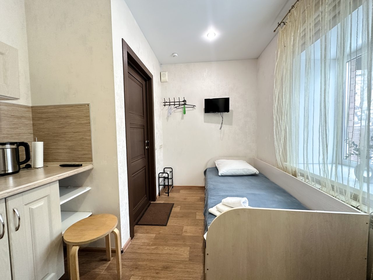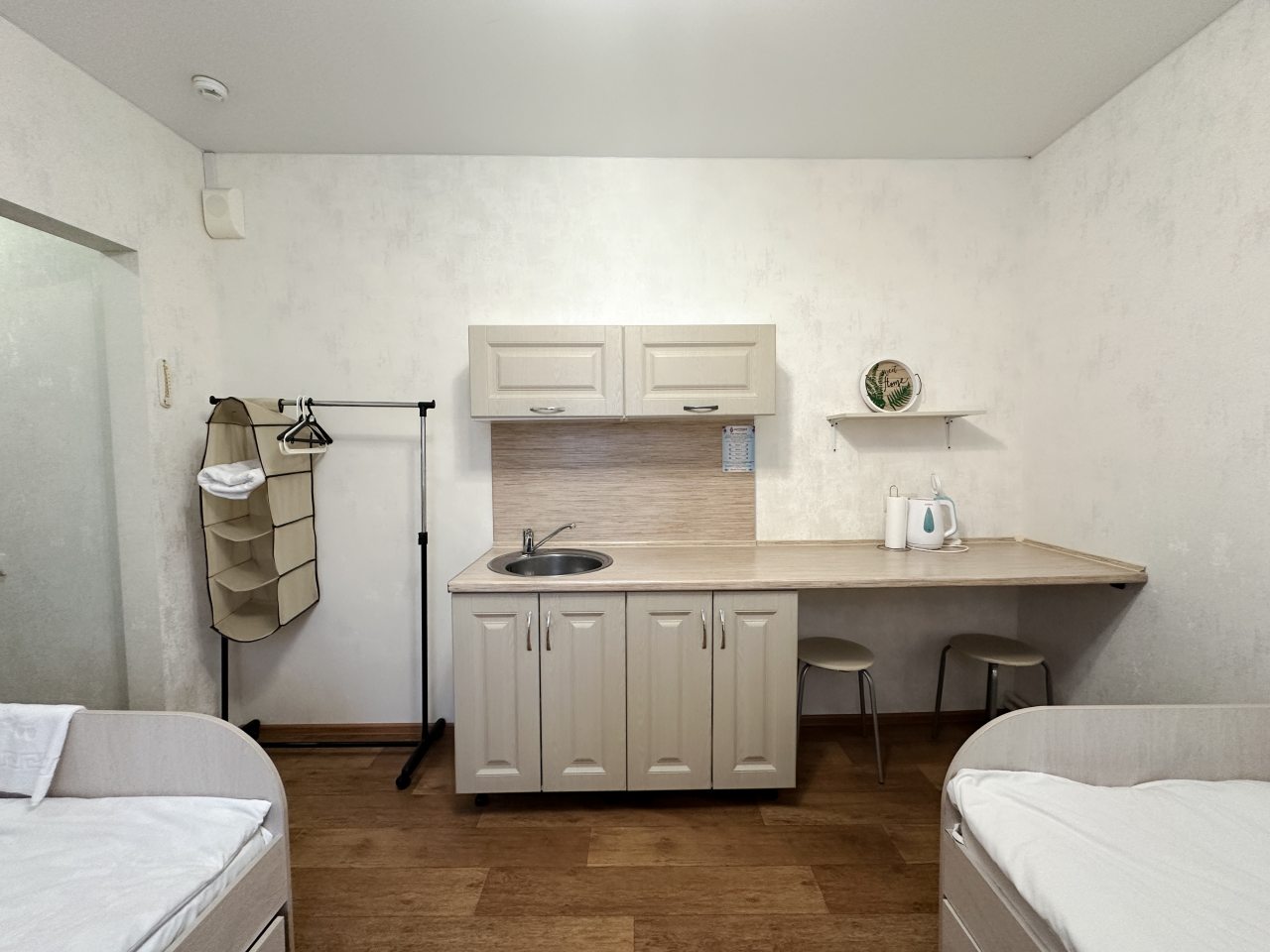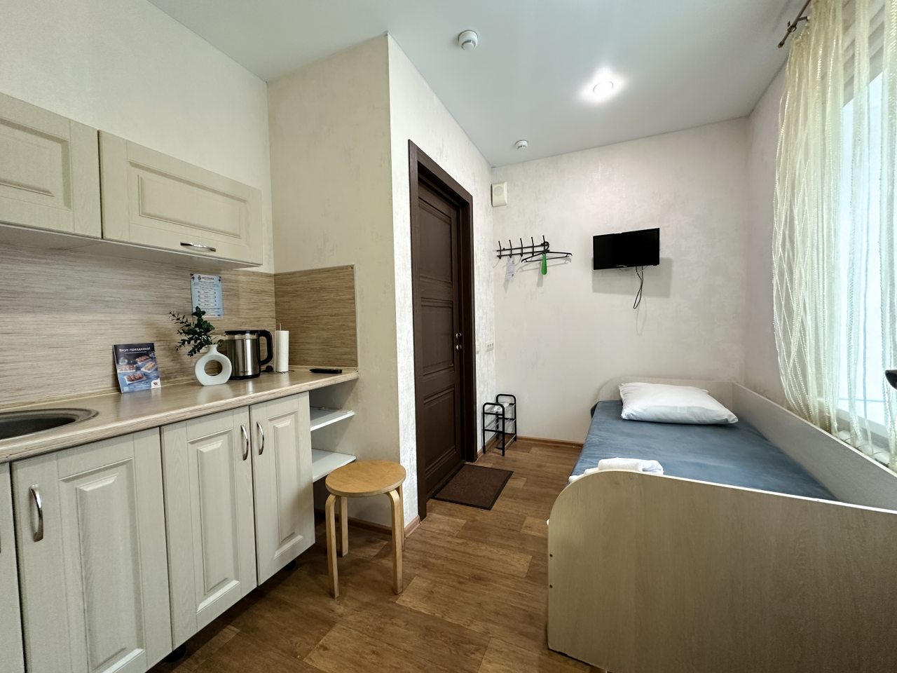 Есть мини-кухня с плитой, холодильником, раковиной, где можно готовить еду самостоятельно. До продуктового магазина можно дойти за пару минут.