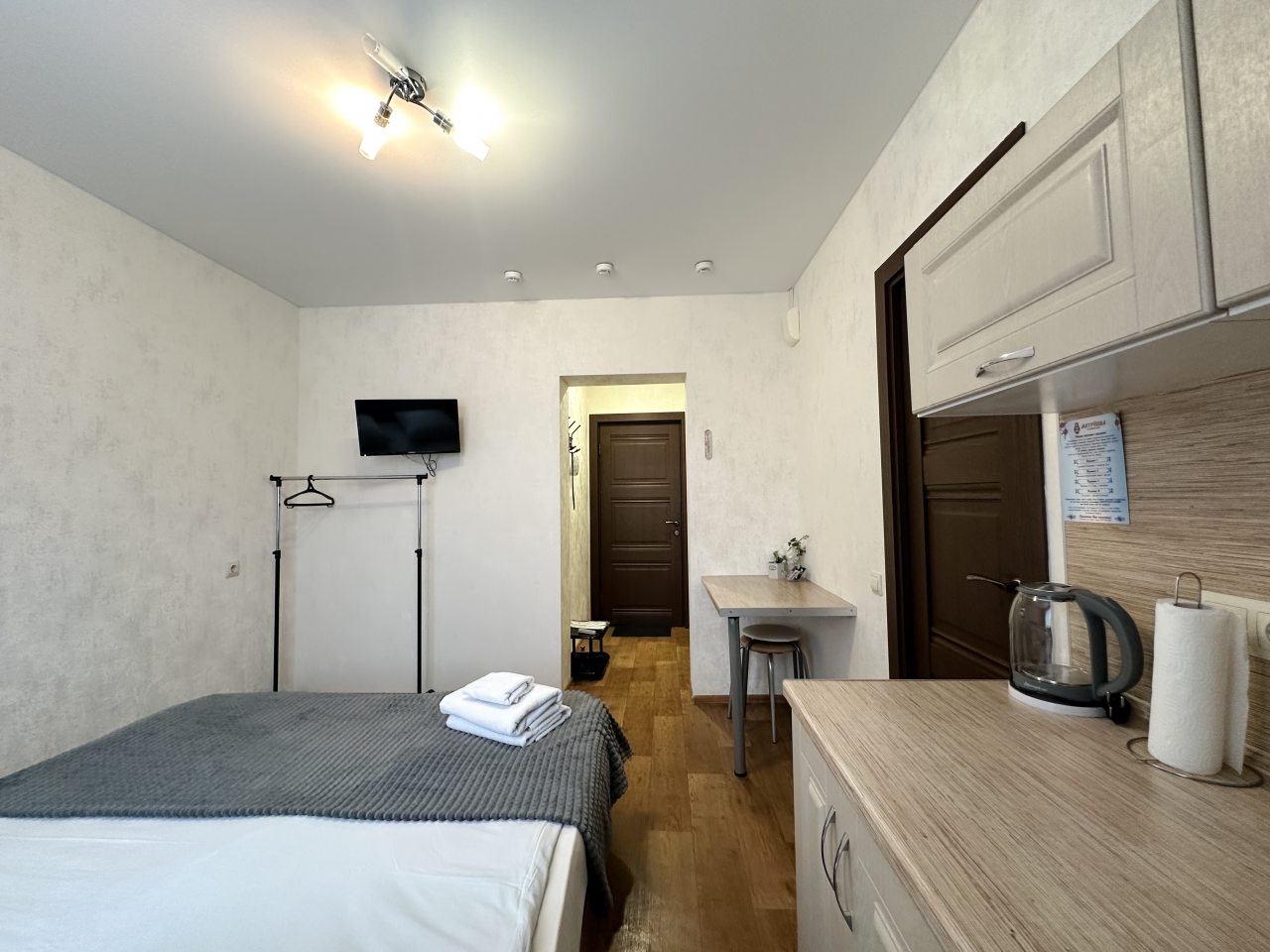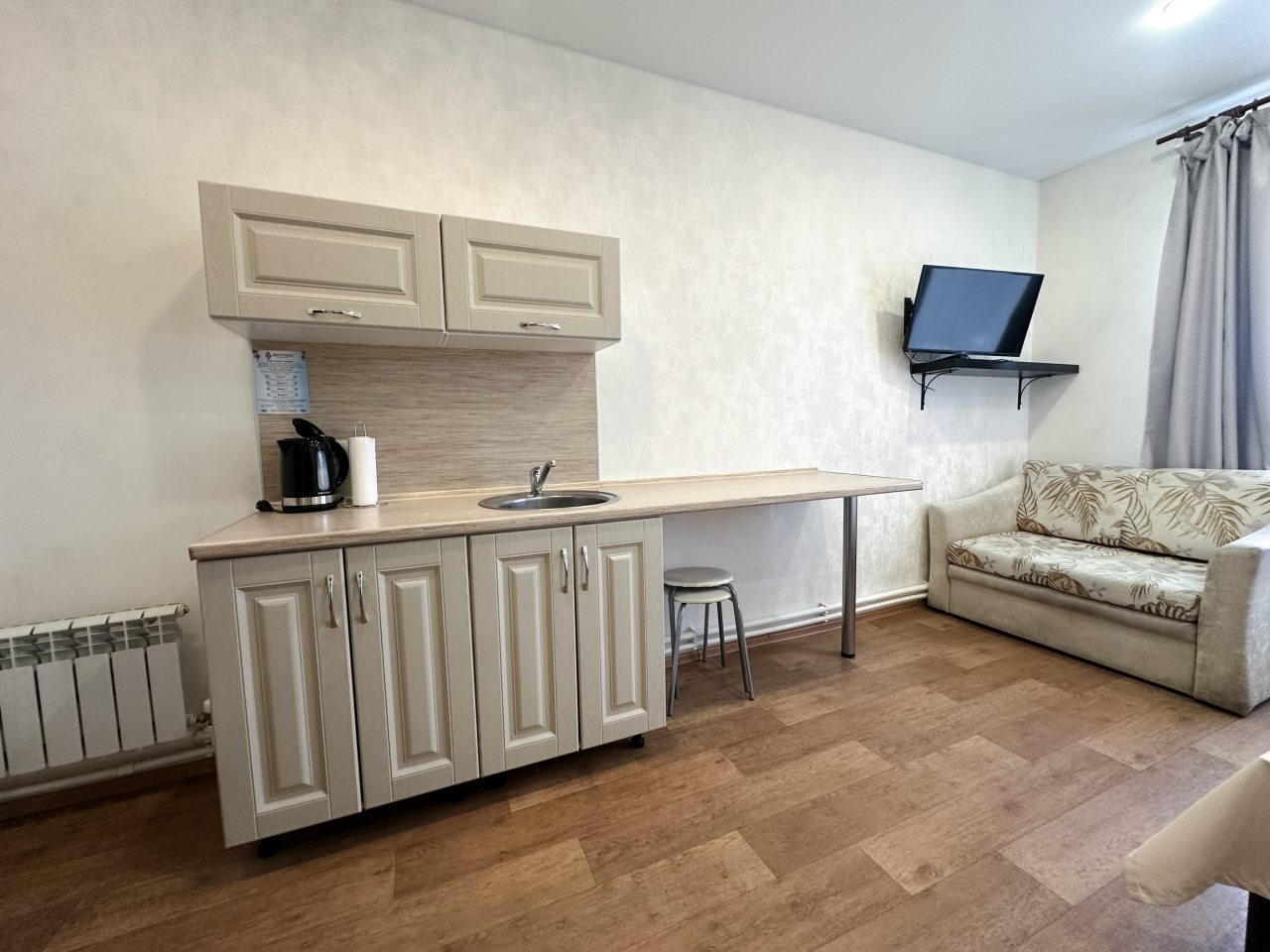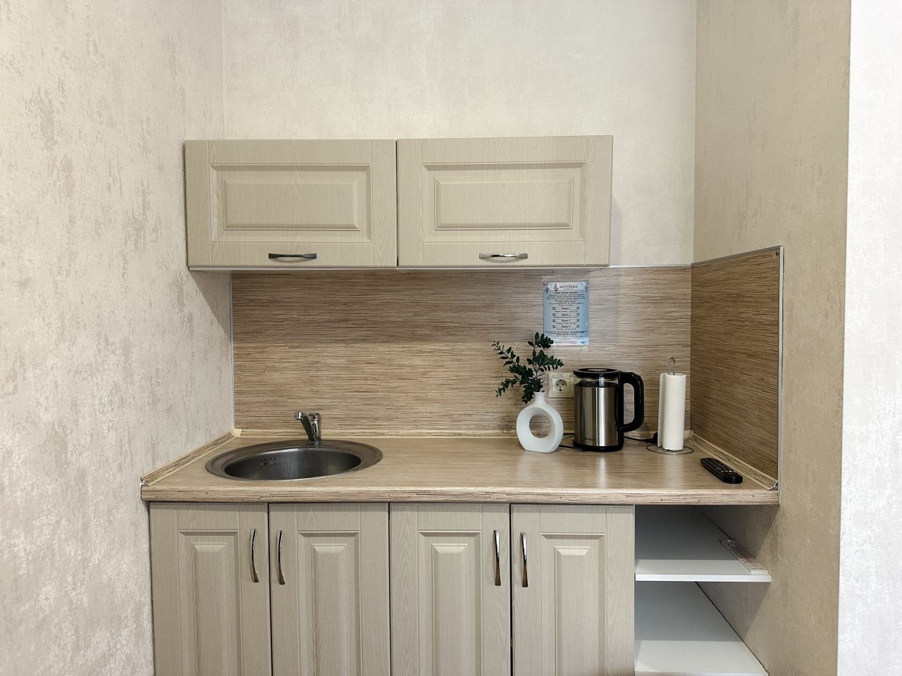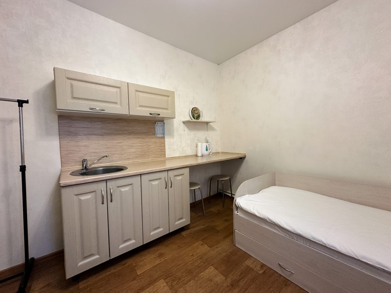 Есть мини-кухня с плитой, холодильником, раковиной, где можно готовить еду самостоятельно. До продуктового магазина можно дойти за пару минут.