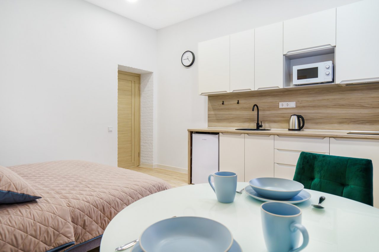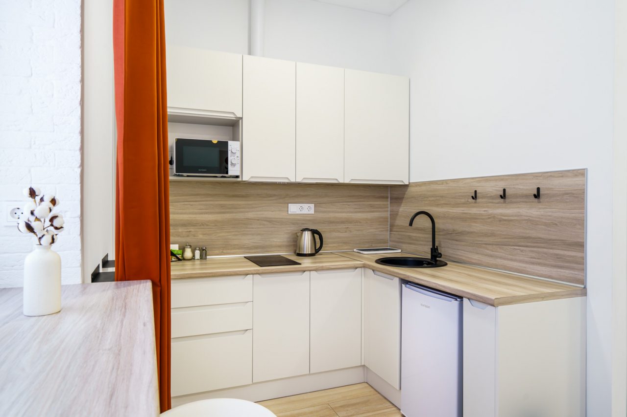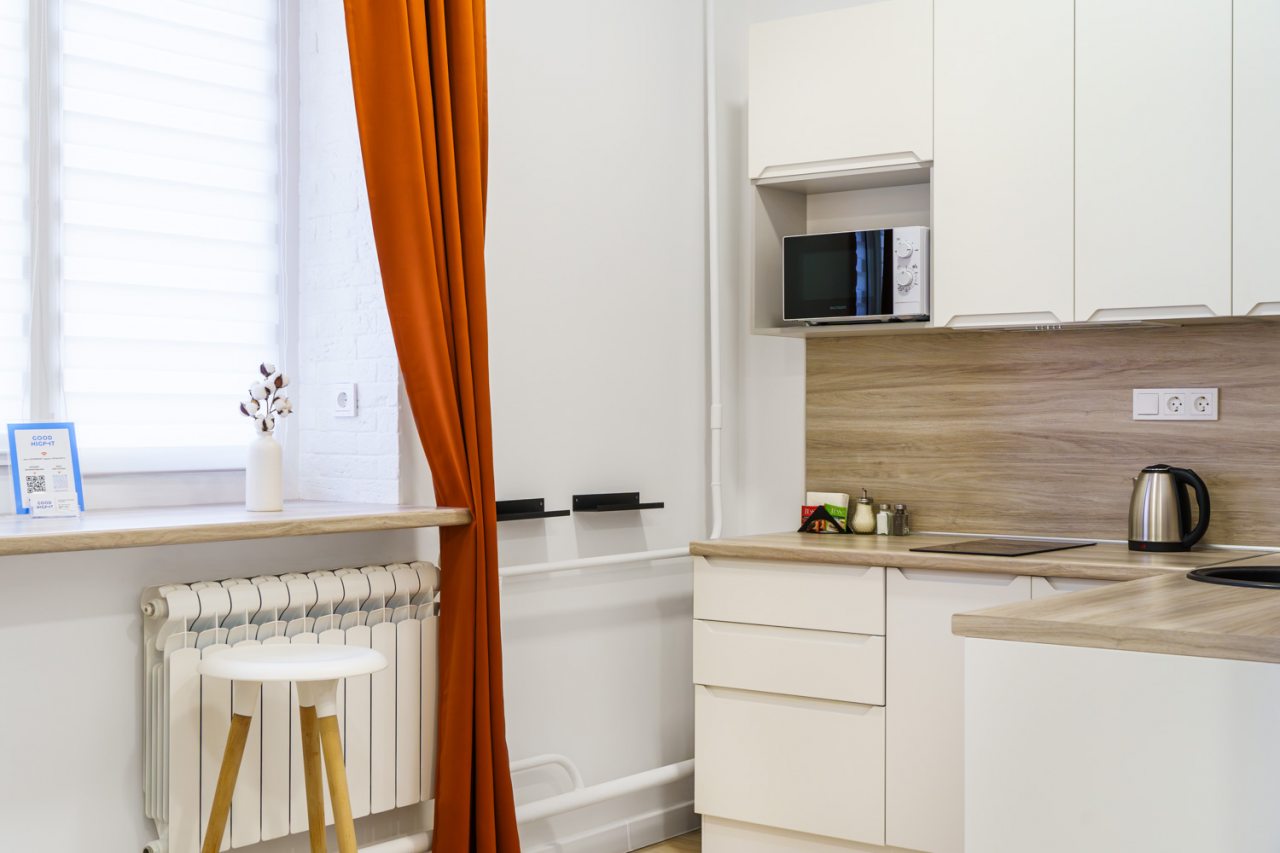 Кухня полностью оборудована всем необходимым, включая плиту, холодильник и микроволновую печь. Для ценителей гастрономии в шаговой доступности находятся разнообразные кафе и рестораны, где можно попробовать различные блюда.