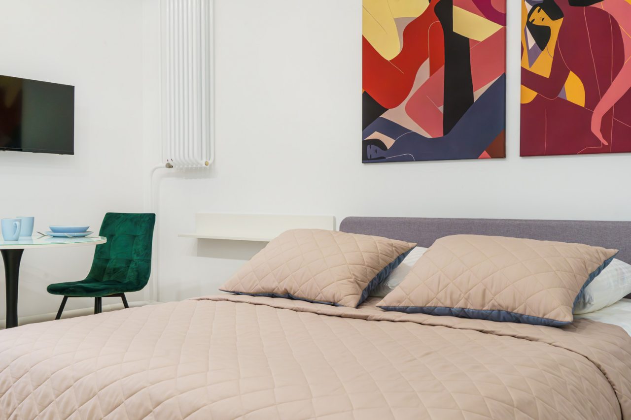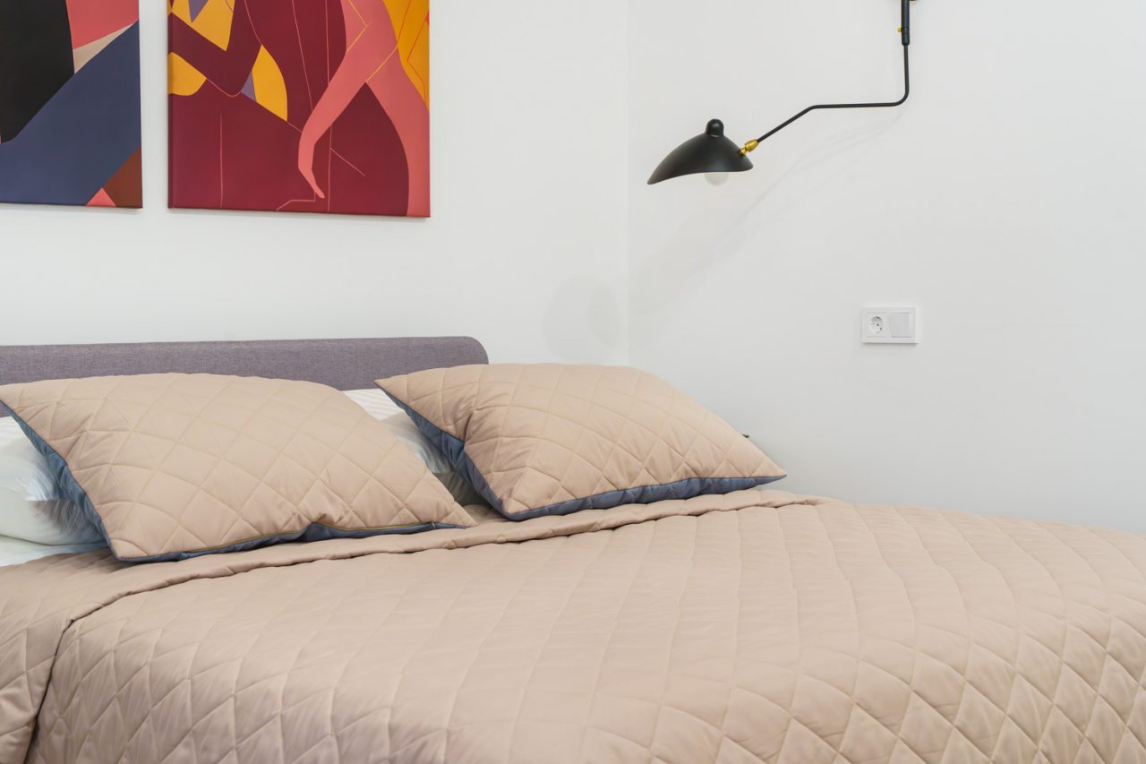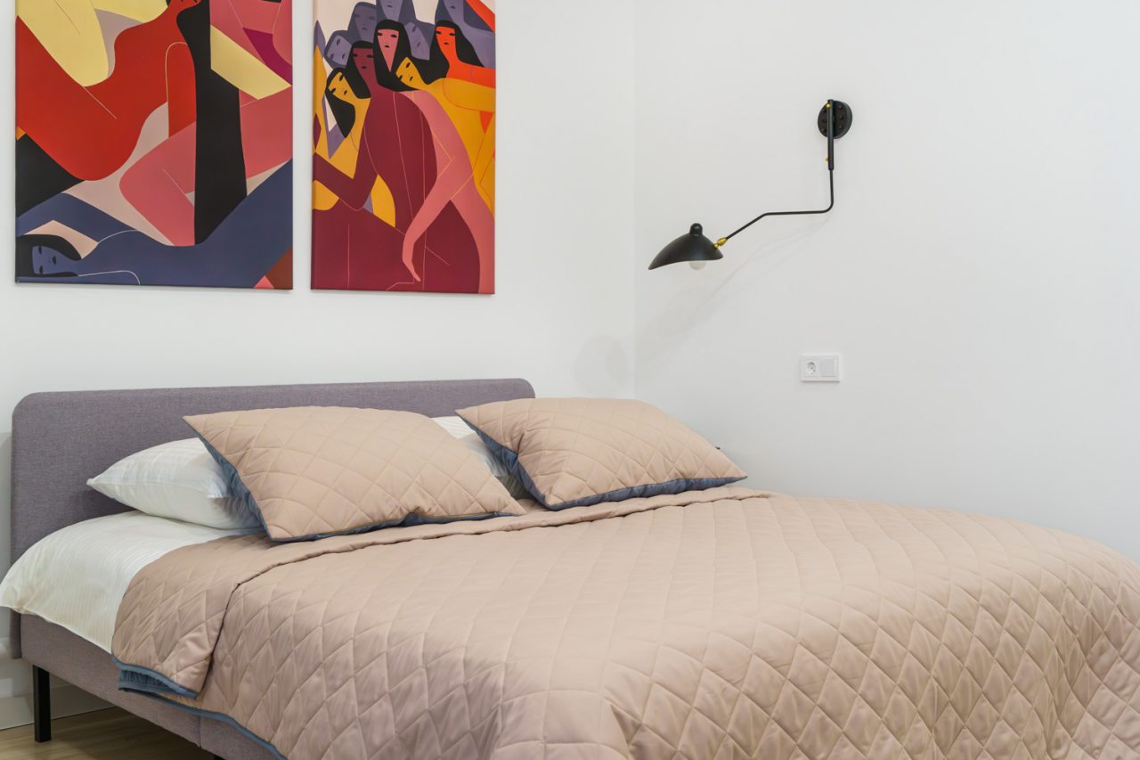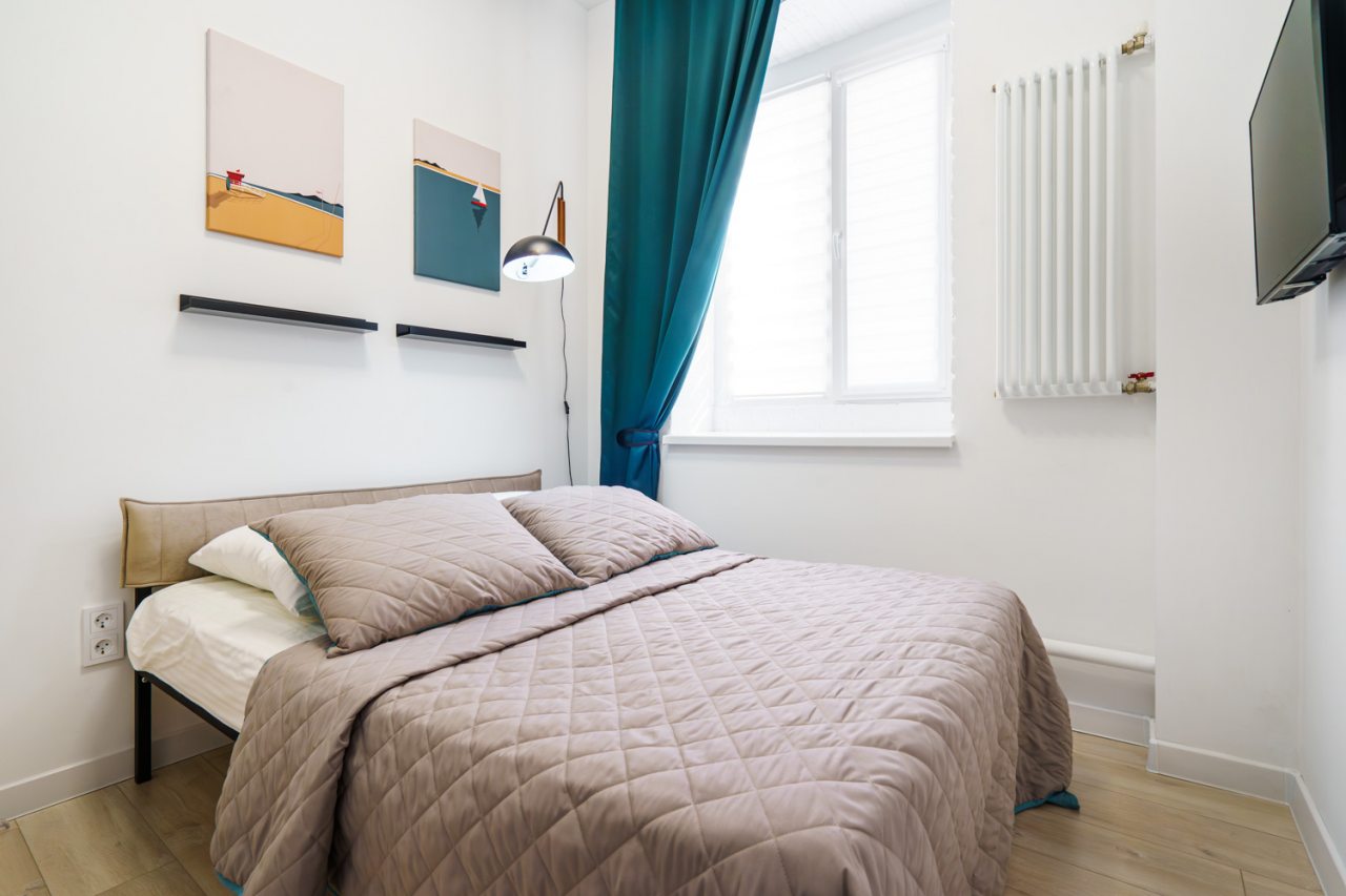 Квартира отличается современным дизайном и вниманием к деталям. Просторные комнаты наполнены светом, создавая приятную атмосферу для отдыха. Удобная кровать позволяет расслабиться после насыщенного дня, а продуманные элементы декора добавляют уюта.