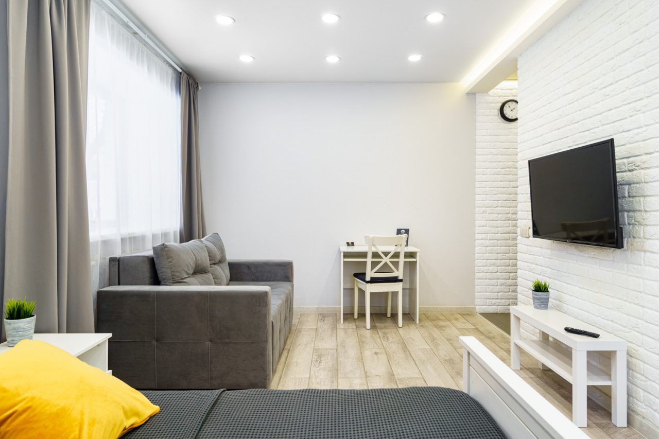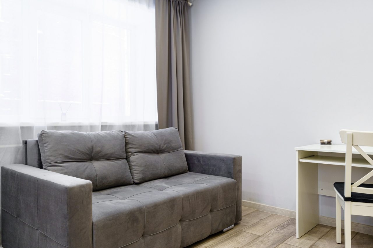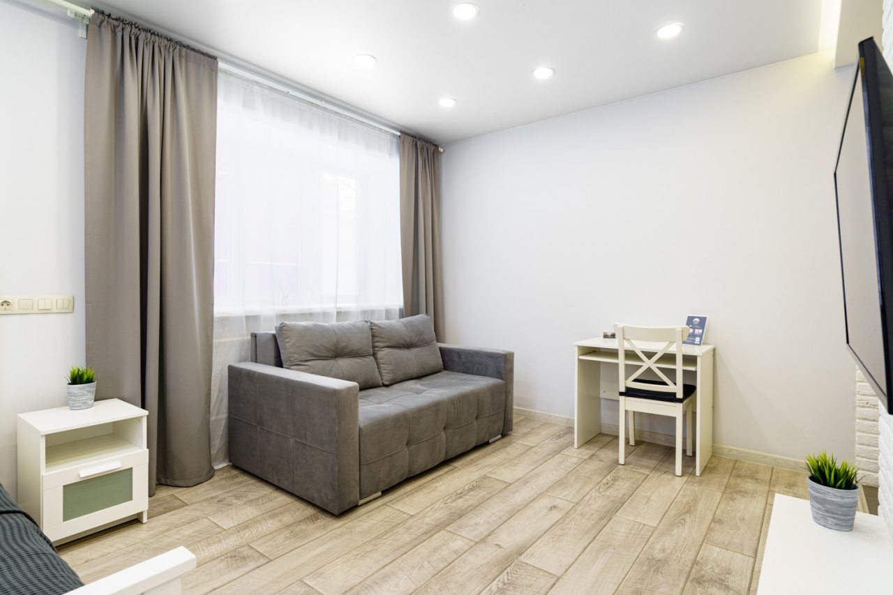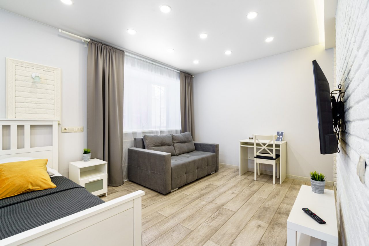 Стильные четырехместные апартаменты оснащены современной мебелью и техникой: большая двуспальная кровать, раскладной диван, рабочий стол, стиральная машина, телевизор, беспроводной интернет.