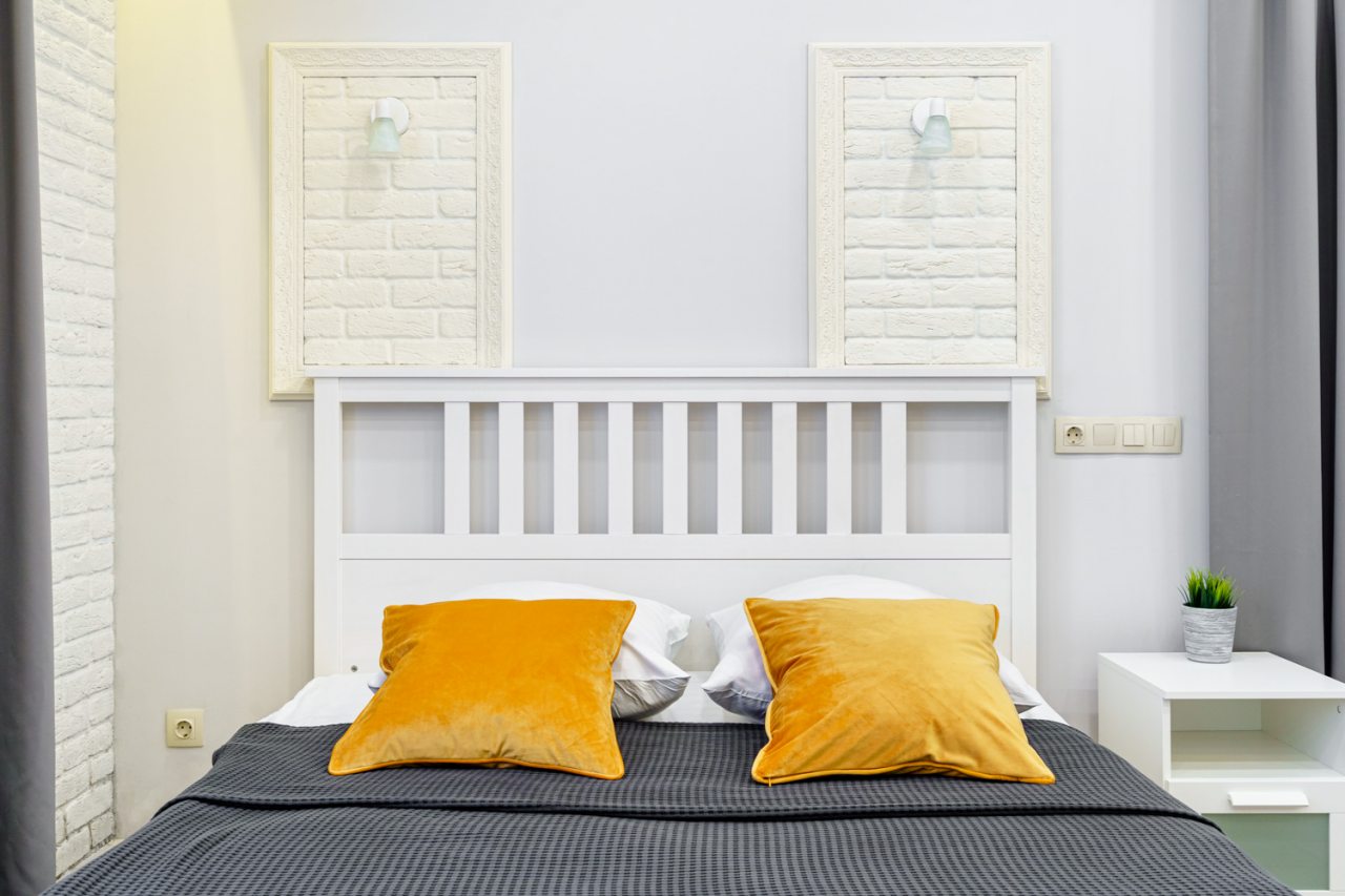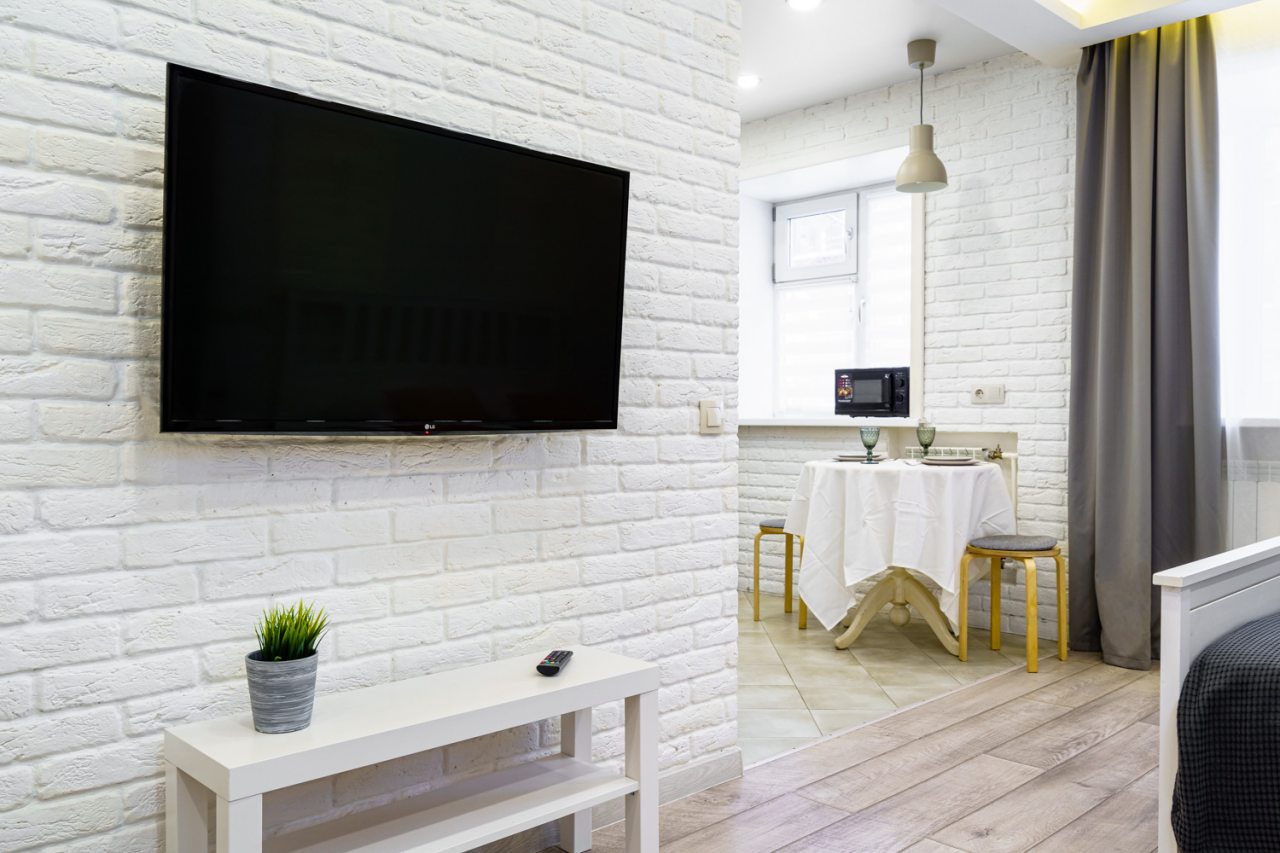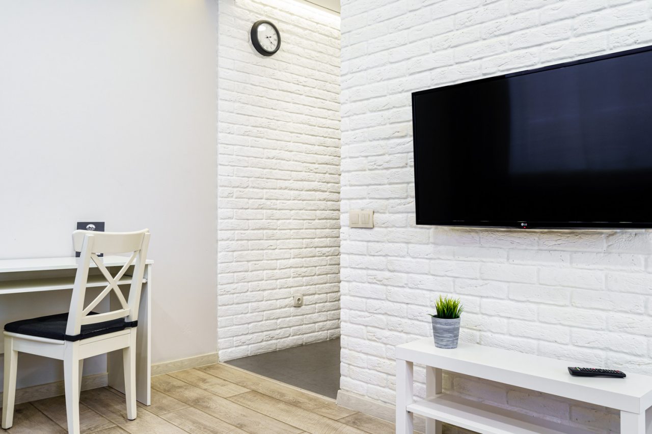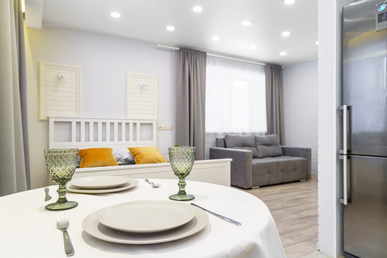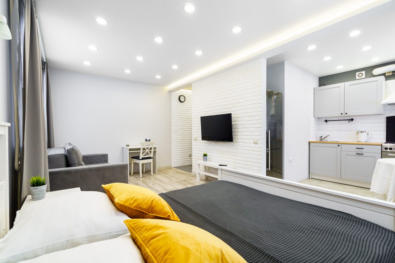 Стильные четырехместные апартаменты оснащены современной мебелью и техникой: большая двуспальная кровать, раскладной диван, рабочий стол, стиральная машина, телевизор, беспроводной интернет.